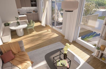 Die sorgfältig geplanten Eigentumswohnungen und Townhouses bieten mit ihren vielfältigen Grundrissen und Wohnungsgrößen für jede Lebensphase die ideale Wohnlösung. Ein behagliches Wohnambiente erzeugen die edlen Eichenparkettböden sowie die hochwertige Sanitärausstattung in den Bädern. Die Raumtemperatur lässt sich bequem über die Fußbodenheizung, die durch Fernwärme betrieben wird, sowie über die elektrisch bedienbaren Raffstores oder Rollläden regulieren. In den Dachgeschosswohnungen sorgen zusätzlich installierte Klimaanlagen dafür, dass es auch im Sommer angenehm kühl bleibt. Jede Wohneinheit verfügt über eine eigene private Freifläche, die die Wohnräume nach außen erweitert und einen idealen Rückzugsort für Erholung und Entspannung bietet.