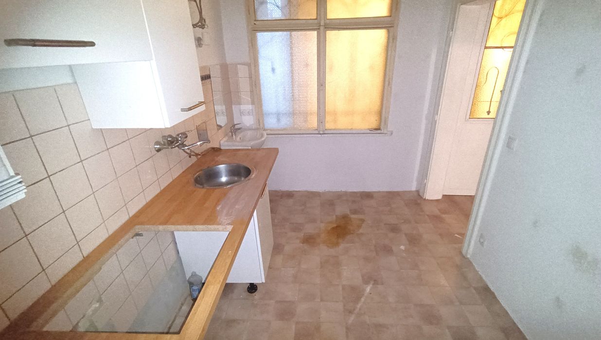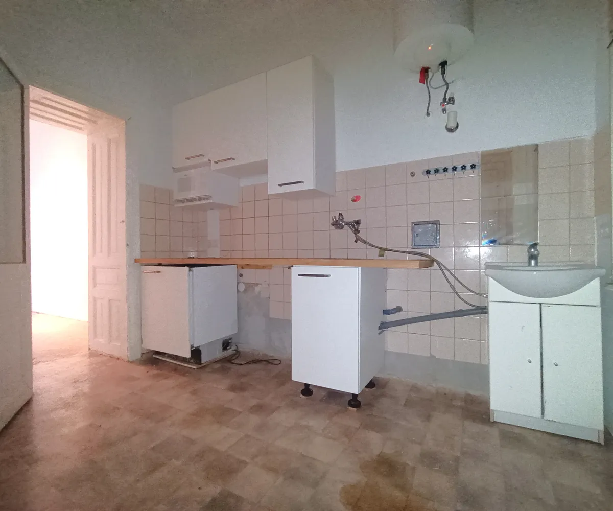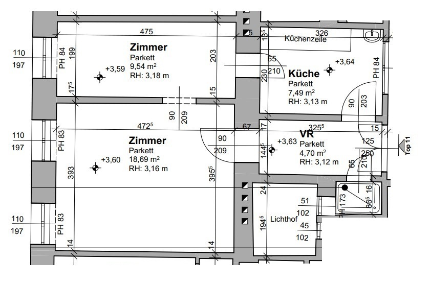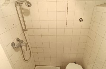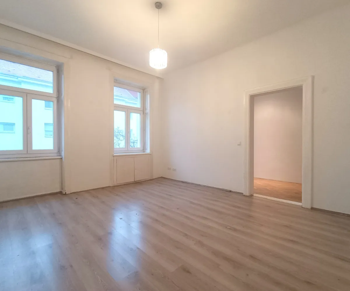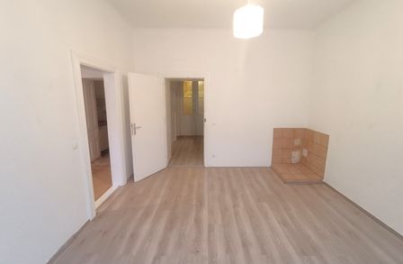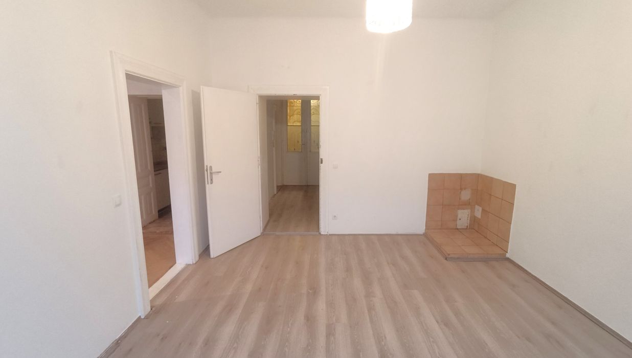 Im Vorraum der Wohnung befindet sich die separate Toilette mit Dusche . Von hier aus erreichen Sie ebenso die Küche mit einer Fläche von rund 7,49 m² und Ausrichtung in den Innenhof. Das Wohnzimmer verfügt über eine Fläche von rund 18,69 m² . An das Wohnzimmer angrenzend befindet sich das Schlafzimmer mit einer Fläche von rund 9,54 m².