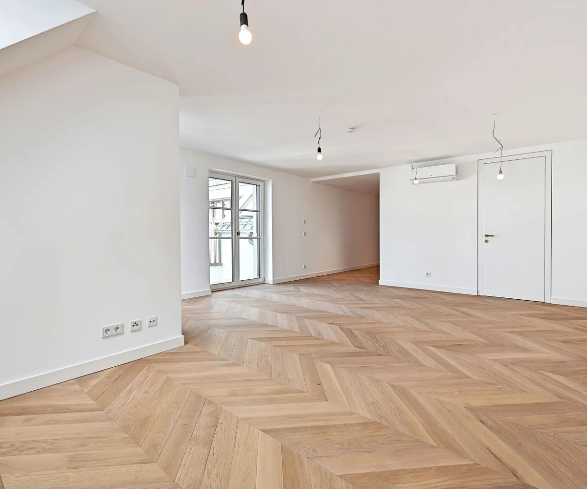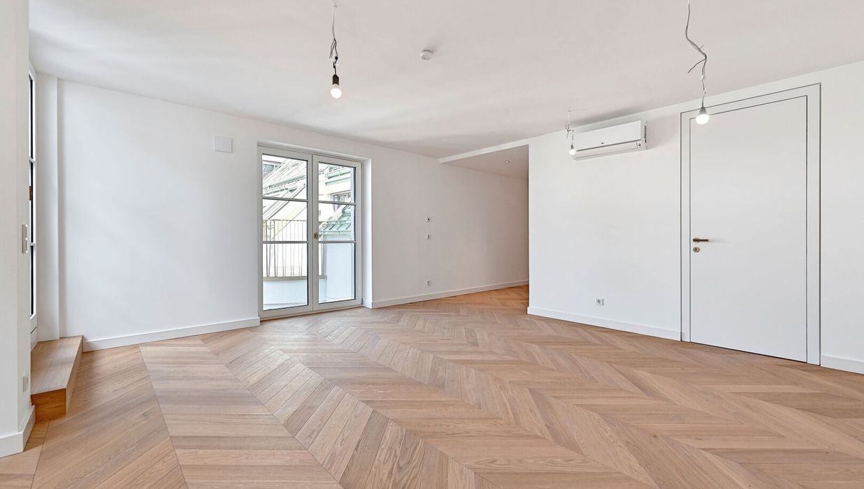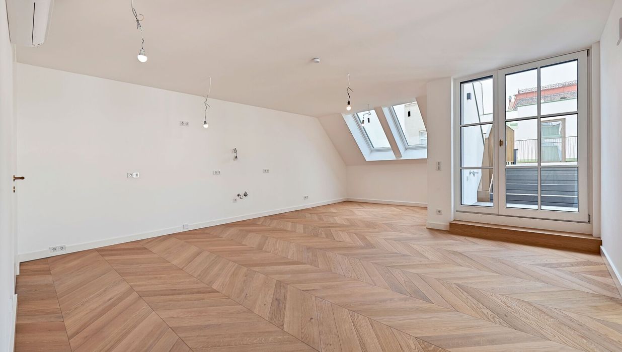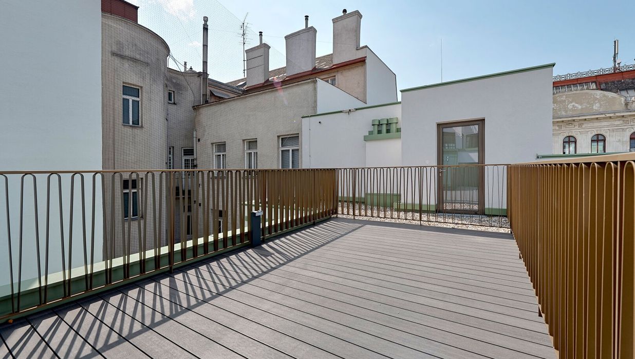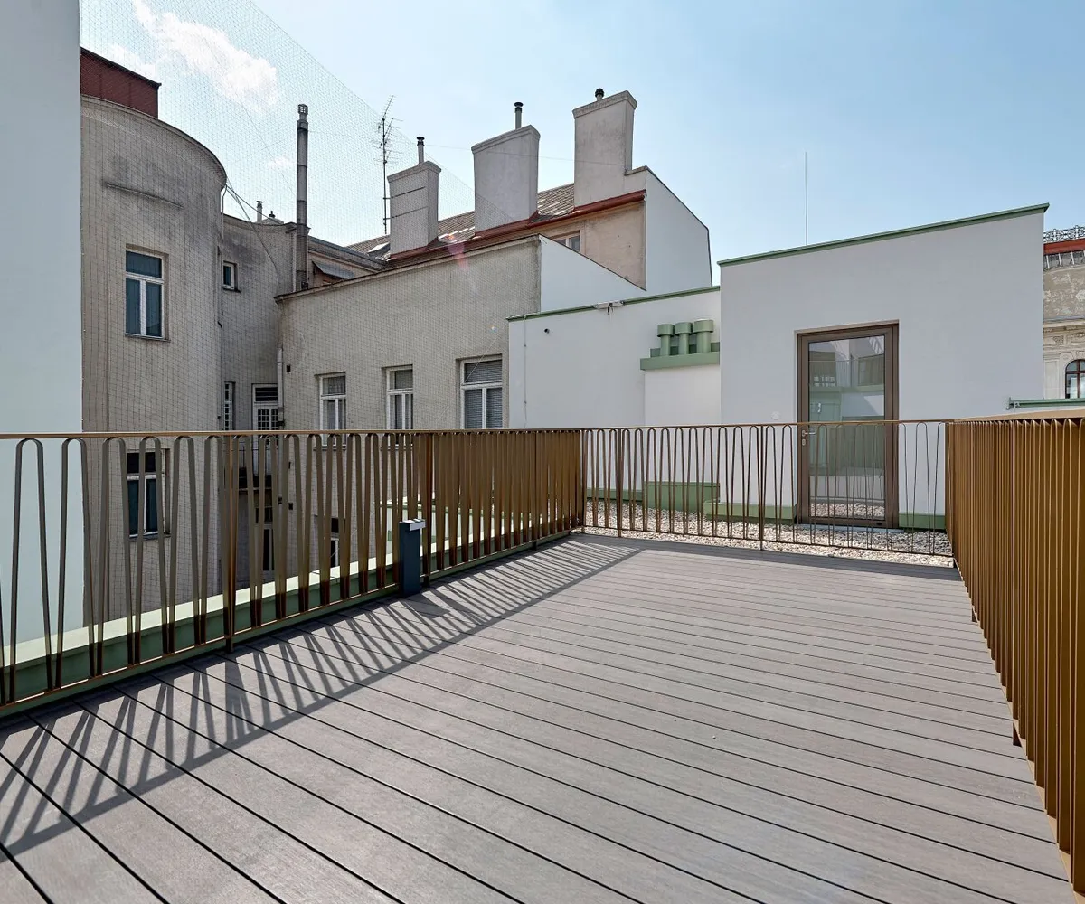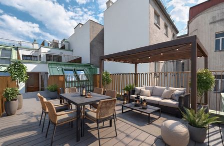 Der hofseitige 2-Zimmer-Erstbezug befindet sich im 1. Dachgeschoß (entspricht dem 5. Obergeschoß) und verfügt über ca. 78 qm Wohnfläche sowie zwei Terrassen im Gesamtausmaß von ca. 41 qm.