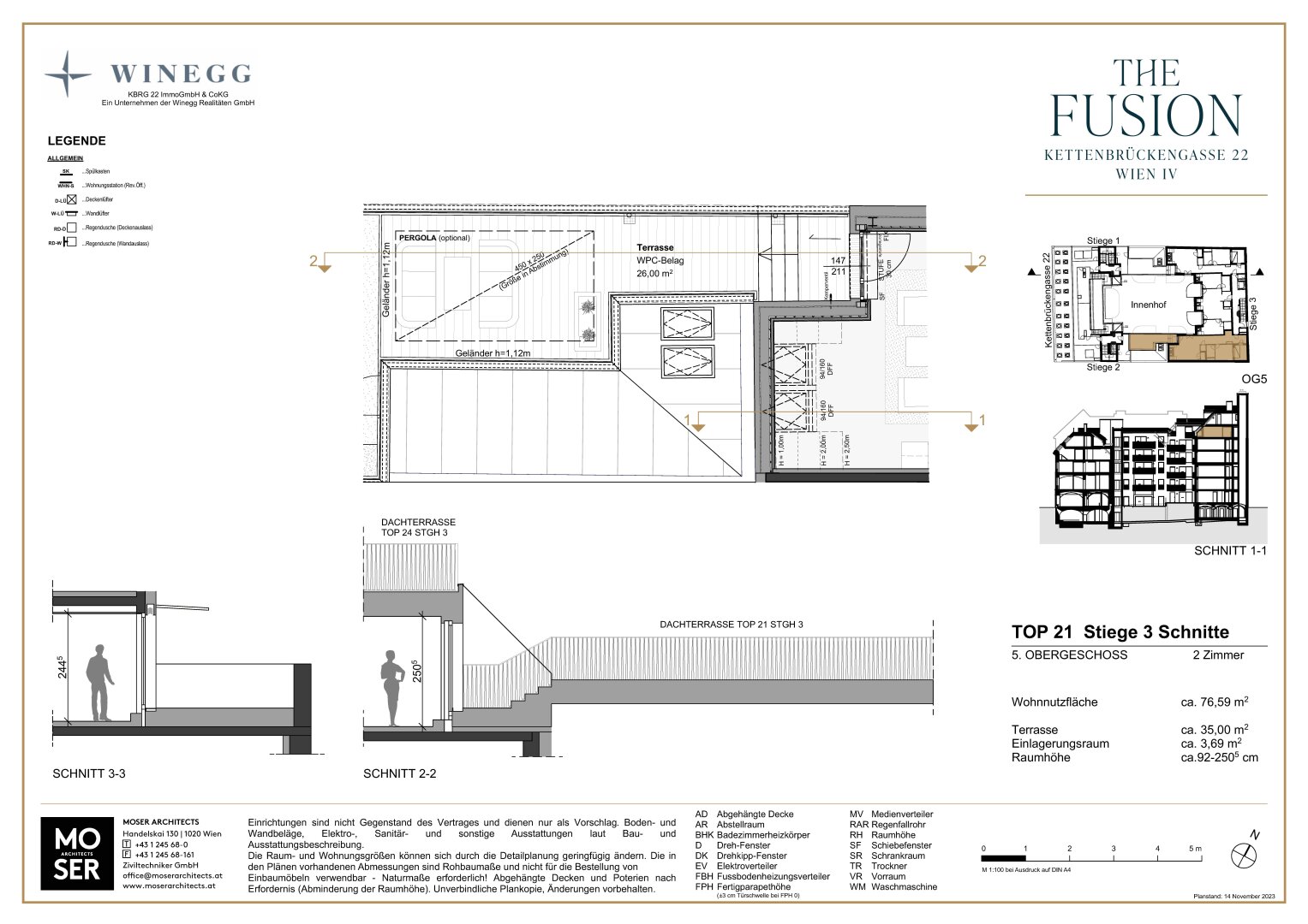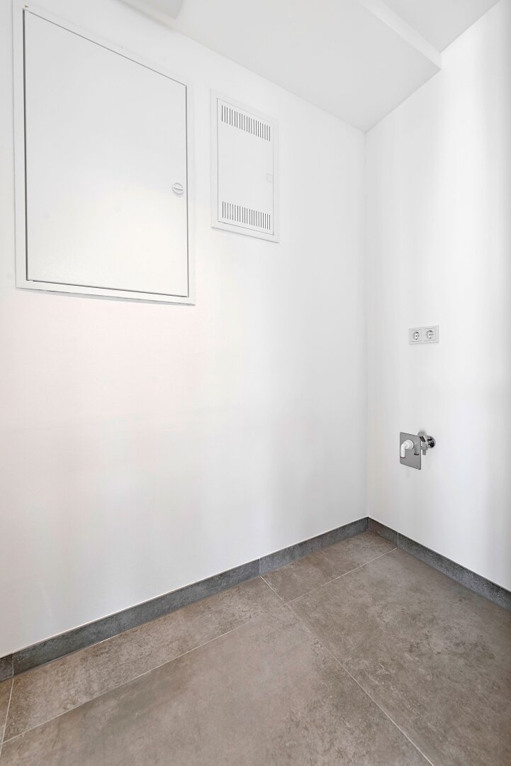 Über den Vorraum sind die Wohnküche (ca. 34 qm) mit Zugang zur hofseitigen Terrasse mit ca. 31 qm, das separate WC sowie das Schlafzimmer (ca. 14 qm) mit en suite Badezimmer zu begehen. Die zweite Terrasse im Ausmaß von ca. 9 qm ist ebenfalls vom Schlafzimmer aus zu erreichen sowie über den Vorraum. Des Weiteren verfügt die Wohneinheit über einen Abstellraum. Die Raumhöhe beträgt ca. 2,52 m.