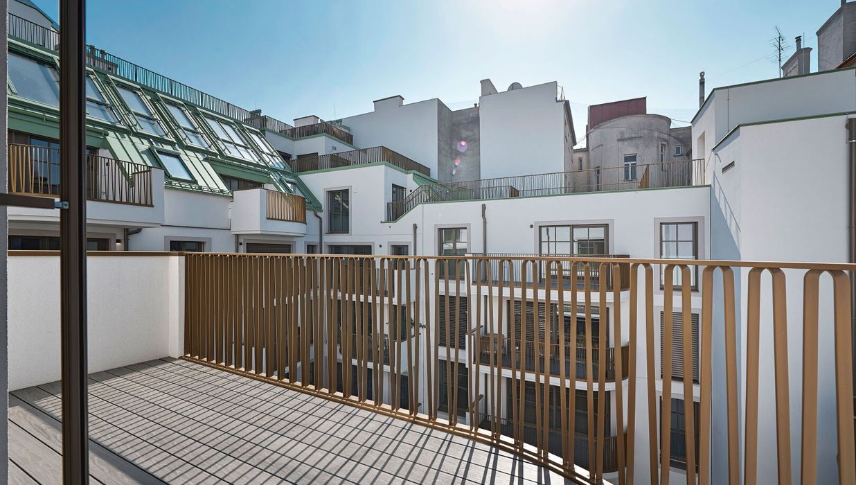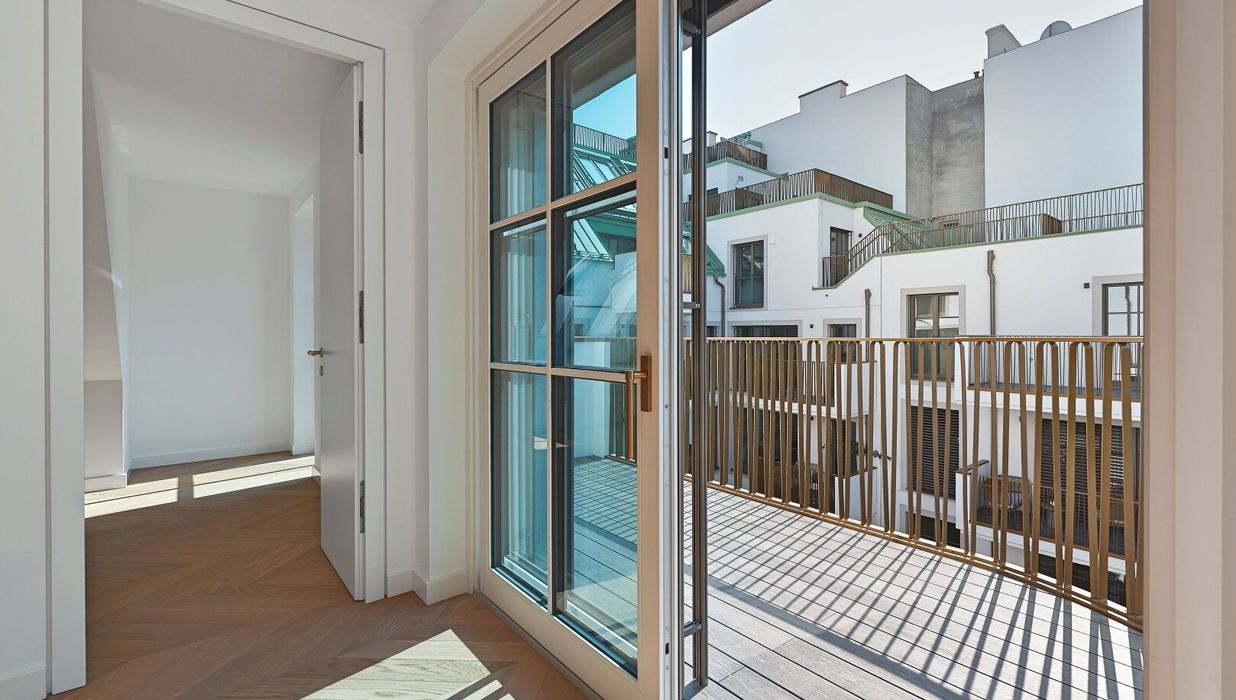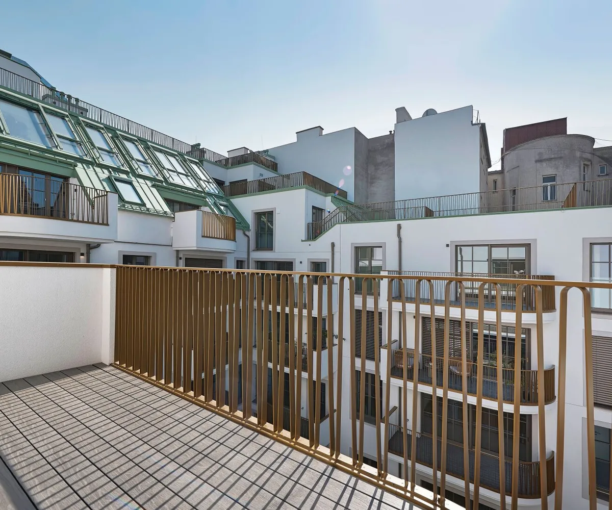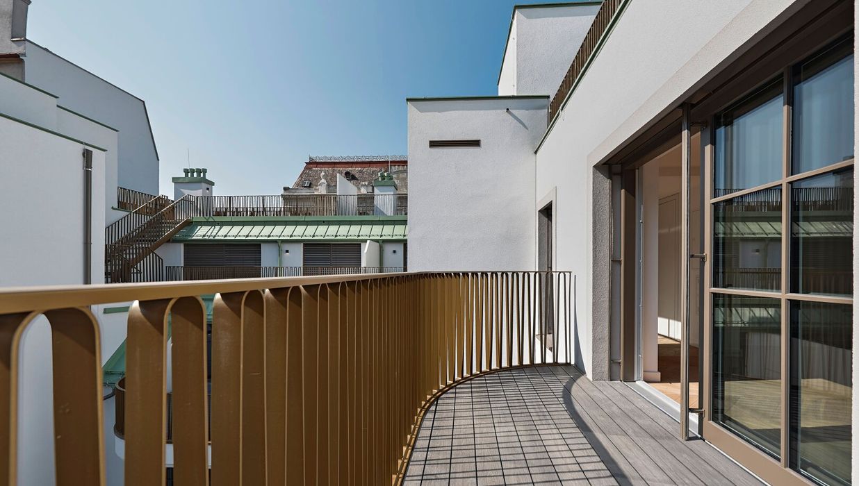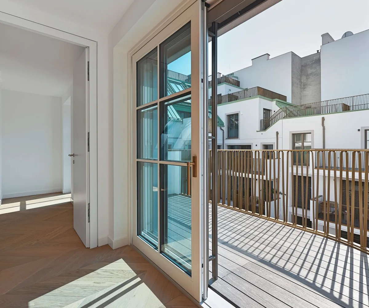 In THE FUSION by WINEGG finden Design und Funktionalität ihre schönste Entsprechung – mit dem Ziel, Sie mit allen Sinnen zu verwöhnen. Edle Materialien und ein Gespür für vollendete Inszenierung hauchen den exklusiven Wohnungen außergewöhnlichen Luxus ein. Der hochwertige Fischgrätparkett belebt jeden Wohnraum durch seine außergewöhnliche Optik und verströmt eine angenehm entschleunigende Wirkung. Großzügige Fensterfronten mit klassisch edlen Sprossen unterstreichen auf meisterhafte Weise den vornehmen Charakter des Gebäudes – innen wie außen. Dank klimatisierter Wohnräume in allen Geschoßen können Sie stets in Frische und Entspannung verweilen. Perlgoldene Stabgeländer schmücken die Freibereiche und werden zum wertvollen Designelement. Ihre besondere Eleganz ergibt sich durch sanfte Rundungen und größte handwerkliche Präzision.