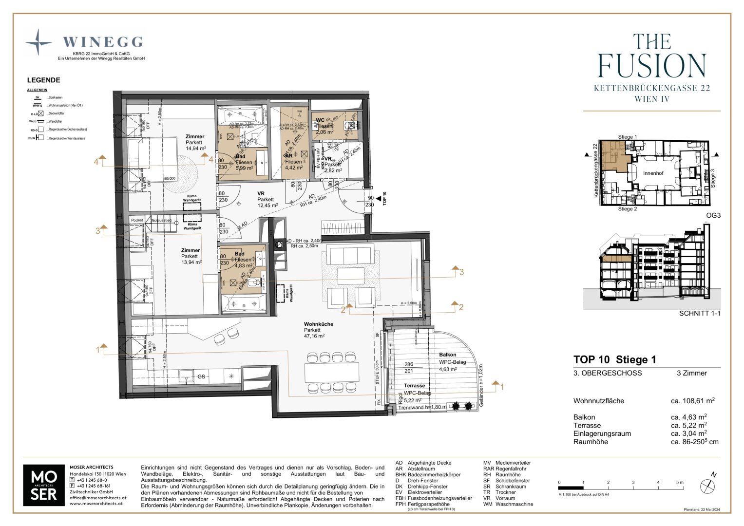 Diese großzügig geschnittene 3-Zimmer Wohnung verfügt über ca. 109 qm Wohnfläche, befindet sich im 3. Liftstock auf Stiege 1 und ist hofseitig ausgerichtet.