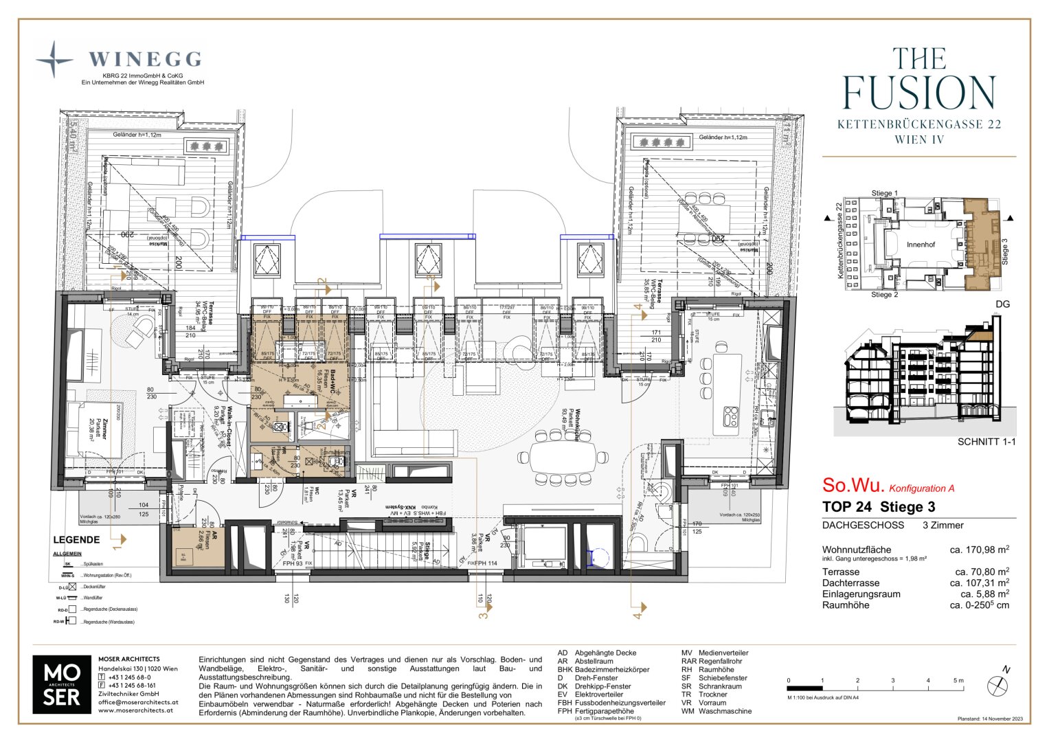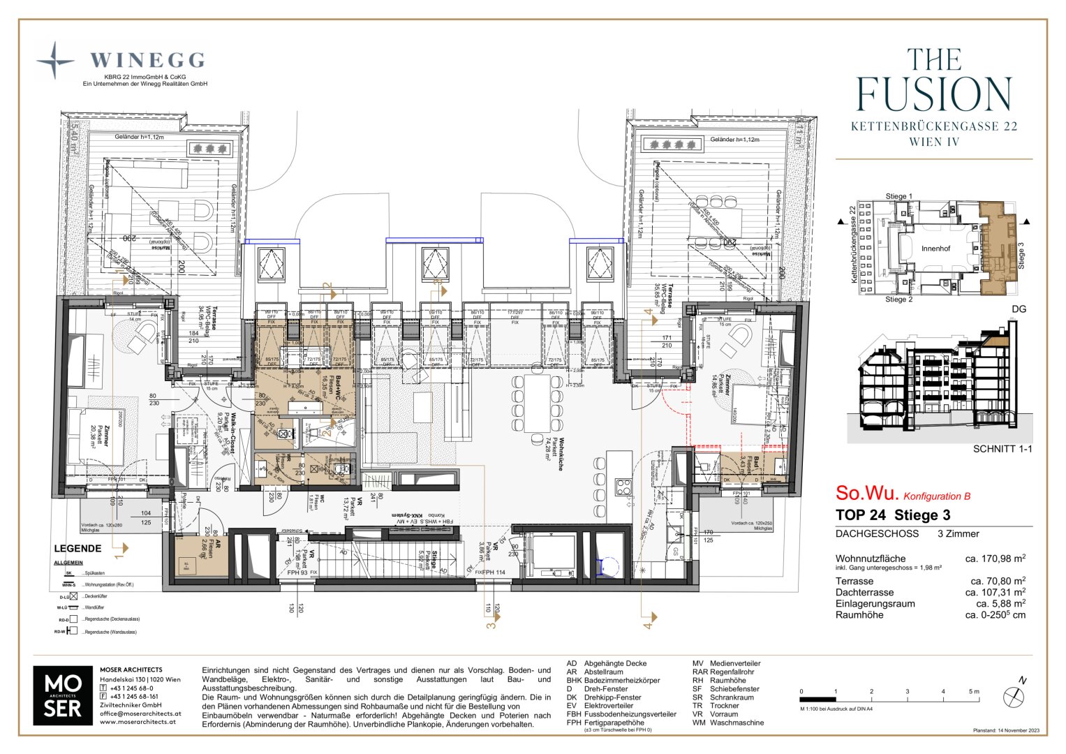Mit dem Lift gelangt man direkt in den Vorraum des Penthouses, an den die geräumige Wohnküche mit über 71 qm angrenzt. Zu beiden Seiten dieses außergewöhnlichen Dachgeschoßes befindet sich eine Terrasse mit je ca. 35 qm, welche vom Wohnraum sowie die zwei Schlafzimmer zu begehen sind. Des Weiteren bietet dieses Objekt zwei Bäder, zwei Toiletten und einen Abstellraum. Die Raumhöhe beträgt ca. 2,52 m.