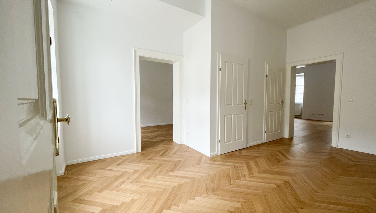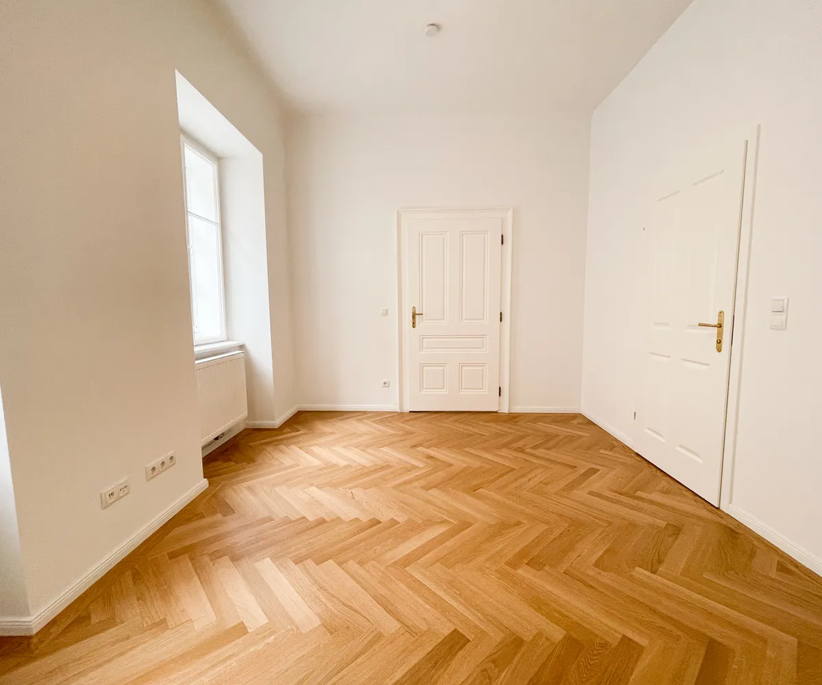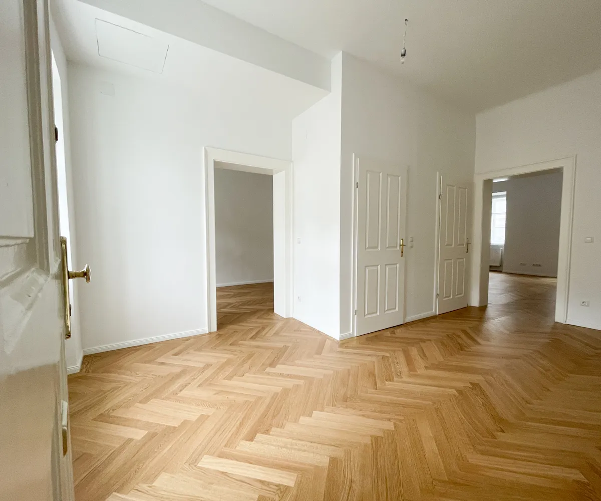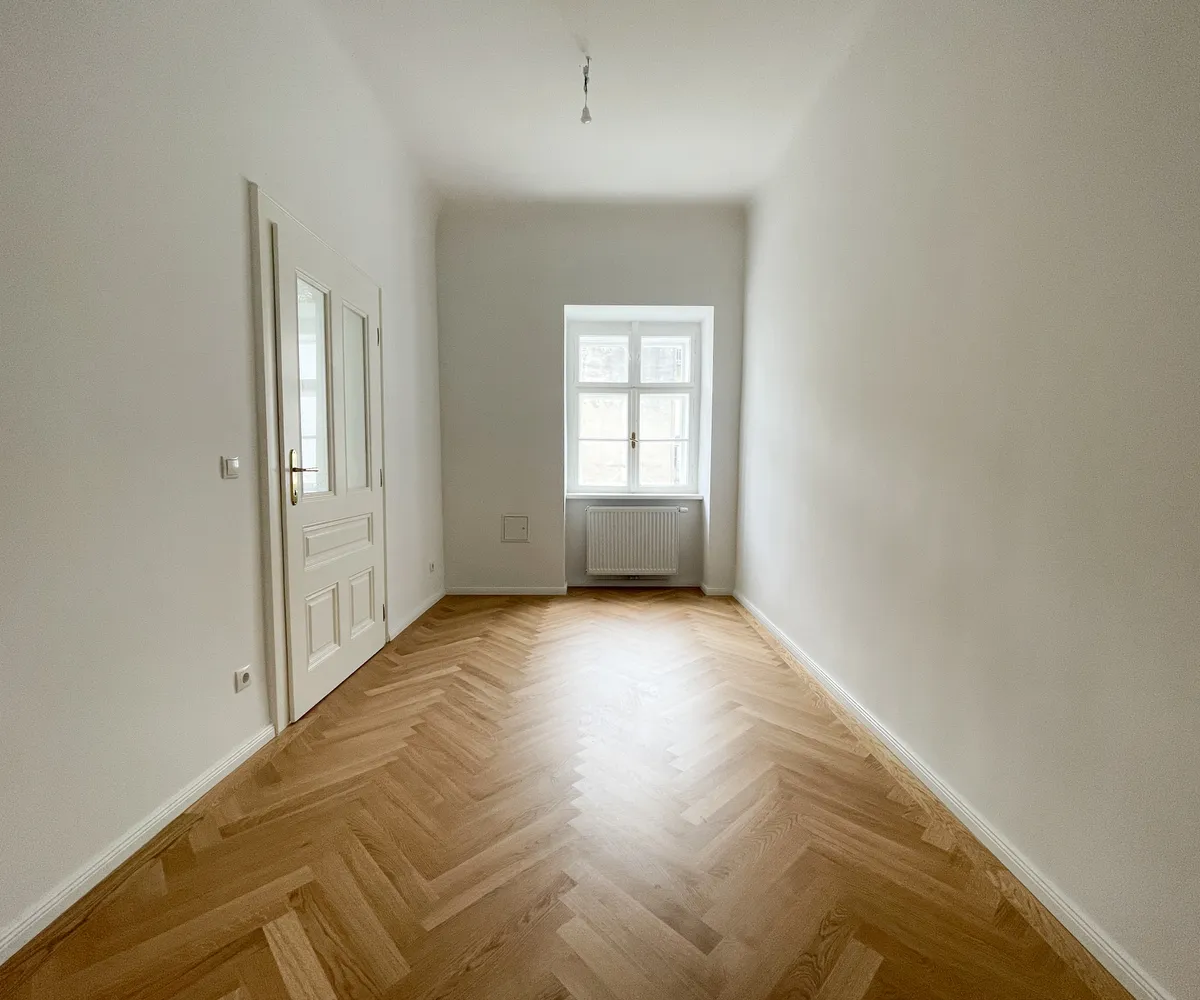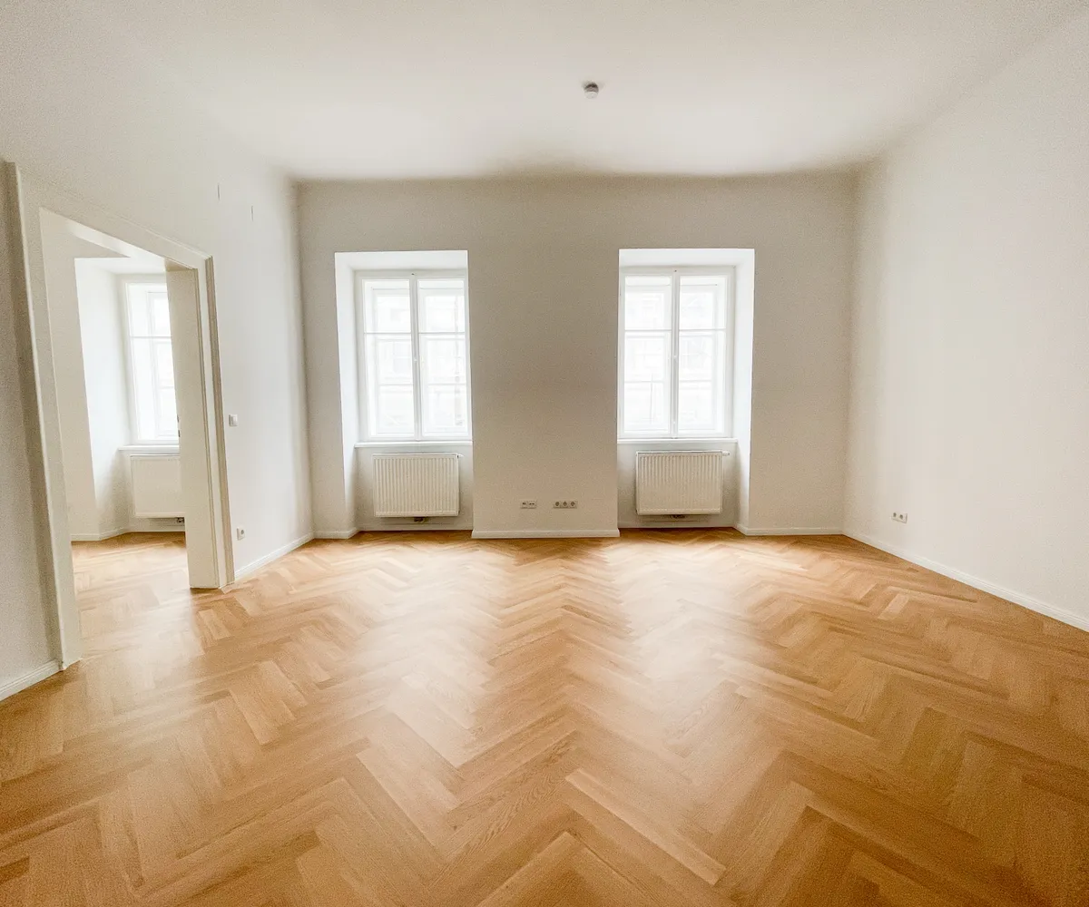 Die Wohnung bietet drei vollwertig nutzbare Zimmer , zwei Schlafzimmer (hofseitig & zur Thurngasse) sowie ein quadratisches Wohnzimmer mit ca. 25,19 m² . Die Raumhöhe von ca. 3,12 m in den Aufenthaltsräumen verleiht ein außergewöhnliches Altbau-Raumgefühl.