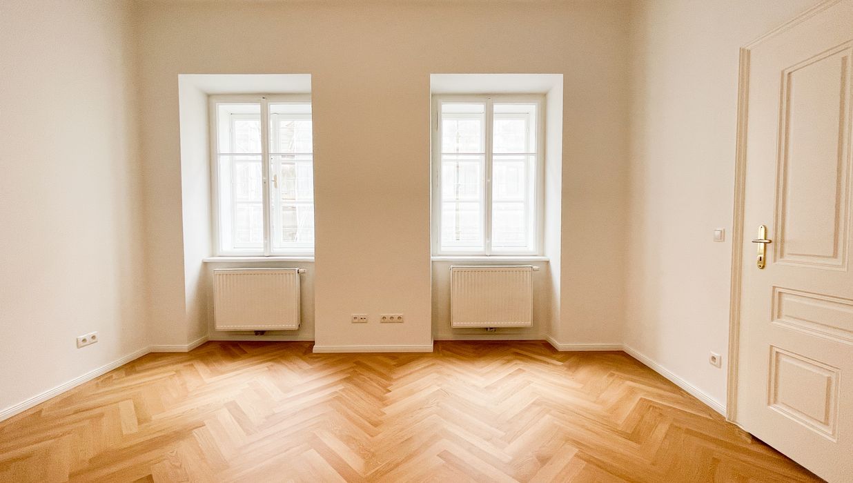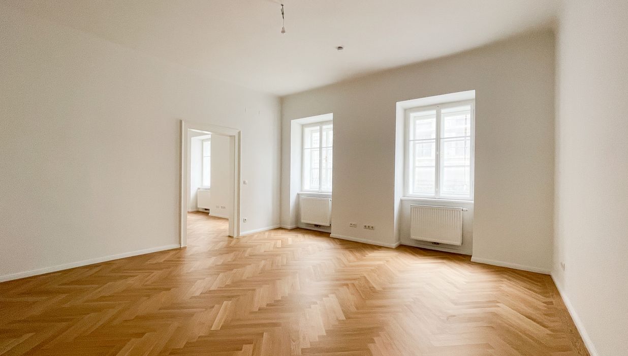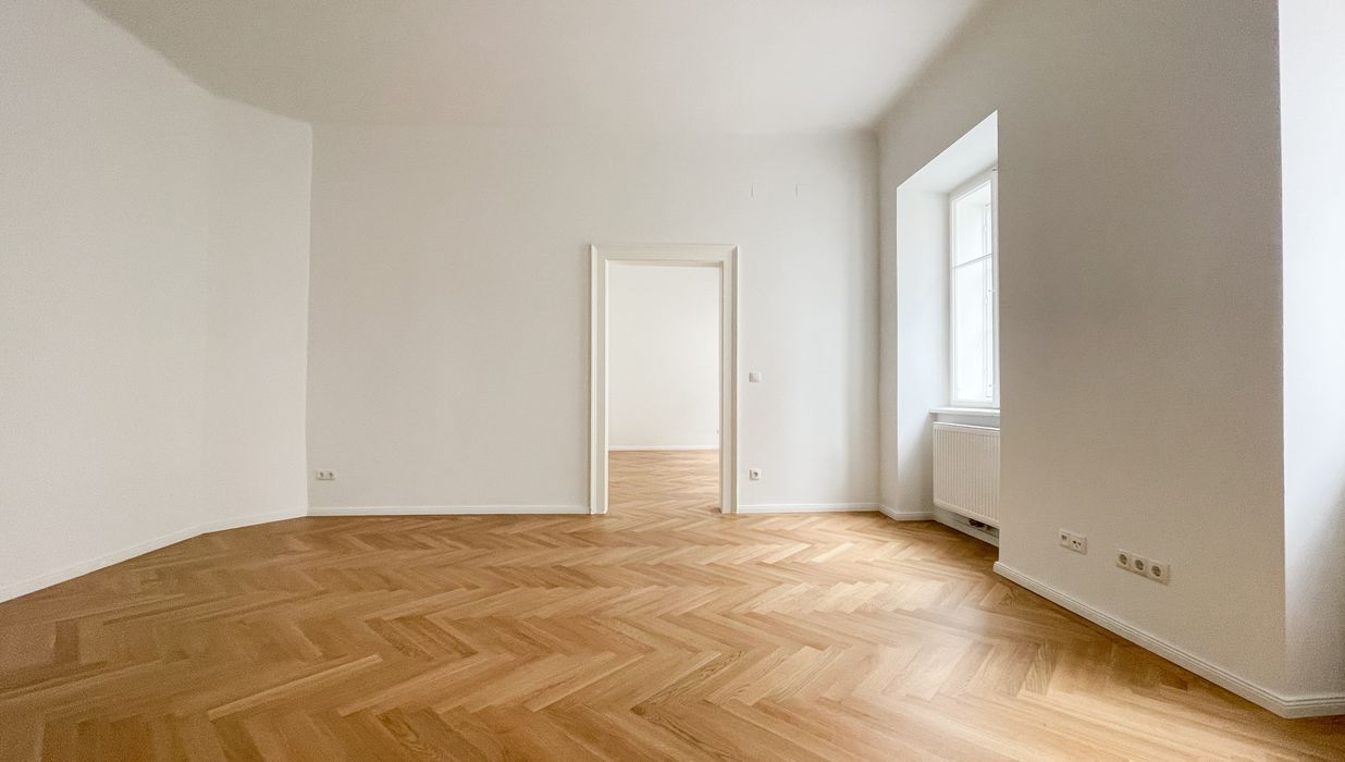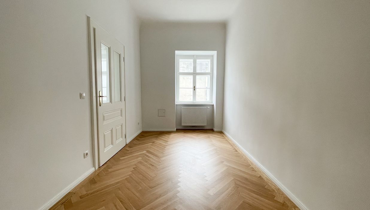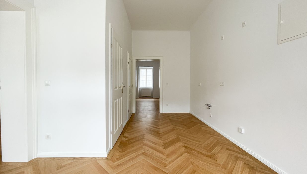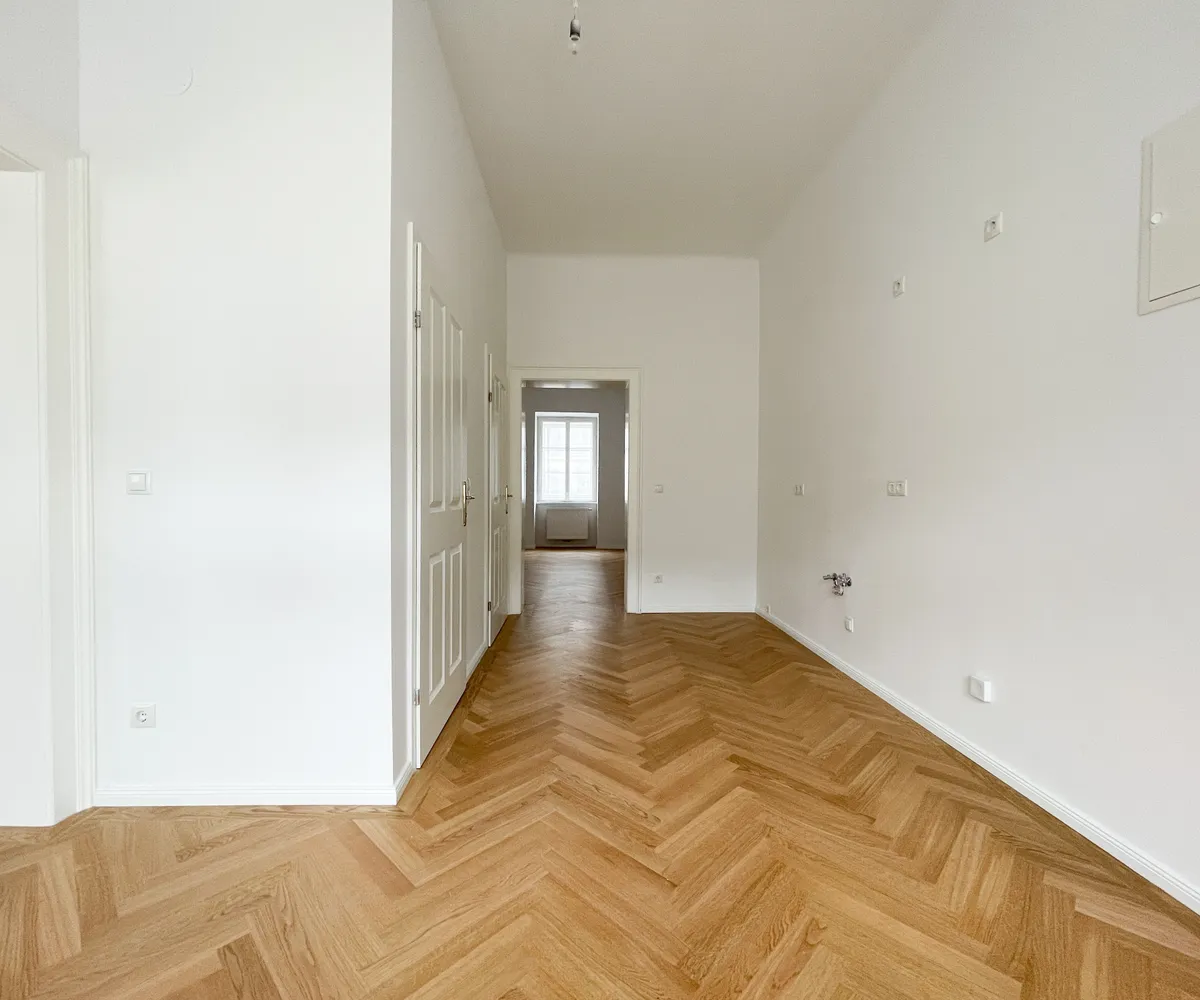 Die Wohnung bietet drei vollwertig nutzbare Zimmer , zwei Schlafzimmer (hofseitig & zur Thurngasse) sowie ein quadratisches Wohnzimmer mit ca. 25,19 m² . Die Raumhöhe von ca. 3,12 m in den Aufenthaltsräumen verleiht ein außergewöhnliches Altbau-Raumgefühl.