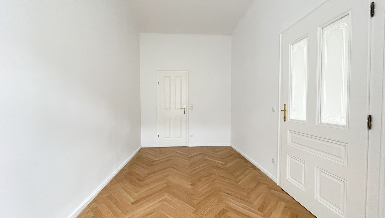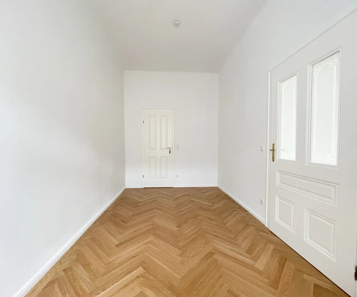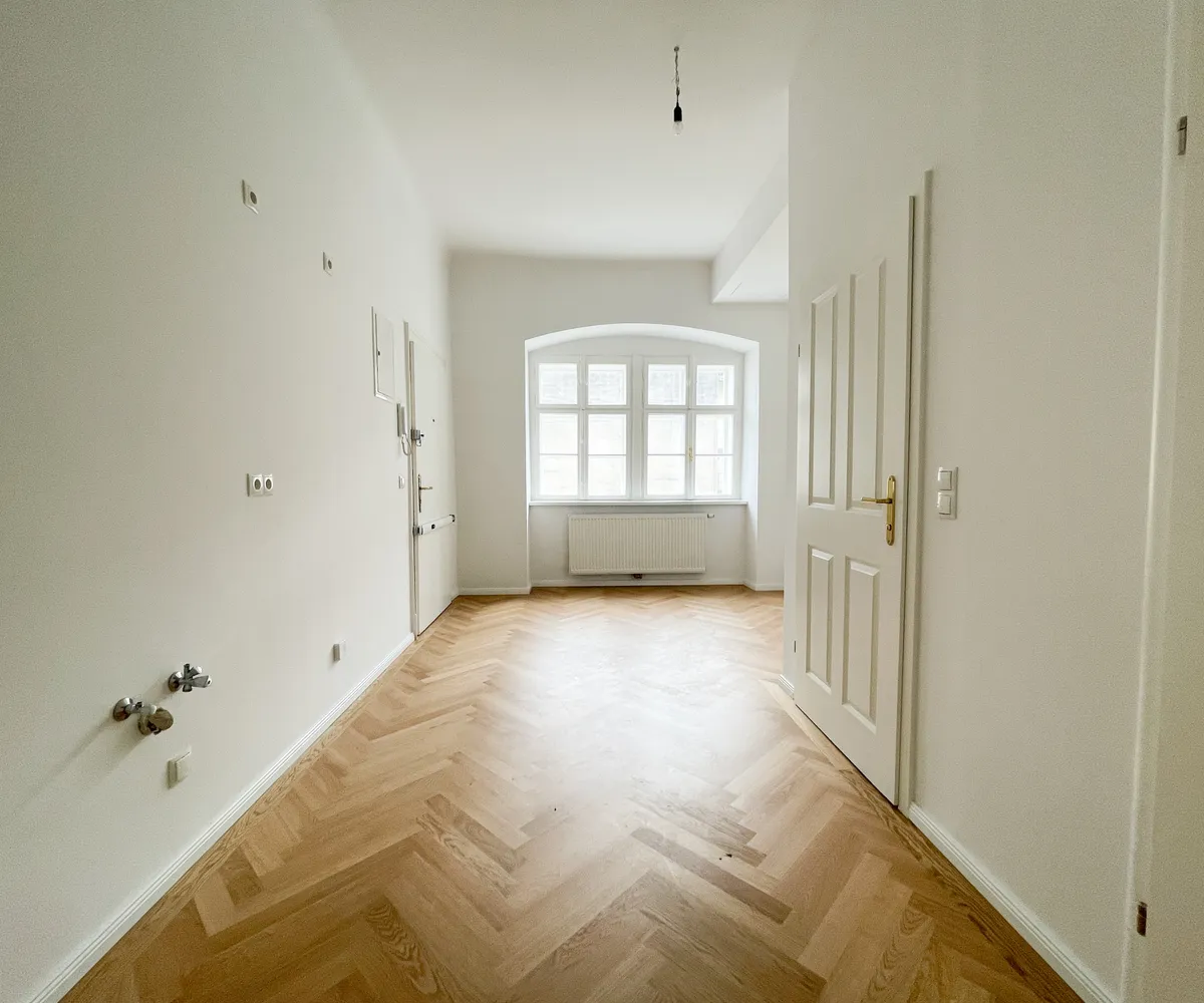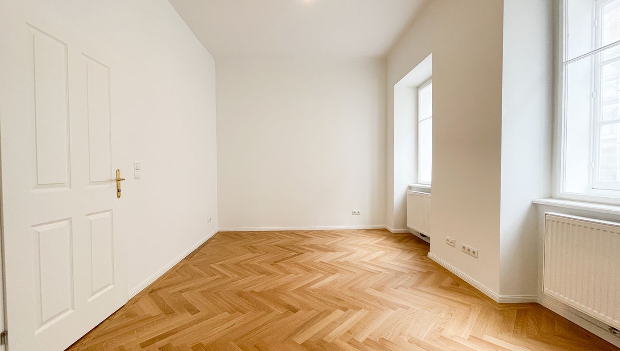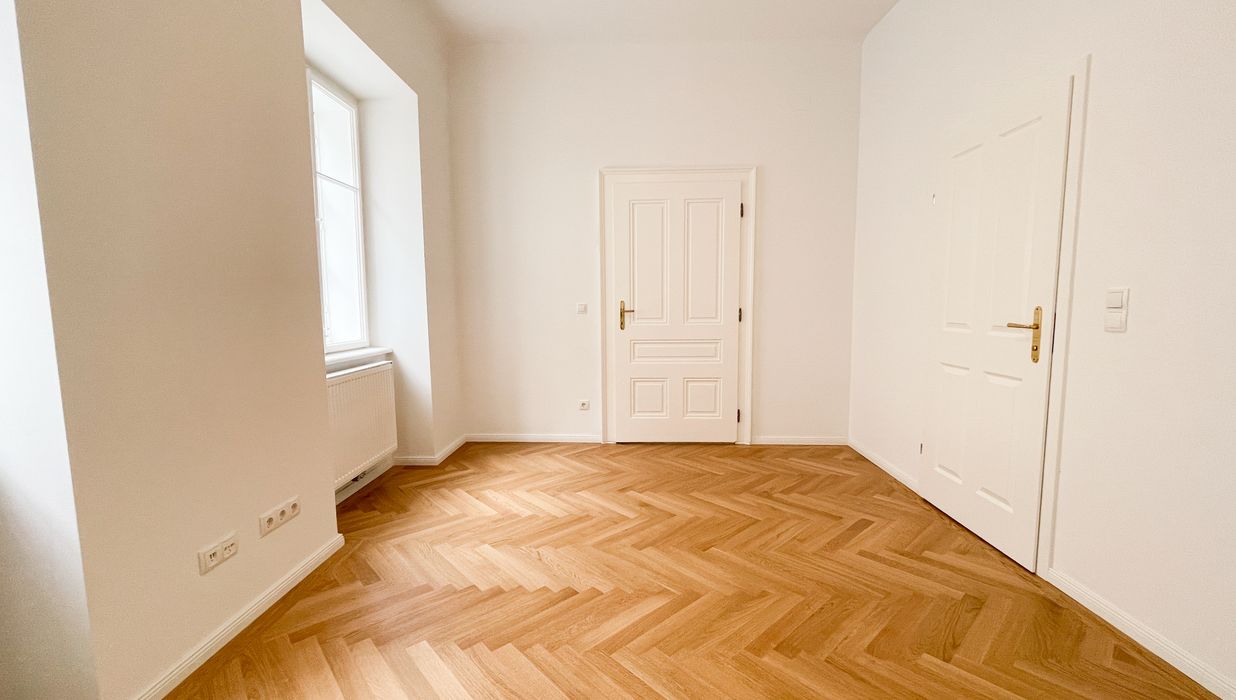 Die Wohnung bietet drei vollwertig nutzbare Zimmer , zwei Schlafzimmer (hofseitig & zur Thurngasse) sowie ein quadratisches Wohnzimmer mit ca. 25,19 m² . Die Raumhöhe von ca. 3,12 m in den Aufenthaltsräumen verleiht ein außergewöhnliches Altbau-Raumgefühl.