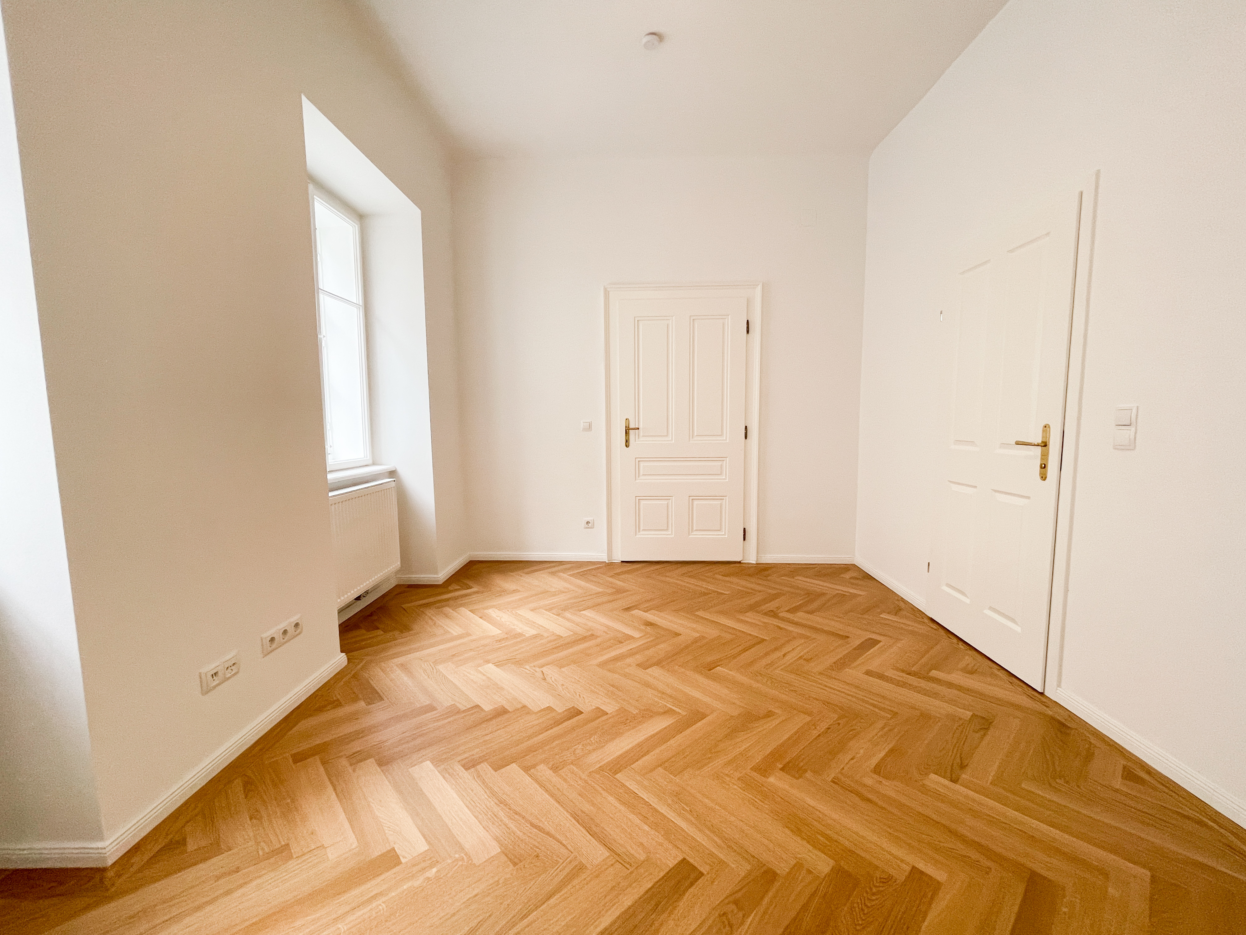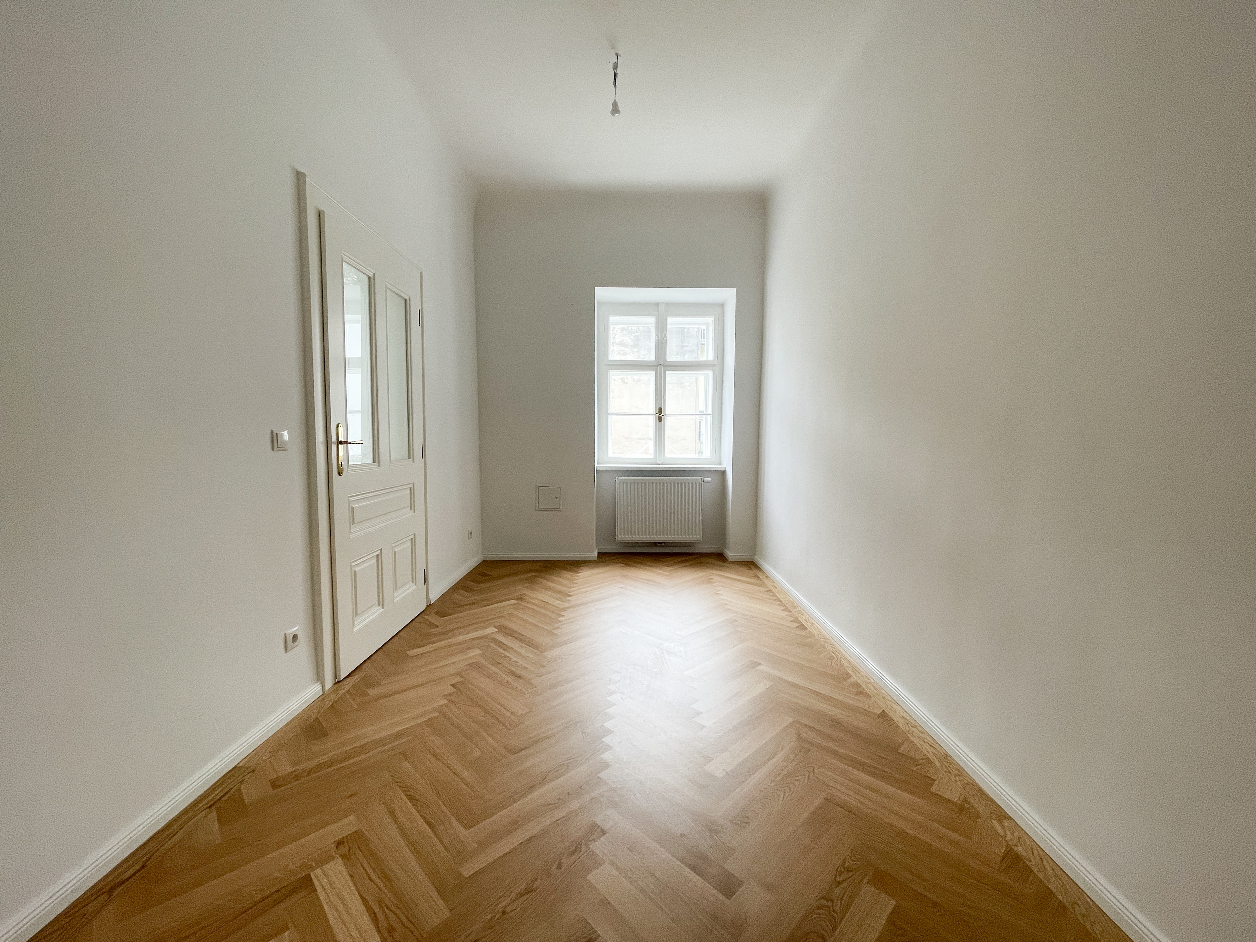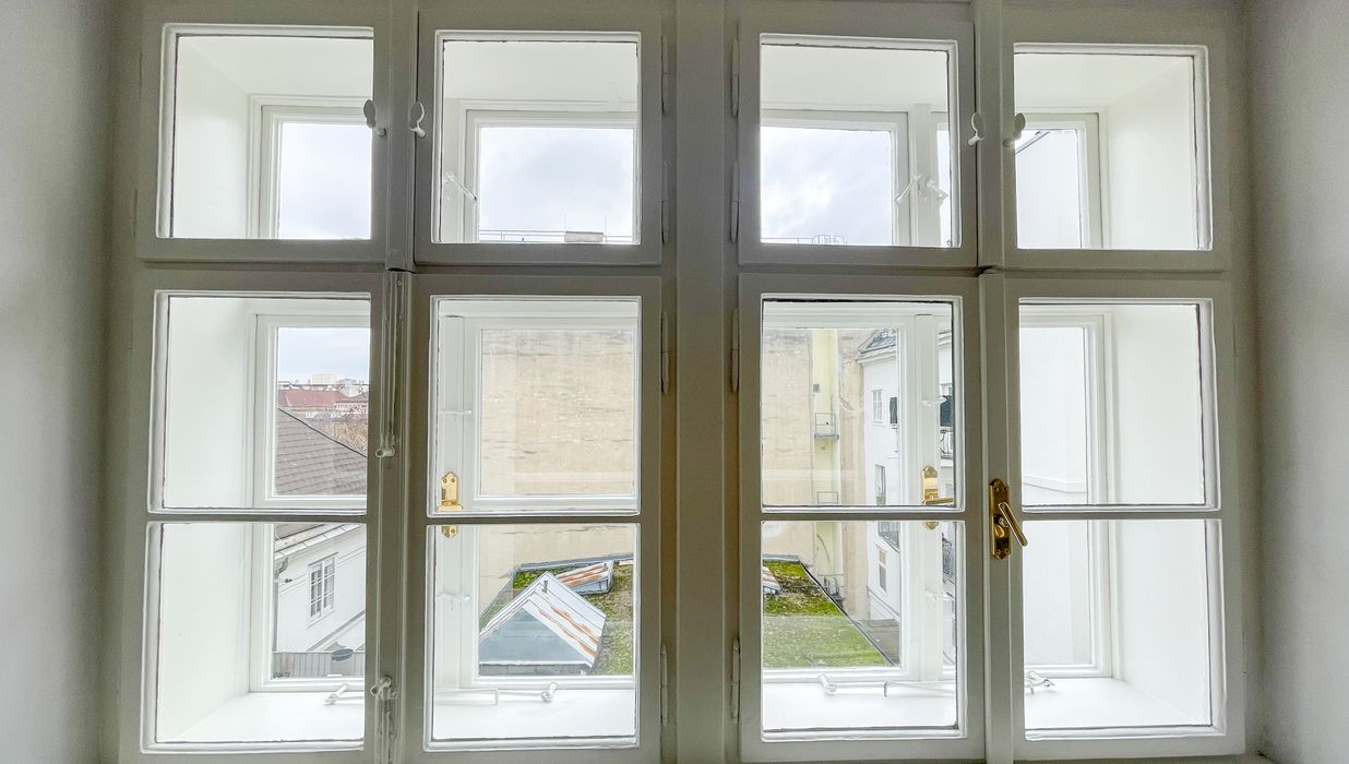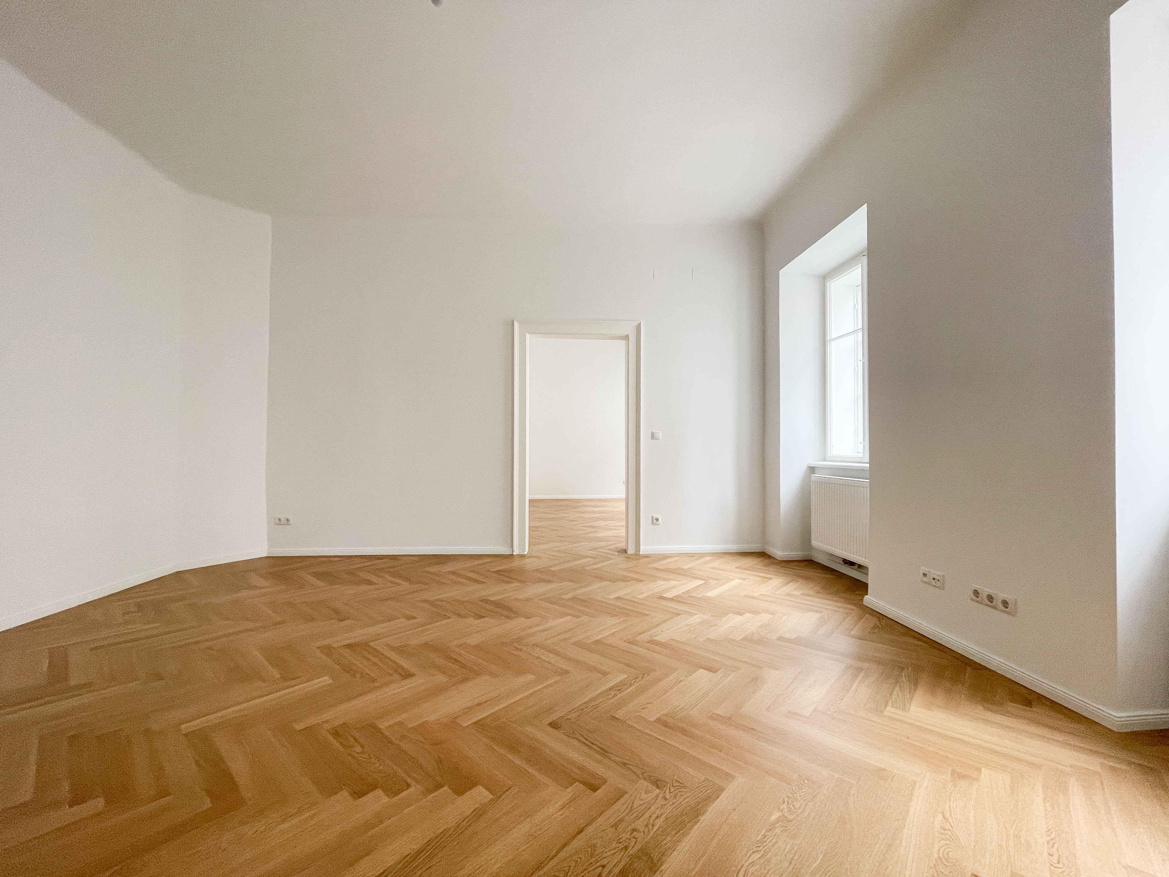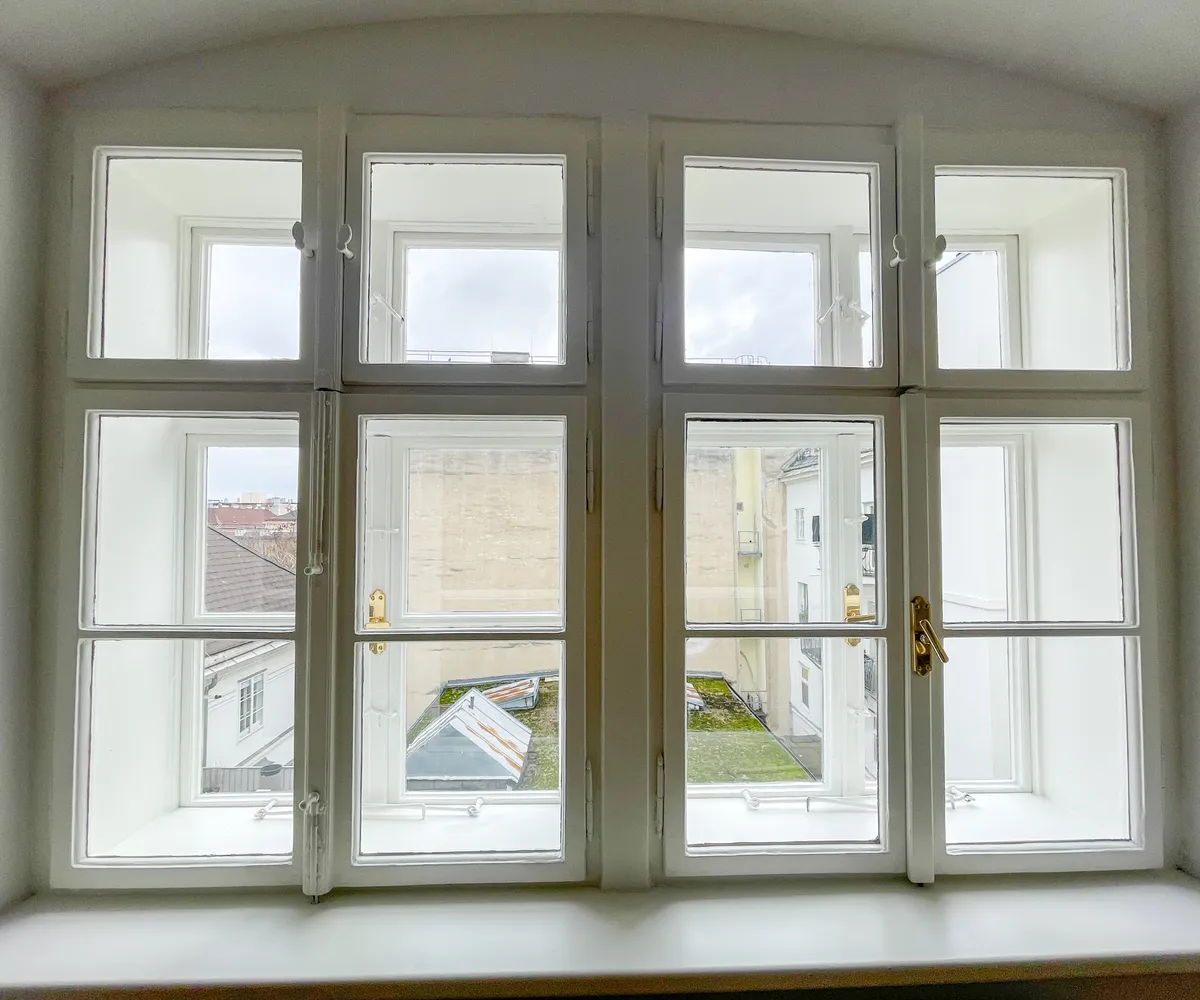 Die Wohnung bietet drei vollwertig nutzbare Zimmer , zwei Schlafzimmer (hofseitig & zur Thurngasse) sowie ein quadratisches Wohnzimmer mit ca. 25,19 m² . Die Raumhöhe von ca. 3,12 m in den Aufenthaltsräumen verleiht ein außergewöhnliches Altbau-Raumgefühl.