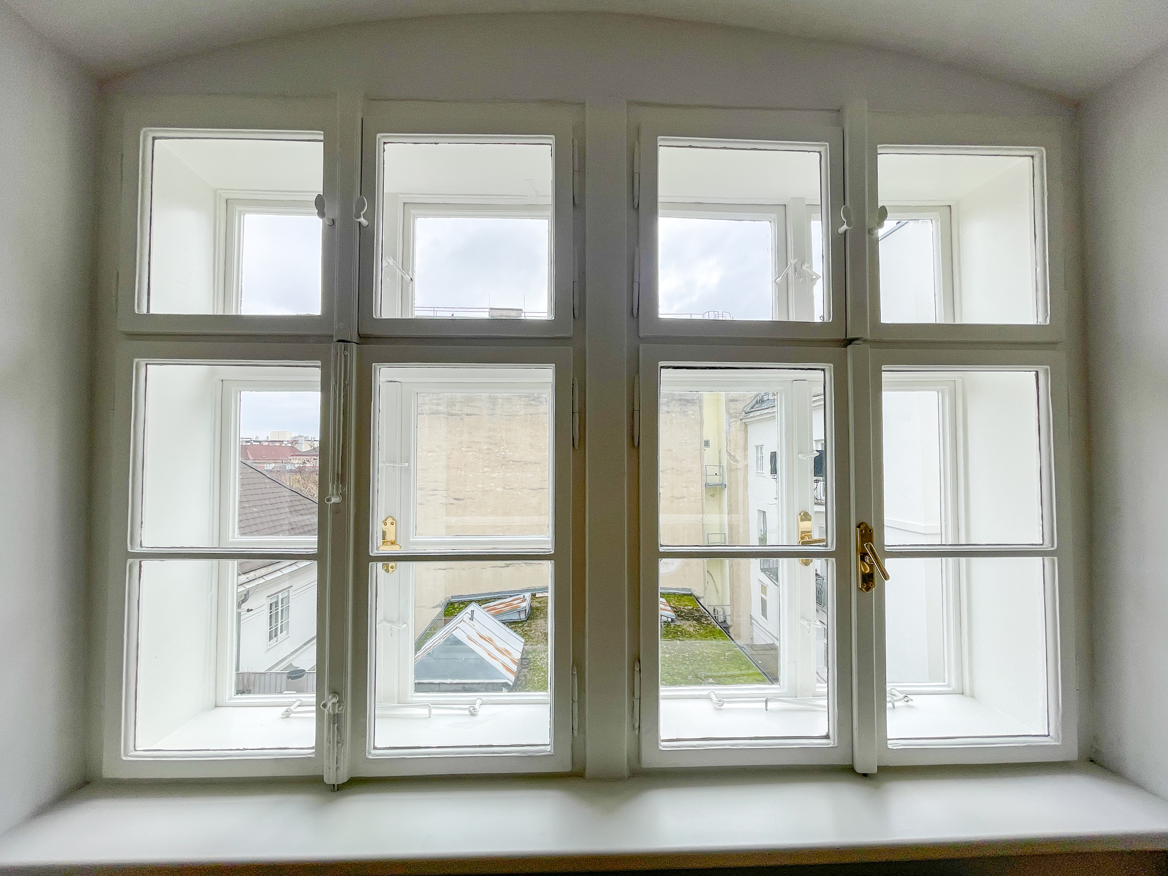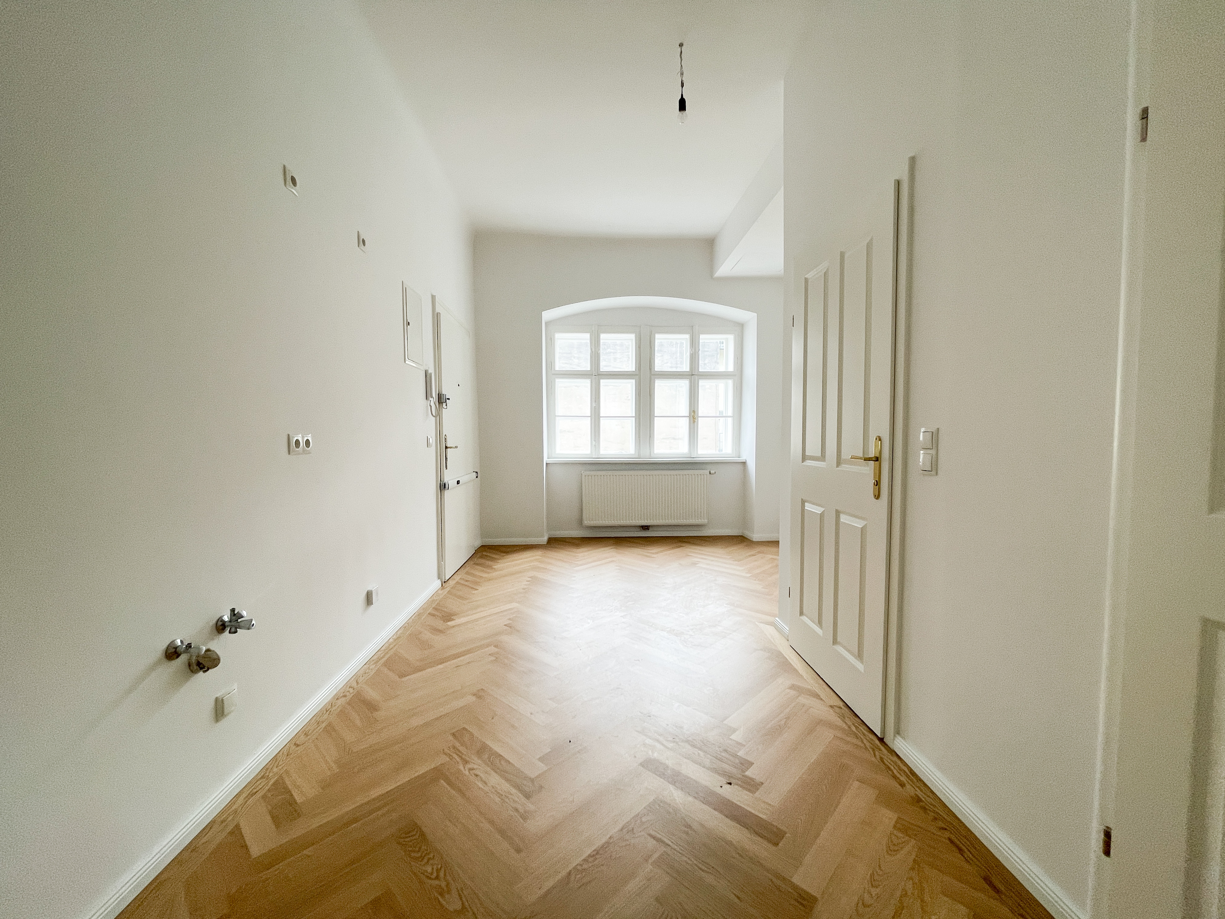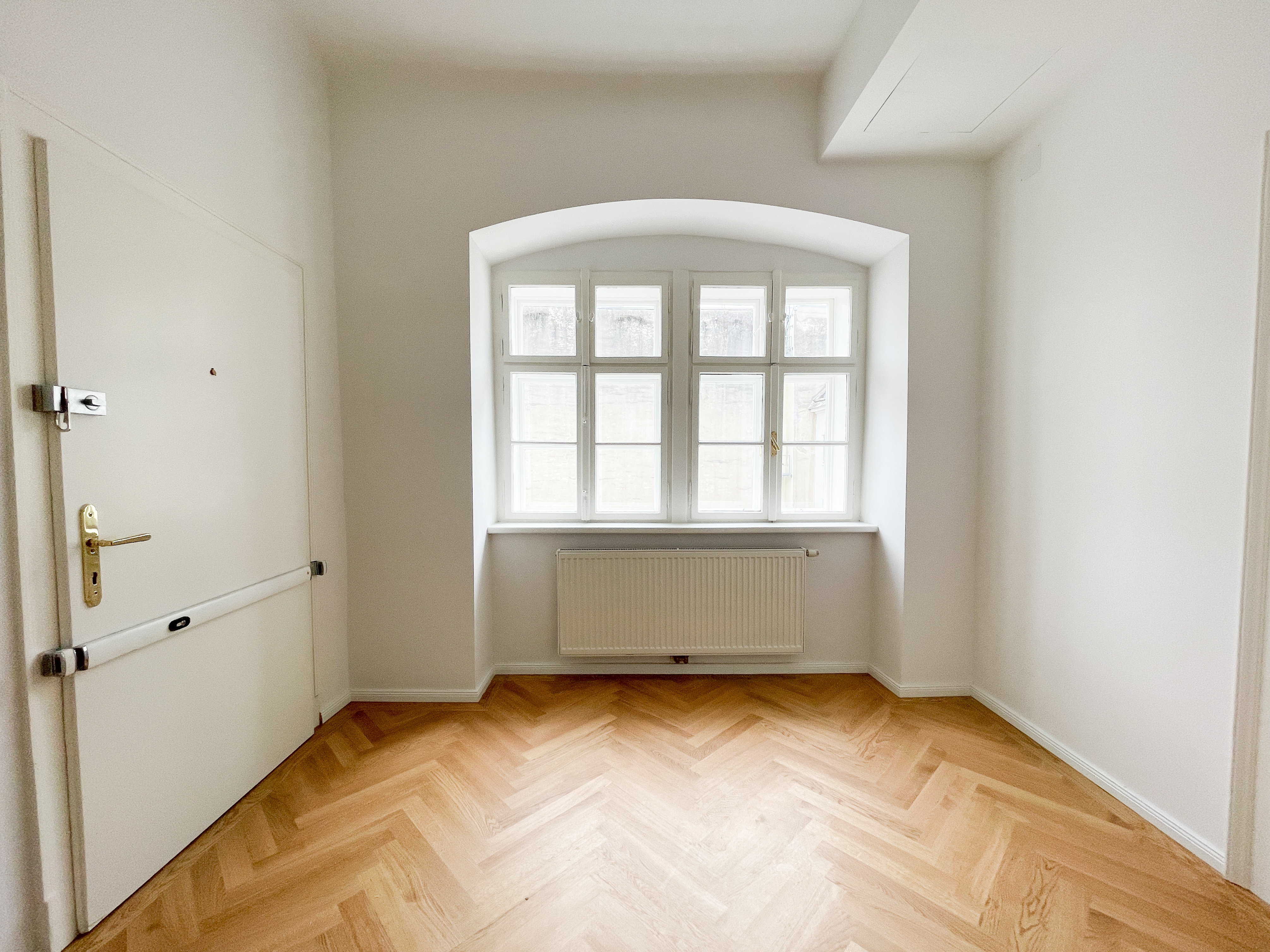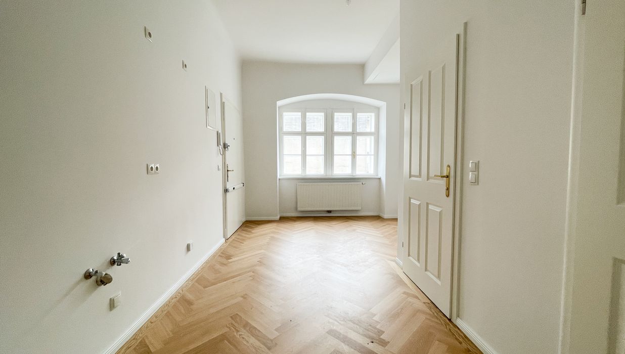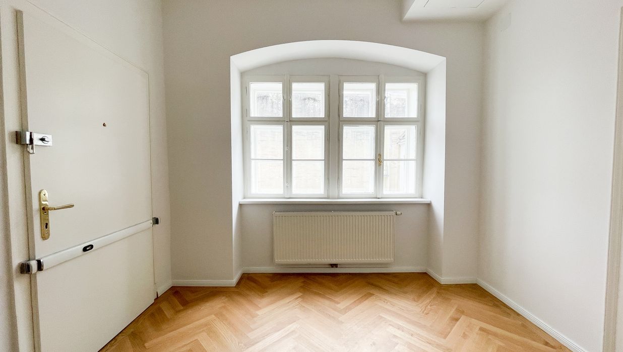 Die Wohnung bietet drei vollwertig nutzbare Zimmer , zwei Schlafzimmer (hofseitig & zur Thurngasse) sowie ein quadratisches Wohnzimmer mit ca. 25,19 m² . Die Raumhöhe von ca. 3,12 m in den Aufenthaltsräumen verleiht ein außergewöhnliches Altbau-Raumgefühl.