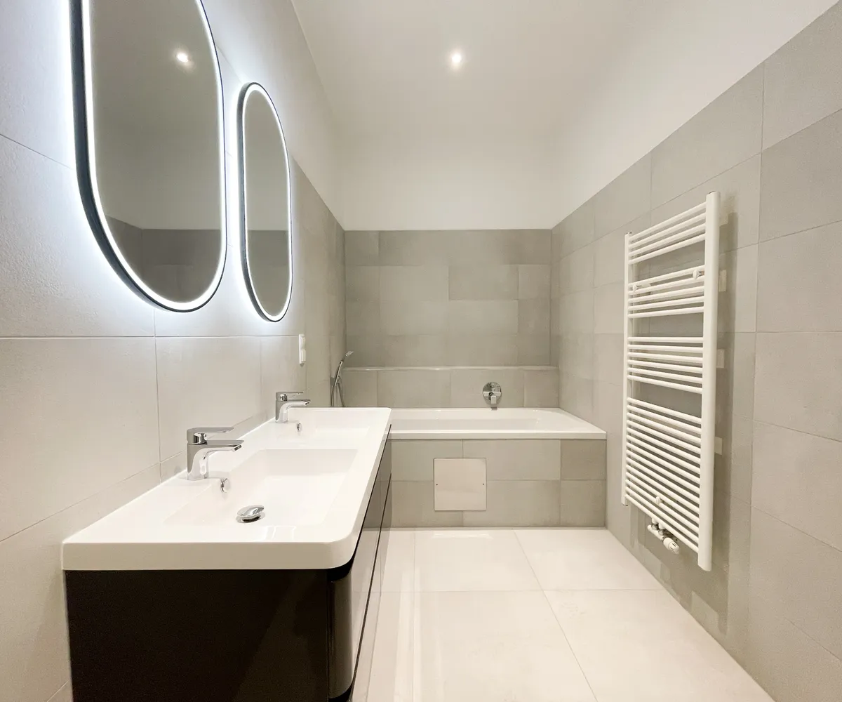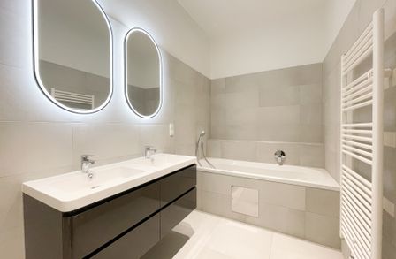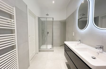 hochwertig saniertes Bad mit Walk-In-Dusche, Badewanne & Doppelwaschbecken