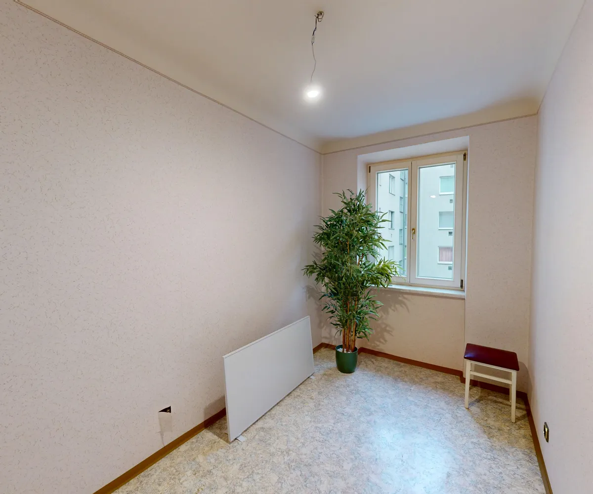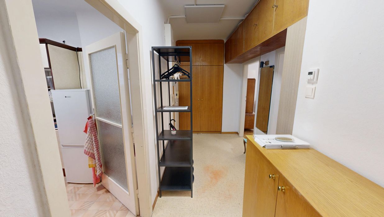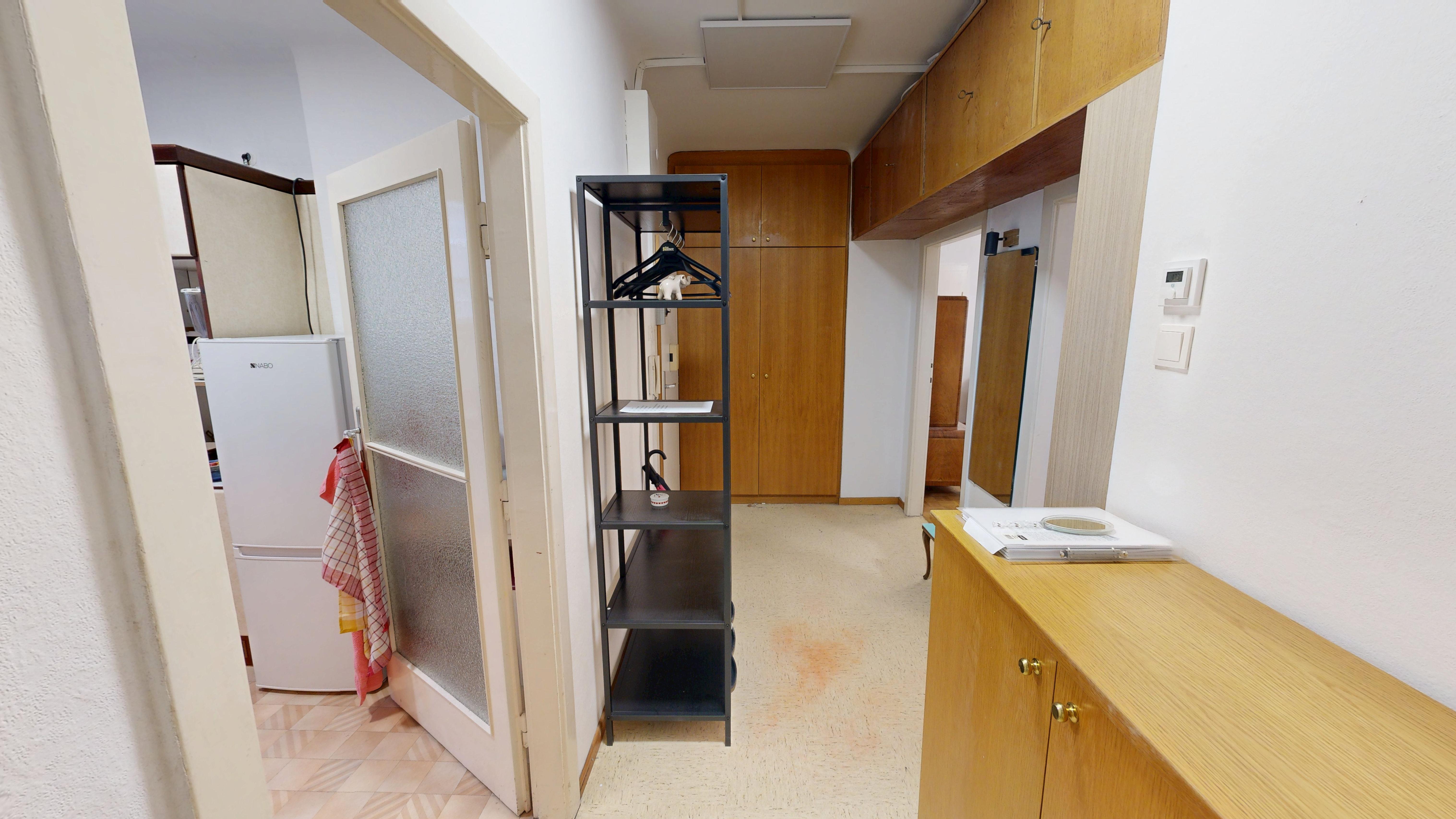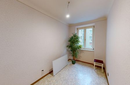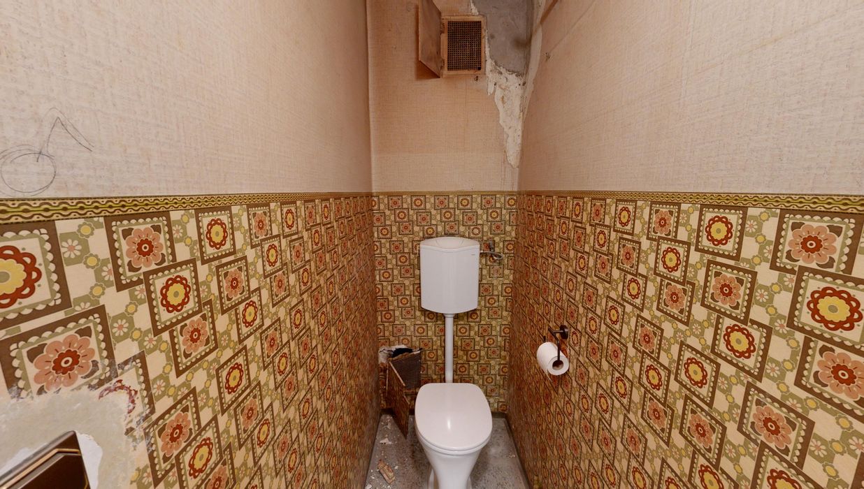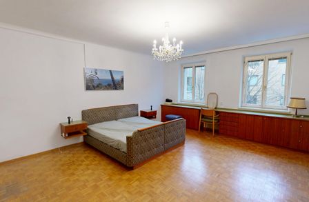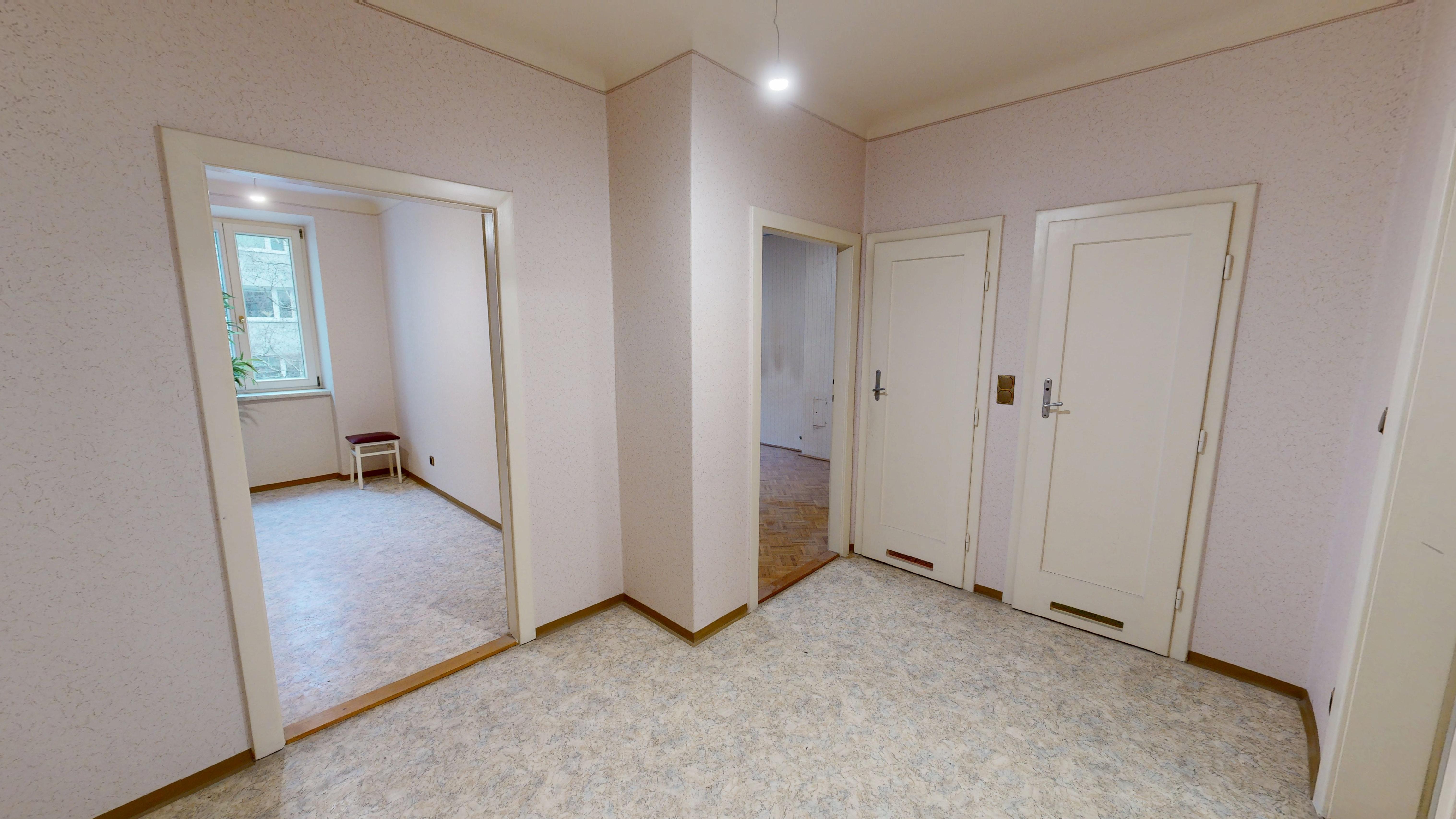 Die Wohnung verfügt über zwei separate Eingänge, insgesamt fünf Zimmer, eine Küche, zwei Bäder sowie zwei WCs. Ein Zimmer war ursprünglich als Küche vorgesehen und verfügt noch über verdeckte Küchenanschlüsse, was zusätzliche Flexibilität in der Grundrissgestaltung ermöglicht. Ein Badezimmer befindet sich in gutem Zustand, das zweite ist sanierungsbedürftig und bietet Raum für individuelle Anpassungen. Ergänzt wird das Raumangebot durch zwei Kellerabteile.
