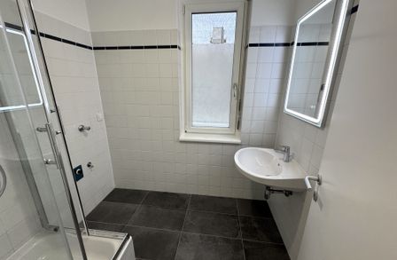 Badezimmer mit Dusche und Waschmaschinenanschluss