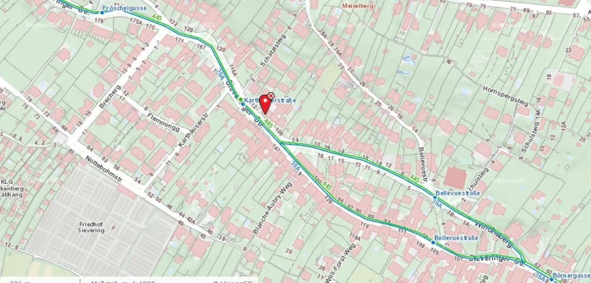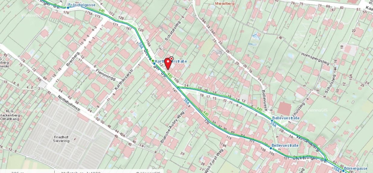 Die hervorragende Lage bietet Spaziergänge im Grünen an und die öffentliche Verkehrsanbindung ist mit der Buslinie 39A vor der Hausstiege gegeben, sodass ein rasches Erreichen zur Schnellbahn Oberdöbling erfolgt oder zur U4-Station Heiligenstadt.