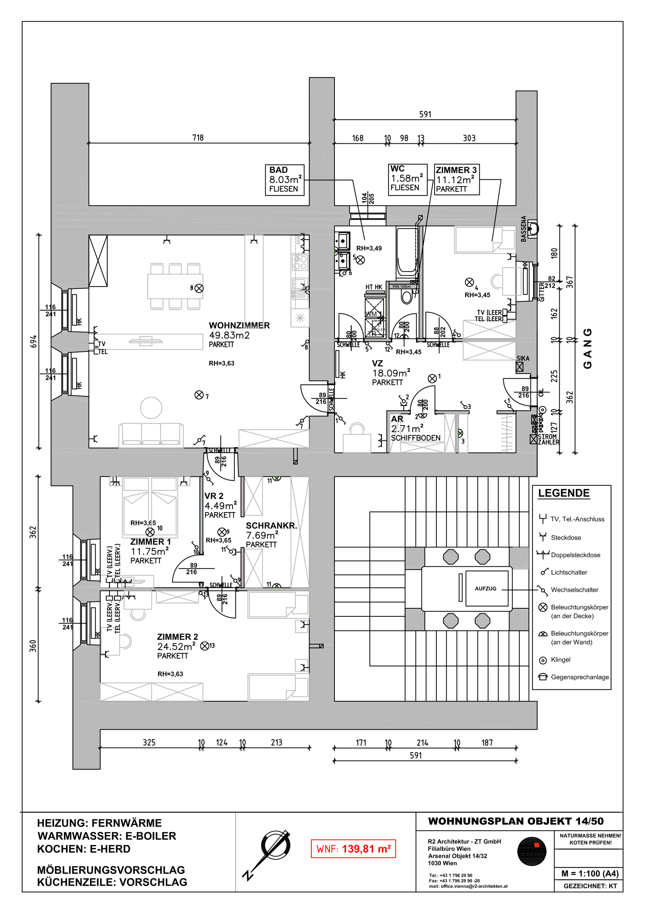 Die Wohnung befindet sich im 2. Obergeschoss und gliedert sich in eine großzügige Wohnküche, einen Schrankraum, drei getrennt begehbare Schlafzimmer, ein Badezimmer mit Wanne, Doppelwaschbecken und Waschmaschinenanschluss, ein separates WC, einen Abstellraum, sowie einen großzügigen Vorraum.