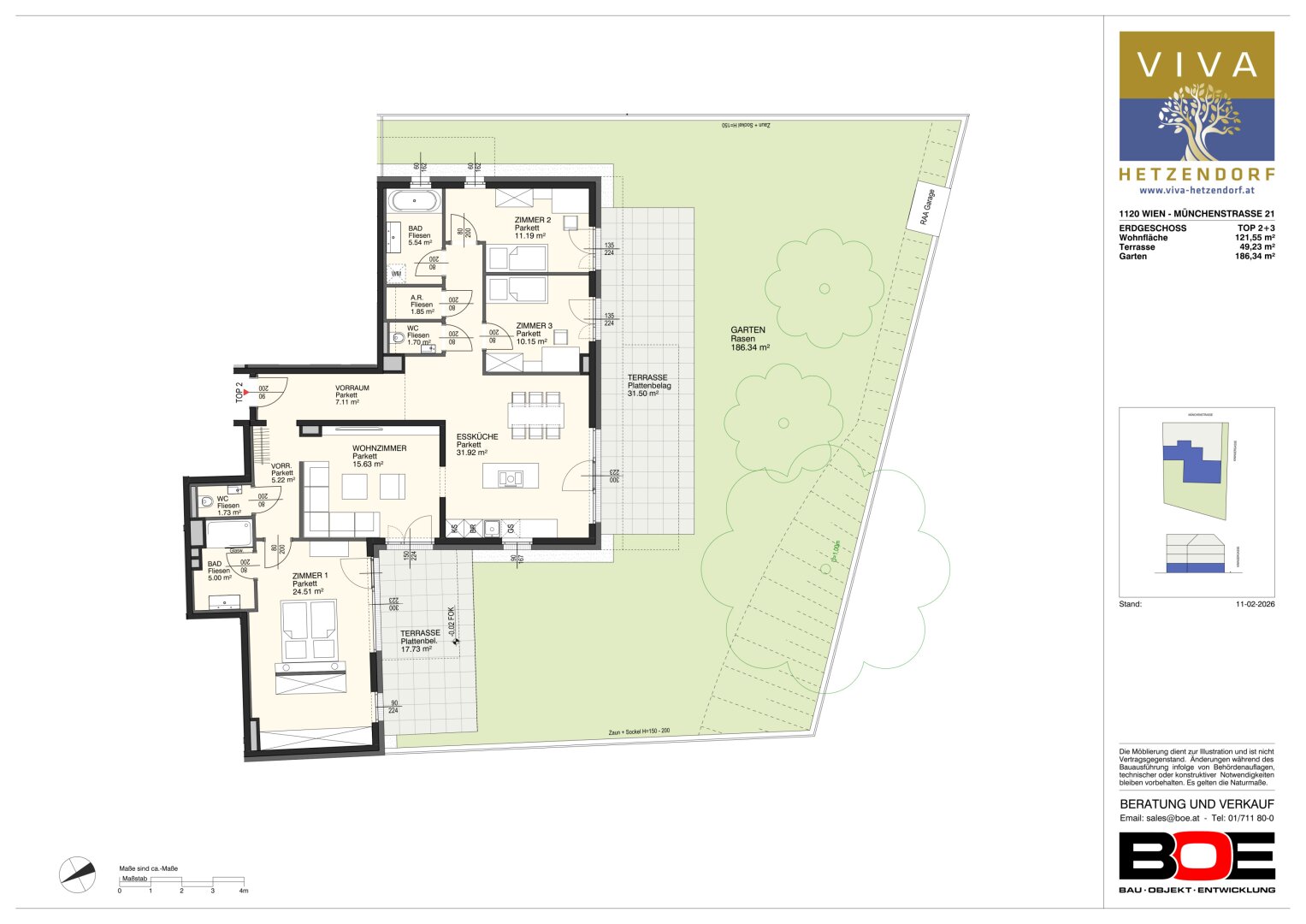 Die Top 2-3 ist eine sehr helle ( Ost Süd West Ausrichtung ) 4 Zimmer Gartenwohnung mit 2 großen Terrassen und noch größerem Garten ( ca. 186 Quadratmeter ).