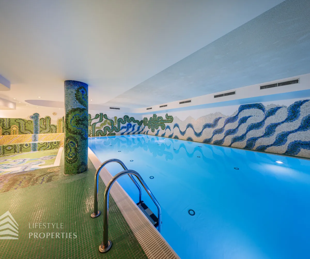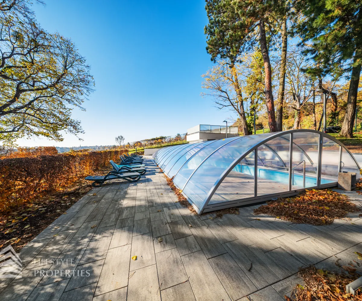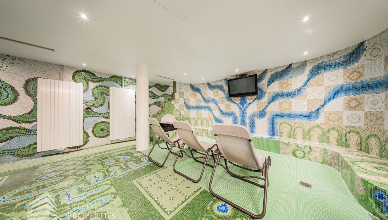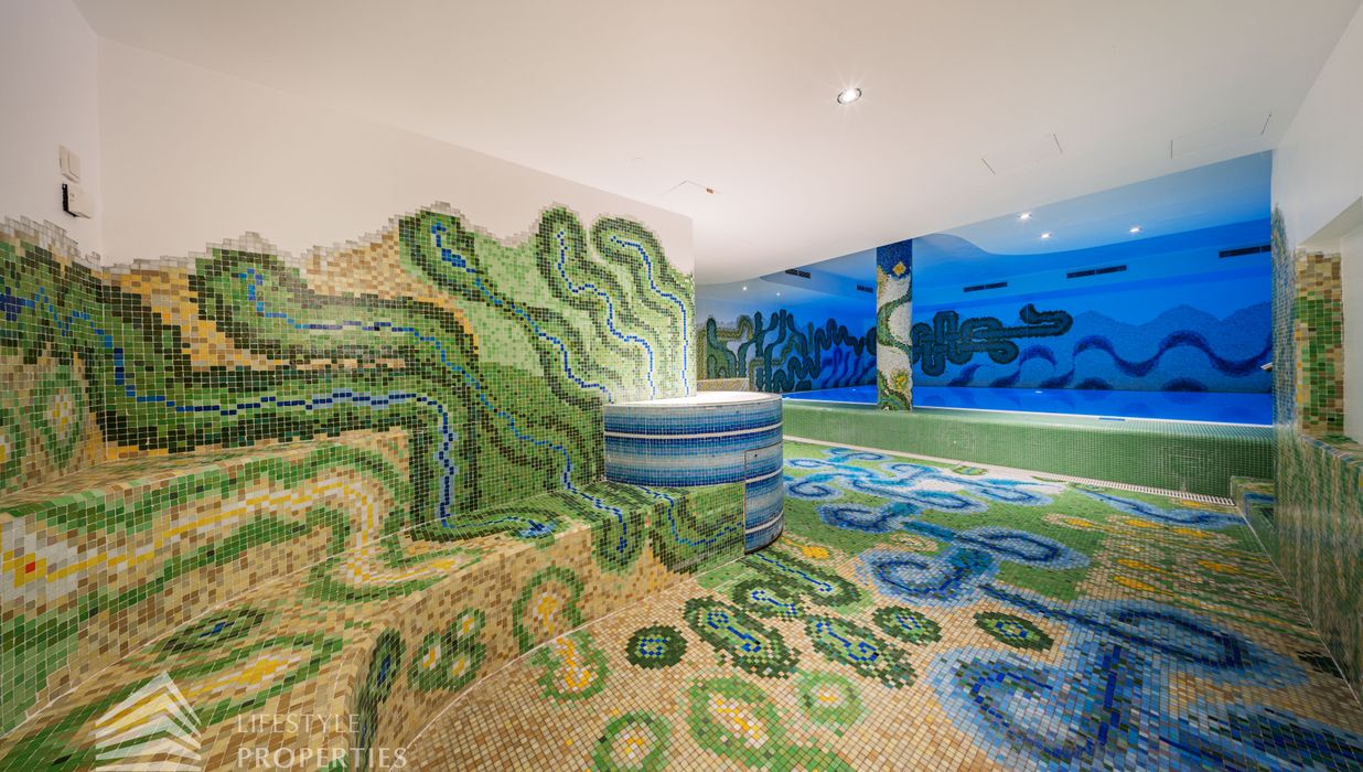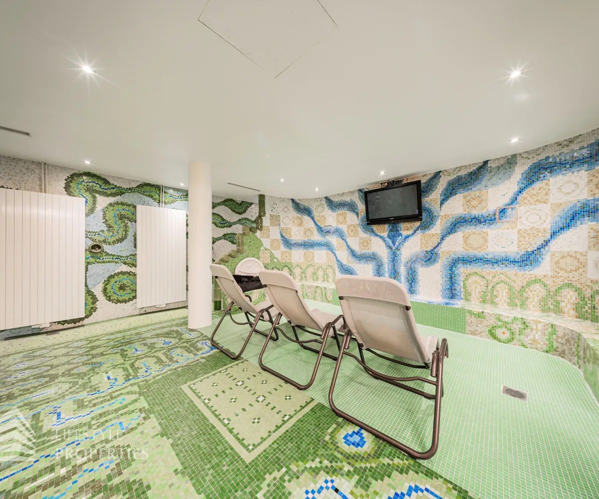 Das Wohnhaus verfügt über einen Innen- sowie Außenpool. Ergänzt wird das Angebot durch eine Sauna mit integrierter Dusche und WC. Alle Einrichtungen stehen das ganze Jahr über zur Verfügung. Ein weiteres Highlight ist der Weinkeller, der nicht nur über individuelle Weinabteile für jede Wohnung verfügt, sondern auch ideal für Feierlichkeiten genutzt werden kann. Zudem gehört ein Kamin zur Ausstattung jeder Wohnung.
