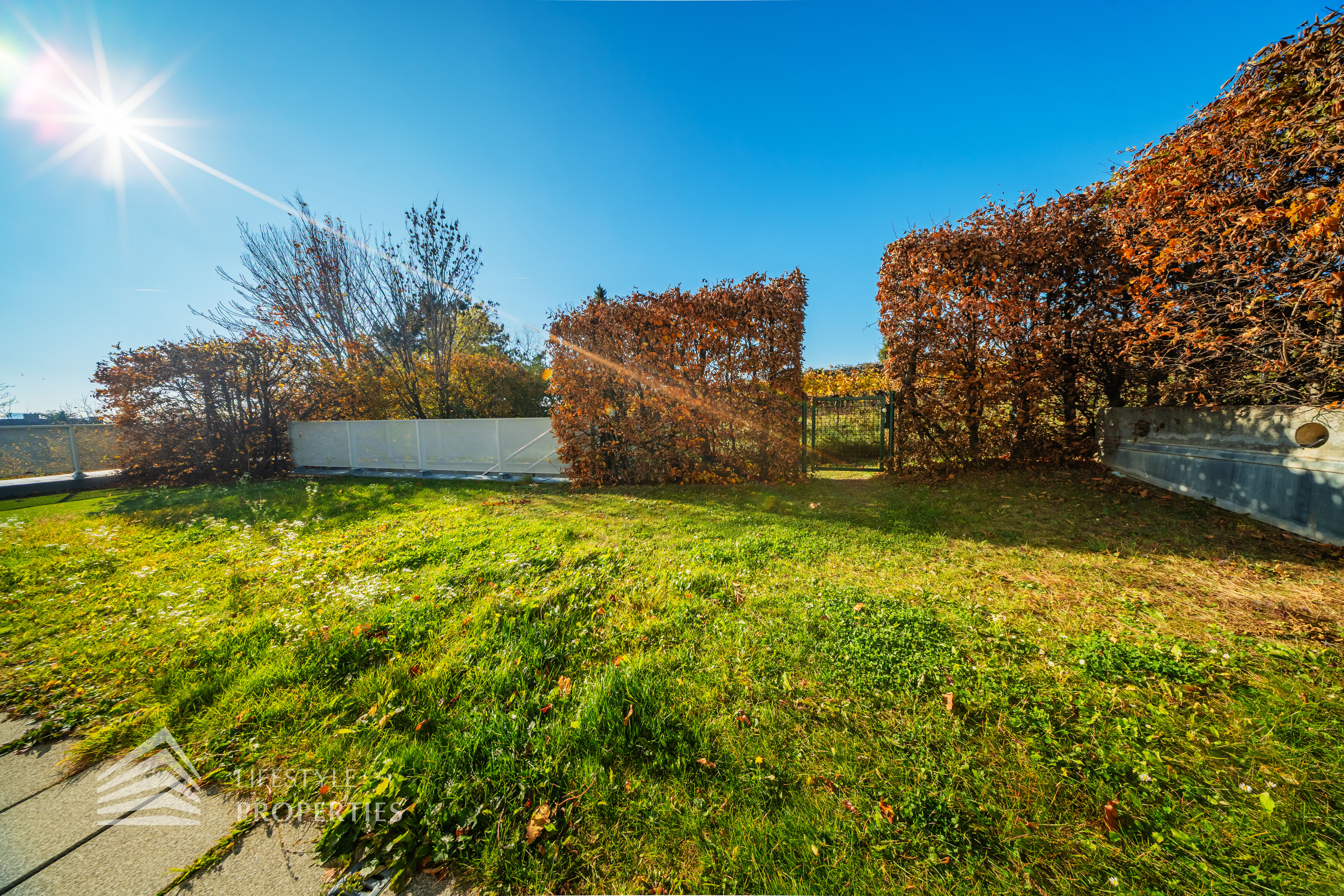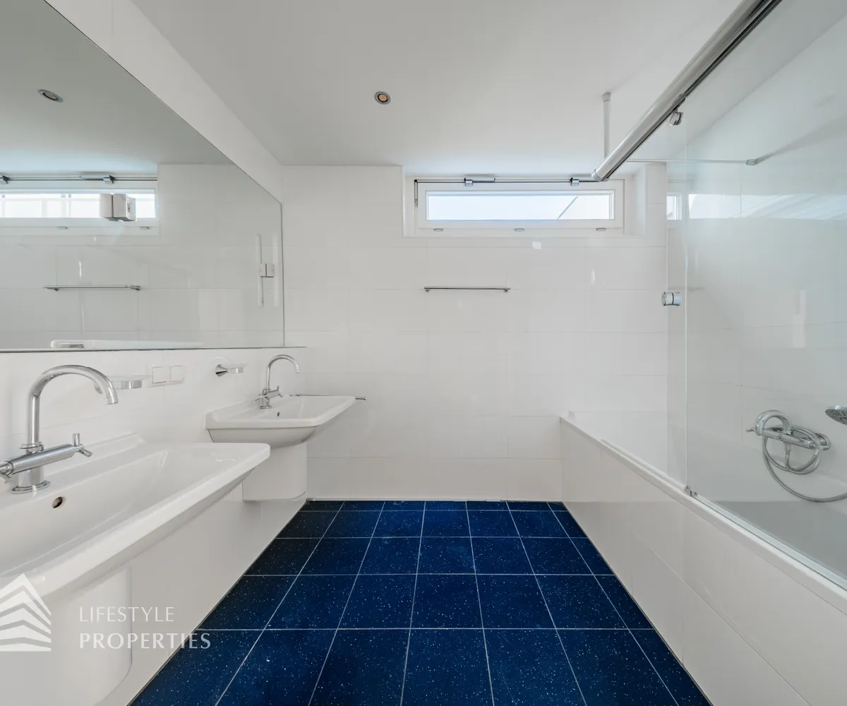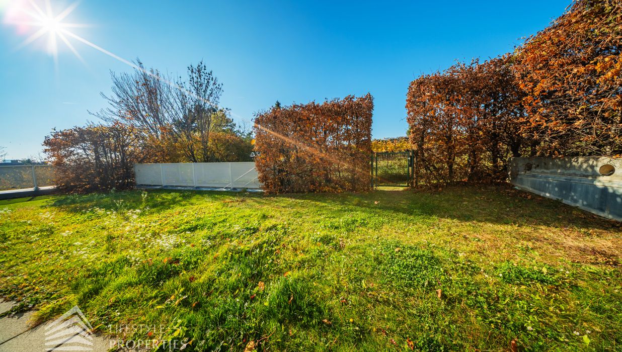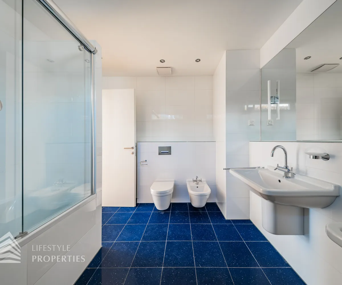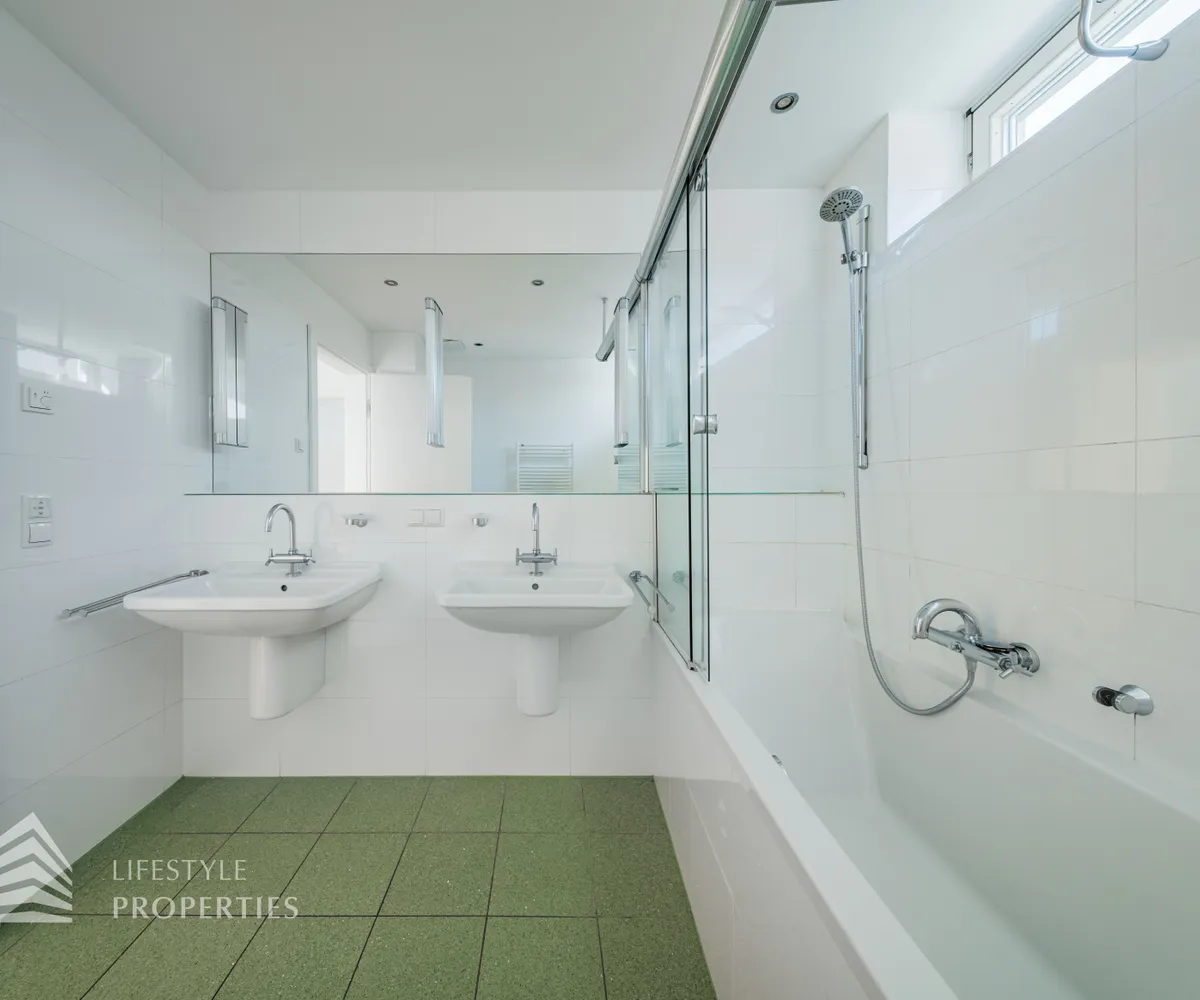 Sie betreten die Wohnung und befinden sich im Vorraum, der Zugang zur Küche und zum Wirtschaftsraum bietet. Rechts durch den Vorraum gelangen Sie in den großen Salon, der direkten Zugang auf eine Terrasse und den Garten bietet. Über einen Gang gelangen Sie zu den drei Schlafzimmern, eines davon mit en-suite Badezimmer und Garderobe. Die Bäder sind mit Badewanne, Waschbecken und WCs ausgestattet.