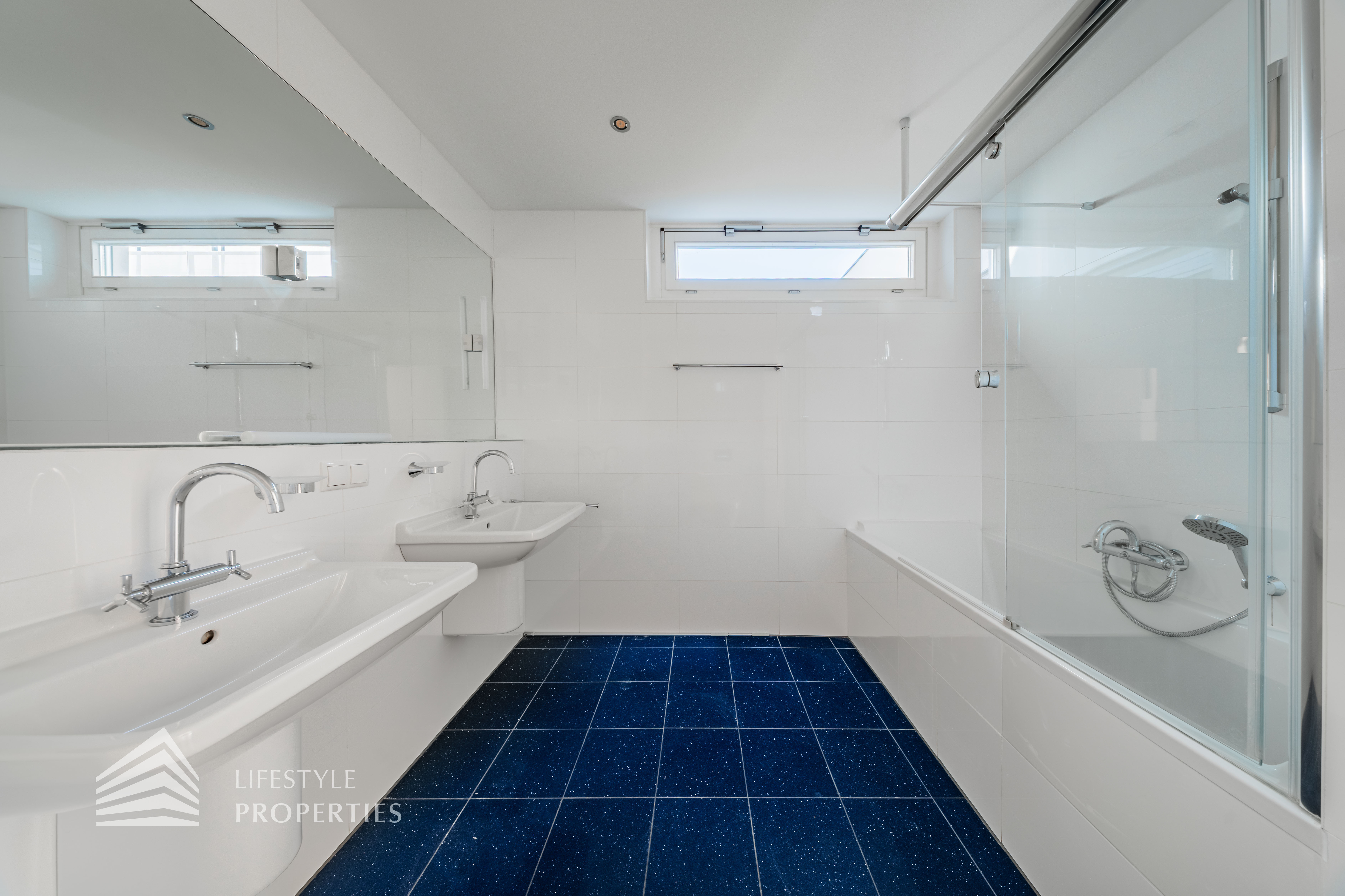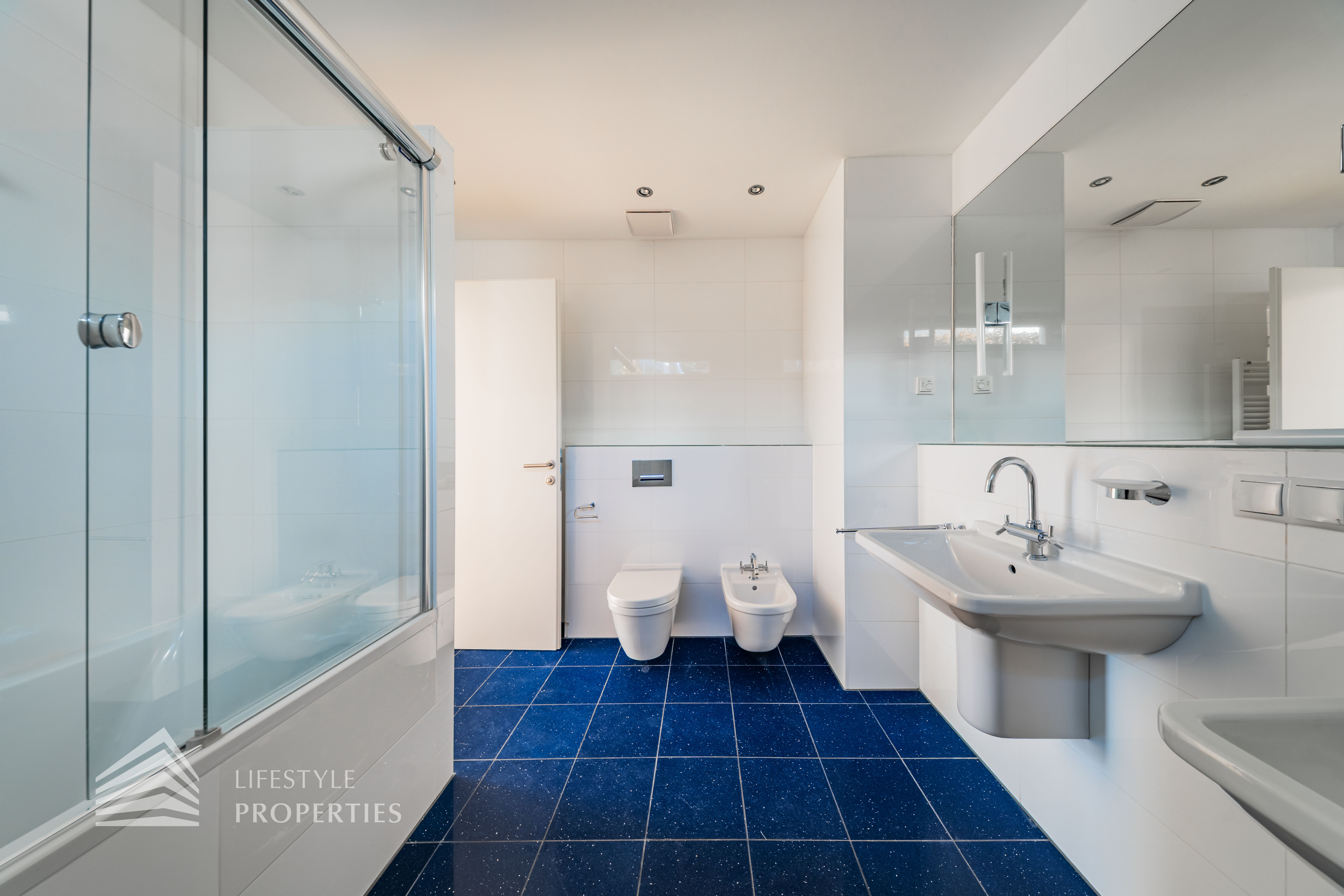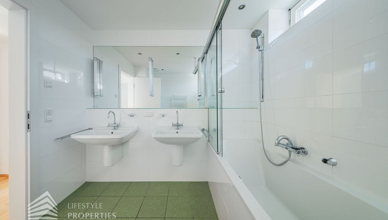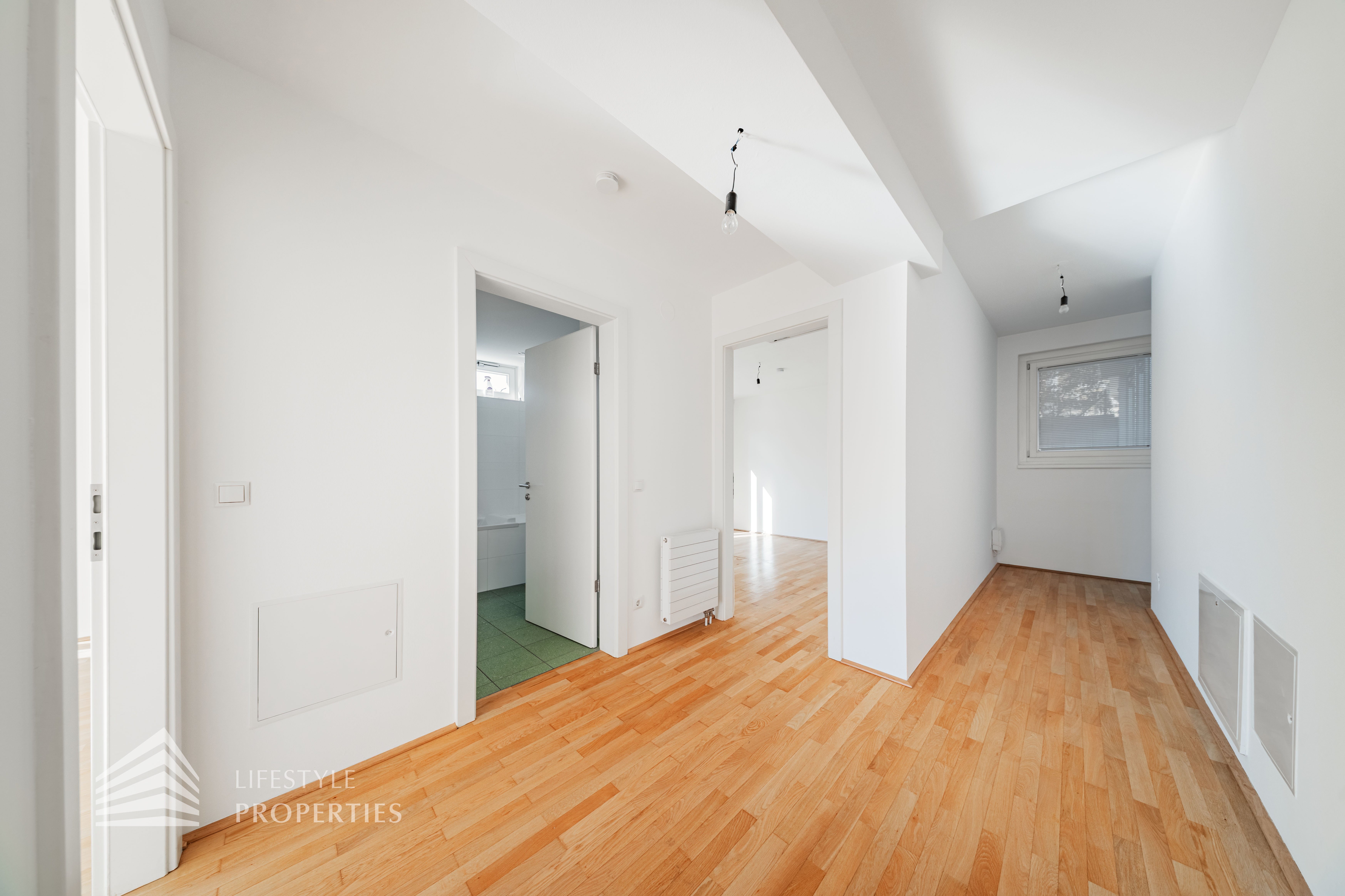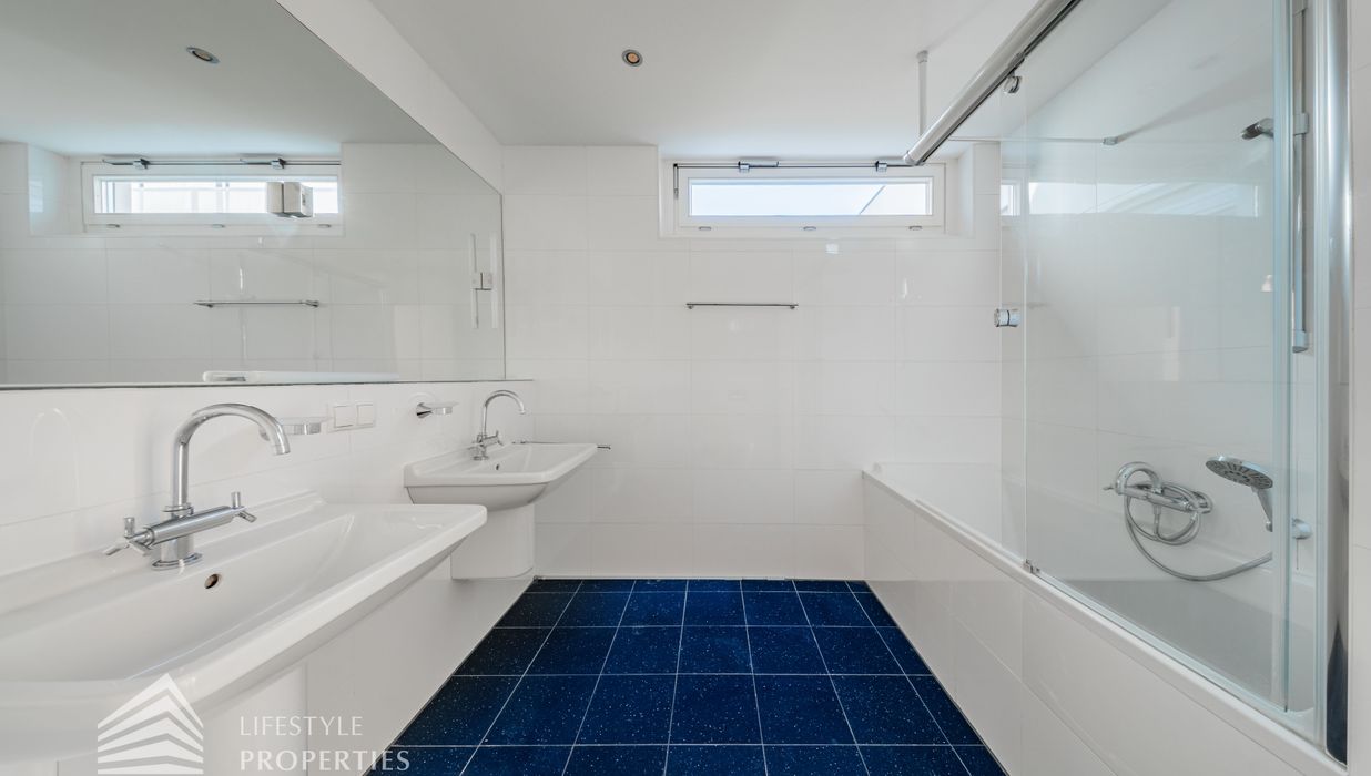 Sie betreten die Wohnung und befinden sich im Vorraum, der Zugang zur Küche und zum Wirtschaftsraum bietet. Rechts durch den Vorraum gelangen Sie in den großen Salon, der direkten Zugang auf eine Terrasse und den Garten bietet. Über einen Gang gelangen Sie zu den drei Schlafzimmern, eines davon mit en-suite Badezimmer und Garderobe. Die Bäder sind mit Badewanne, Waschbecken und WCs ausgestattet.