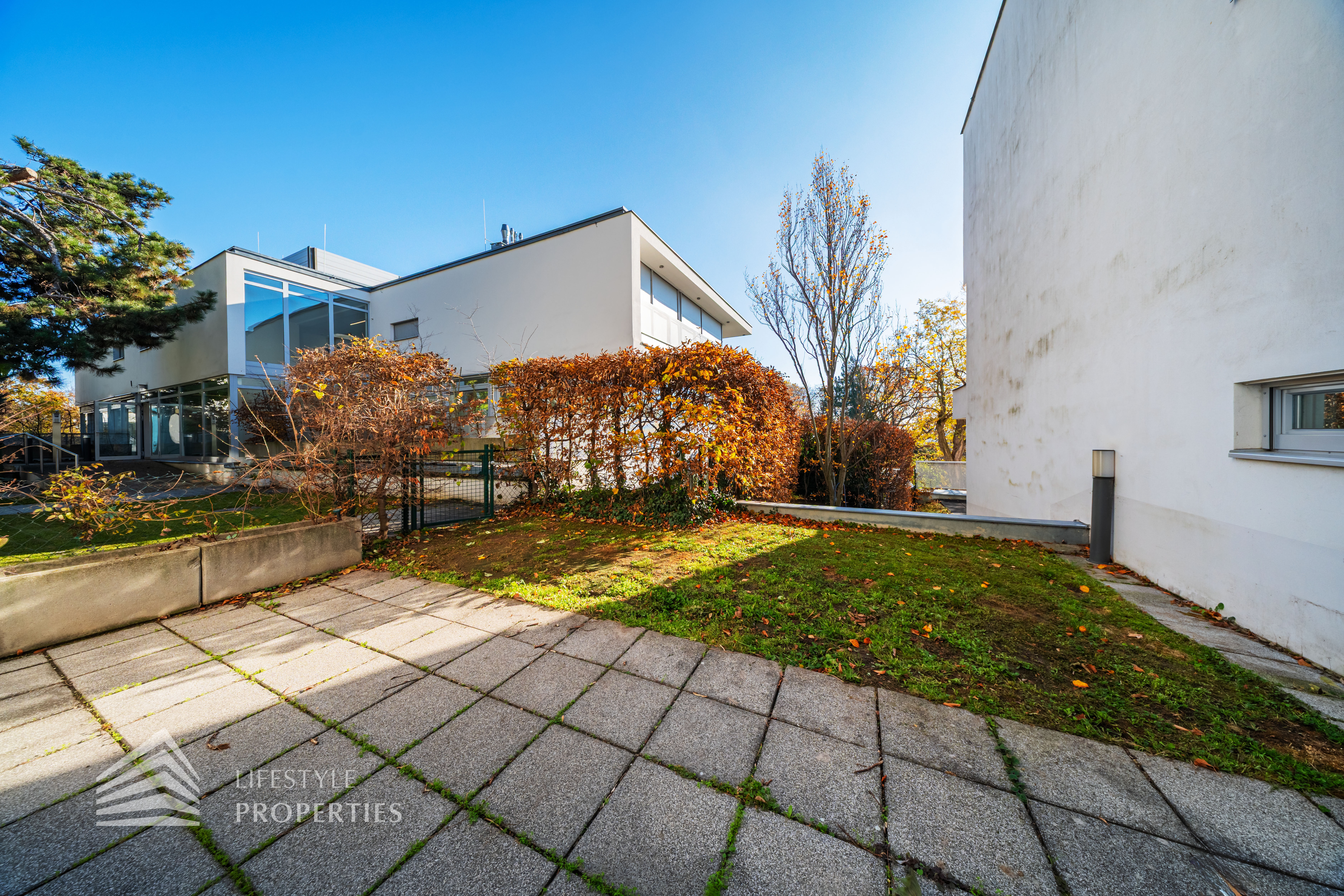 Die Wohnung befindet sich in einem im Jahre 1966 erbauten Neubau, liegt im 1. Stock und ist bequem über einen Lift erreichbar. Sie verfügt über eine Größe von ca. 163 m². Die Wohnfläche teilt sich in vier Zimmer, eine Küche, zwei Badezimmer, ein Gäste-WC, sowie zwei Abstellräume. Zusätzlich dazu bietet die Wohnung zwei Gärten und drei Terrassen.
