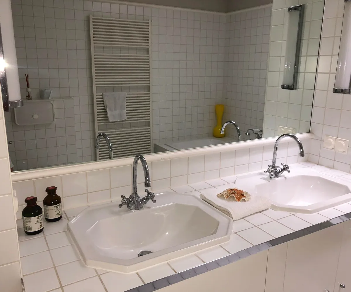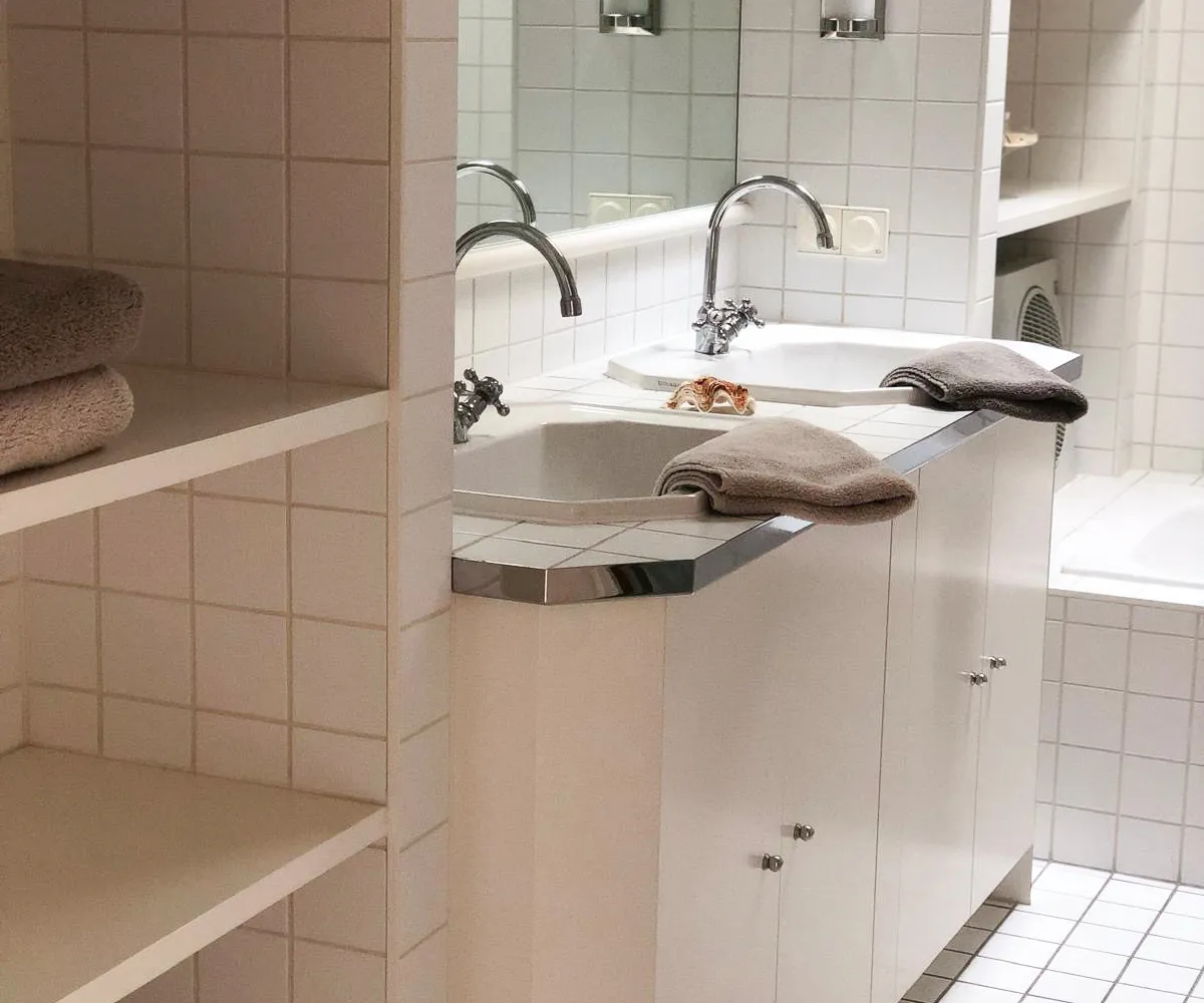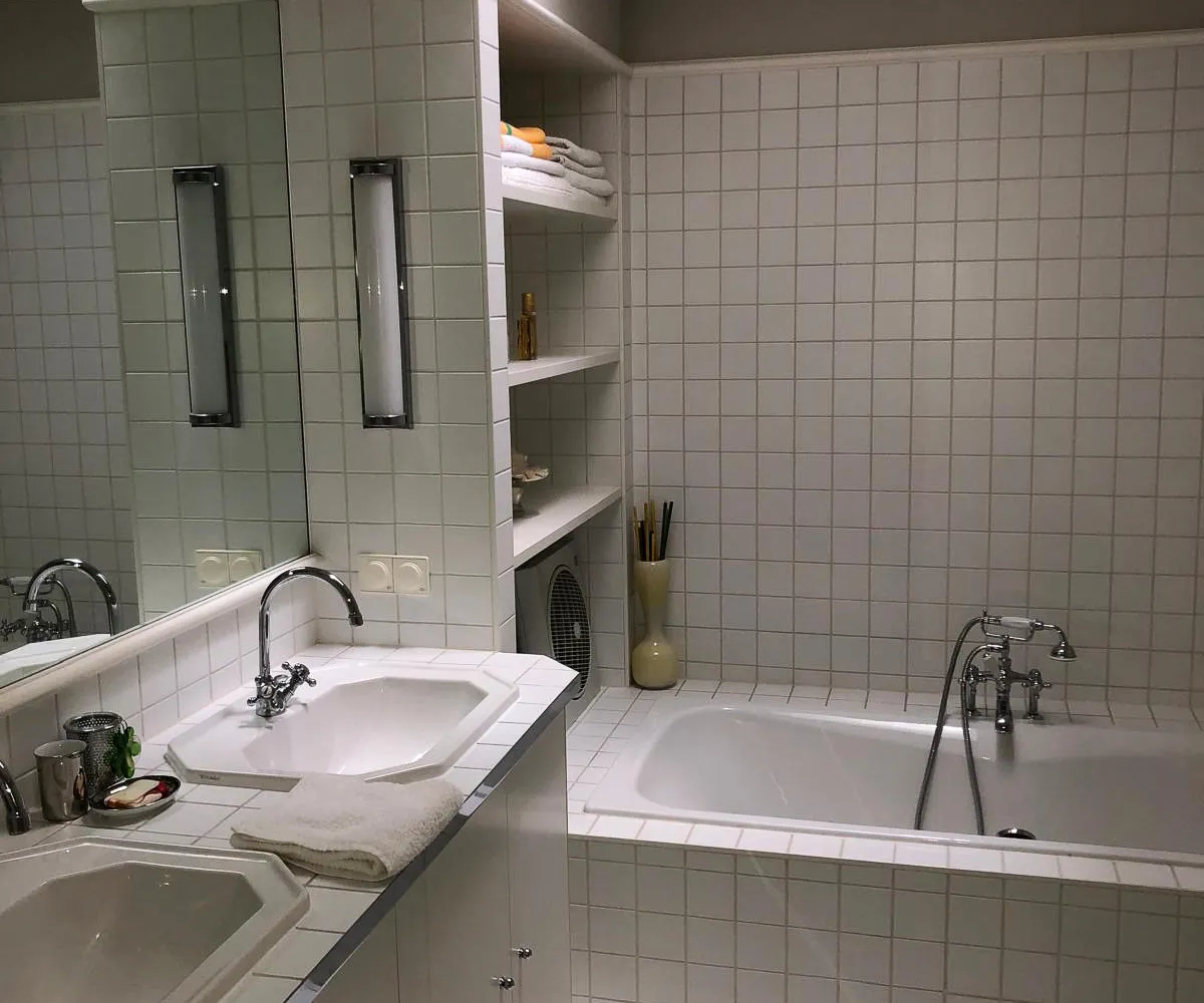 Badezimmer: Ausgestattet mit Badewanne, Doppelwaschbecken und WC.
