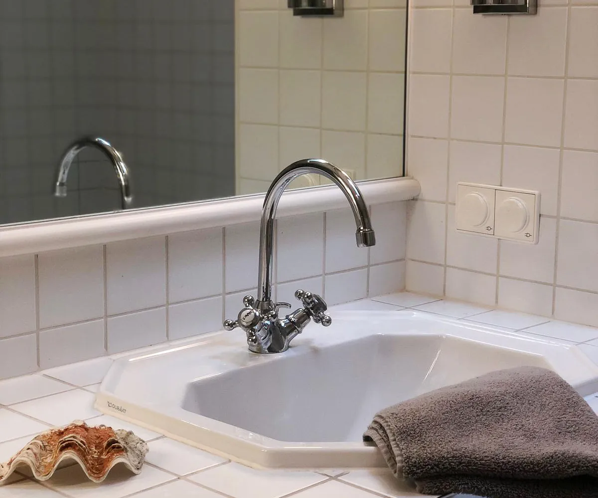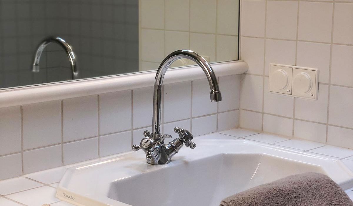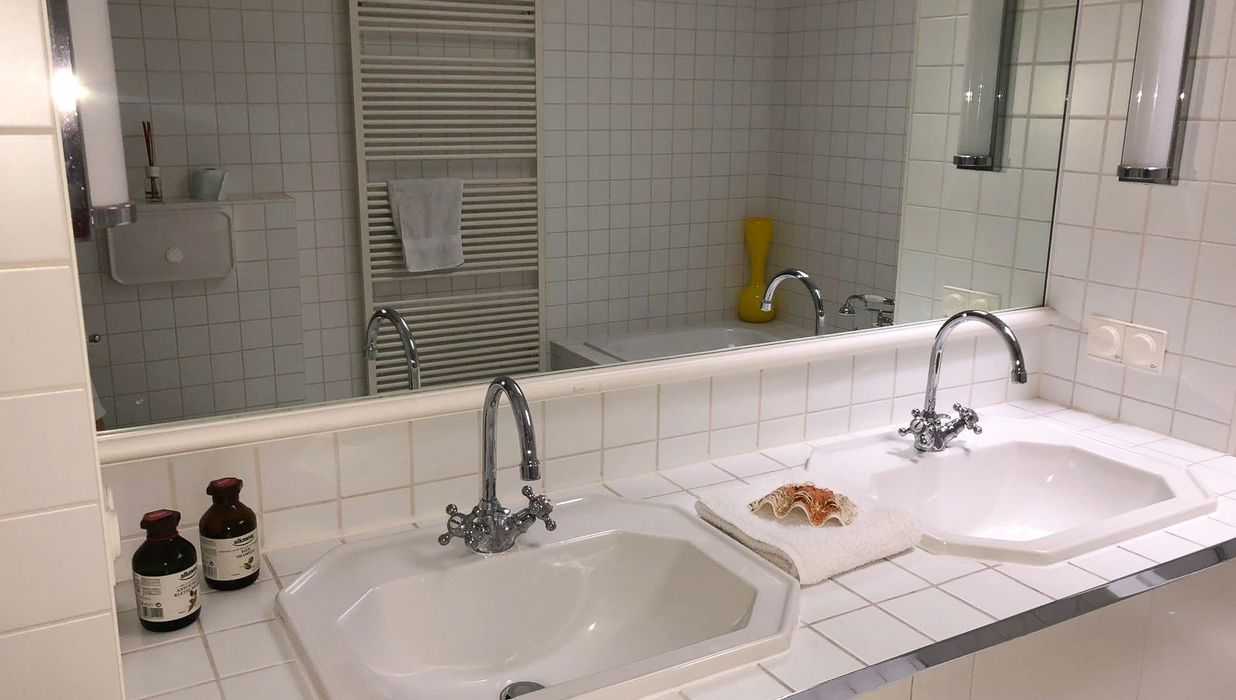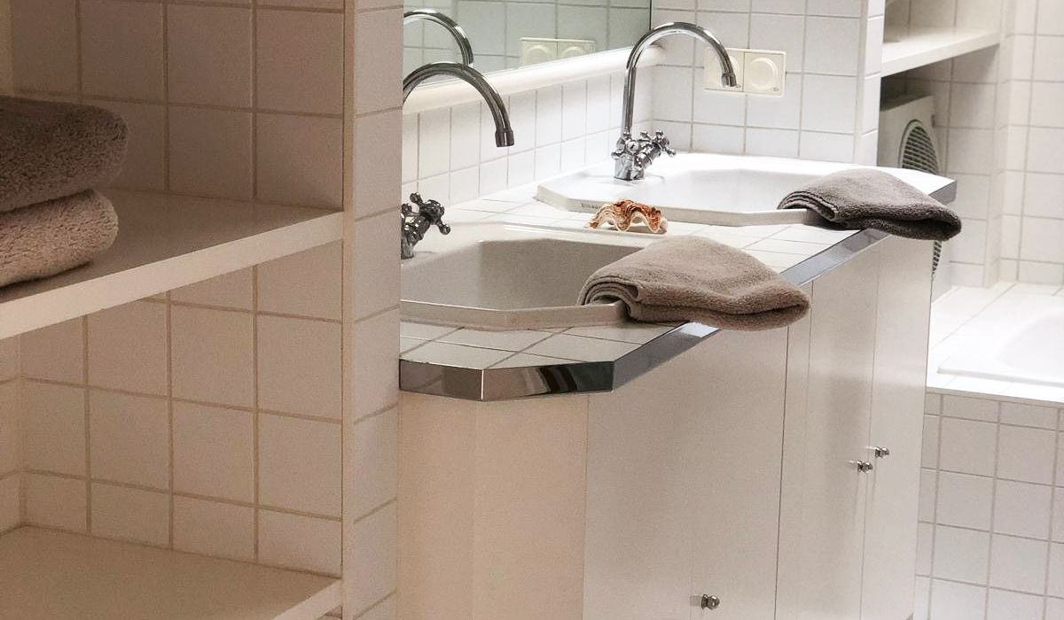 Badezimmer: Ausgestattet mit Badewanne, Doppelwaschbecken und WC.