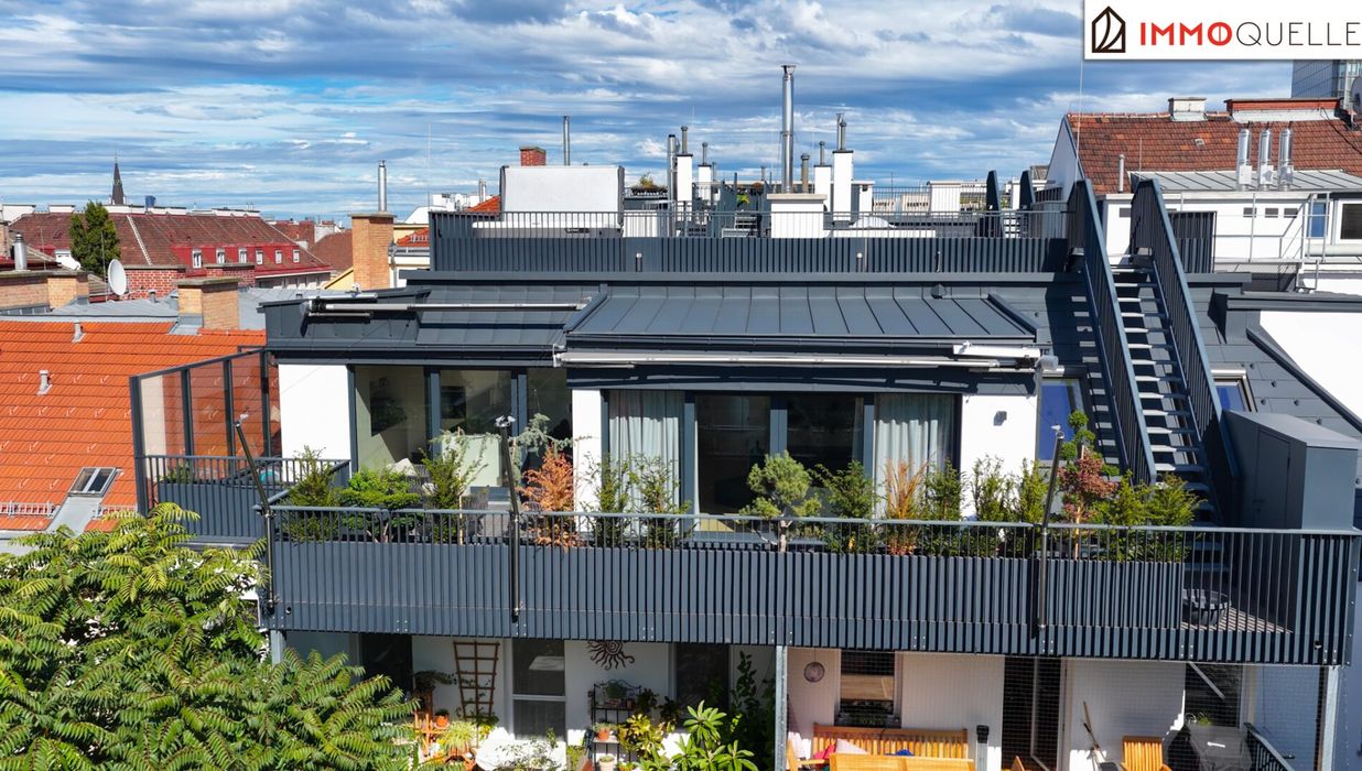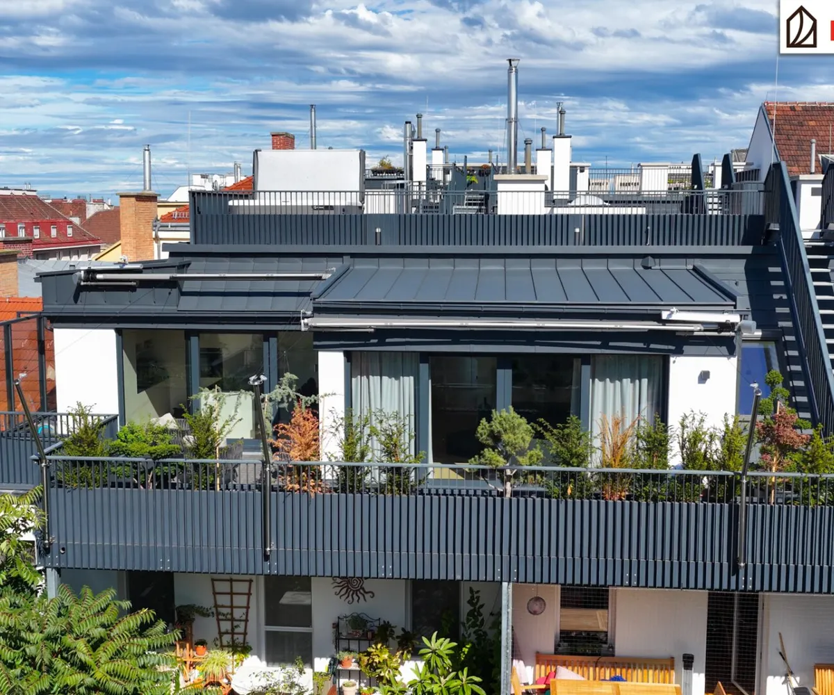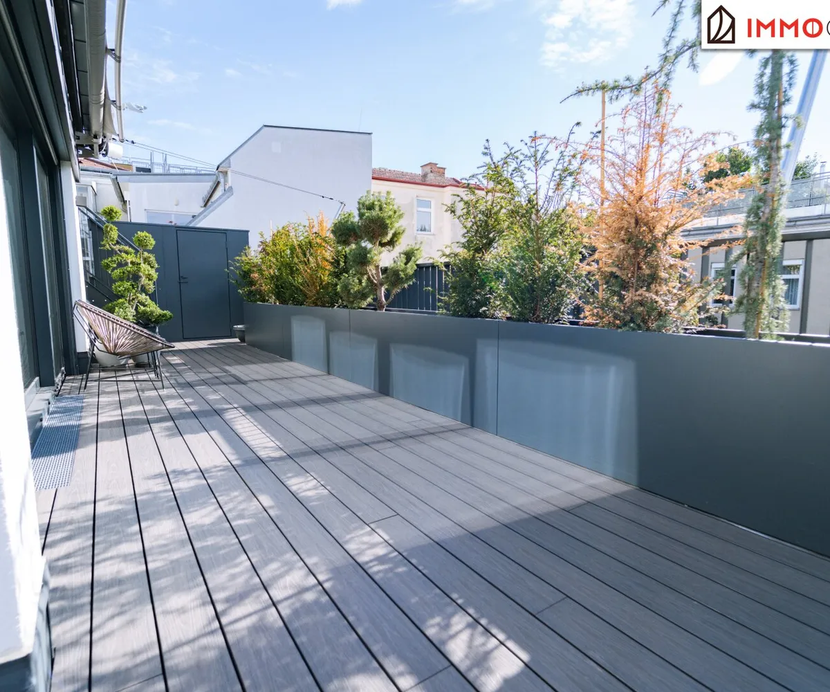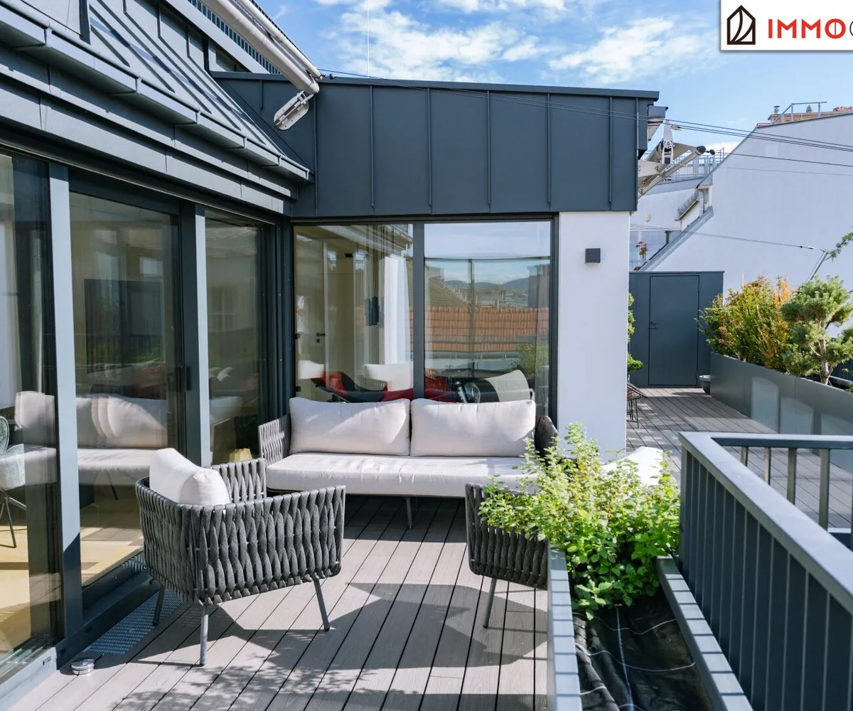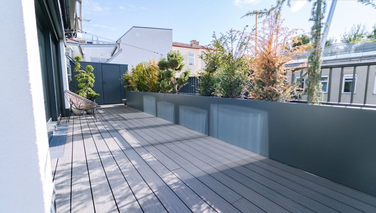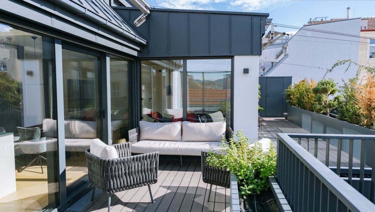 Vom Wohnbereich gelangen Sie direkt auf die erste, angrenzende Terrasse - ein sonniger Logenplatz mit Ausblick über Wien. Hier sorgt ein individuell steuerbares Markensonnensegel von Sun Square mit Windsensor für angenehmen Schatten und ein elegantes Erscheinungsbild. Hochwertige Pflanztröge und stilvolle Möblierung unterstreichen den exklusiven Charakter dieses Außenbereichs
