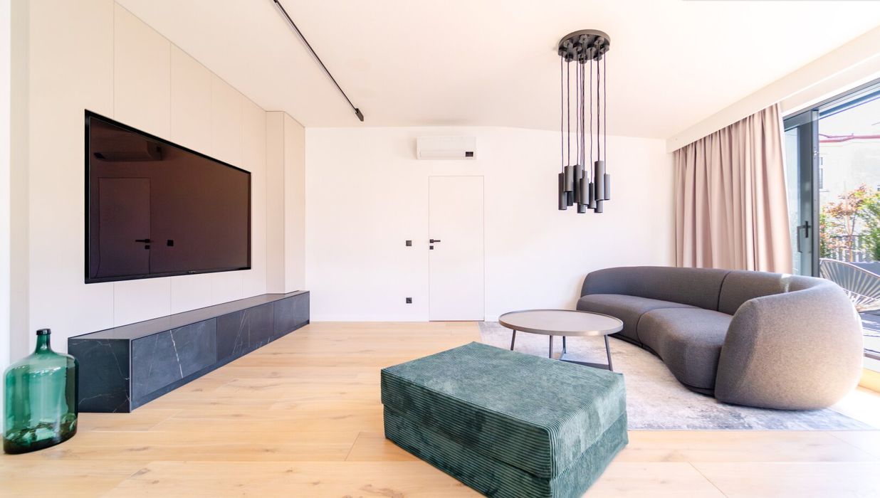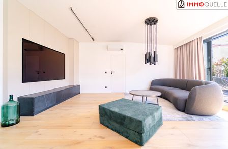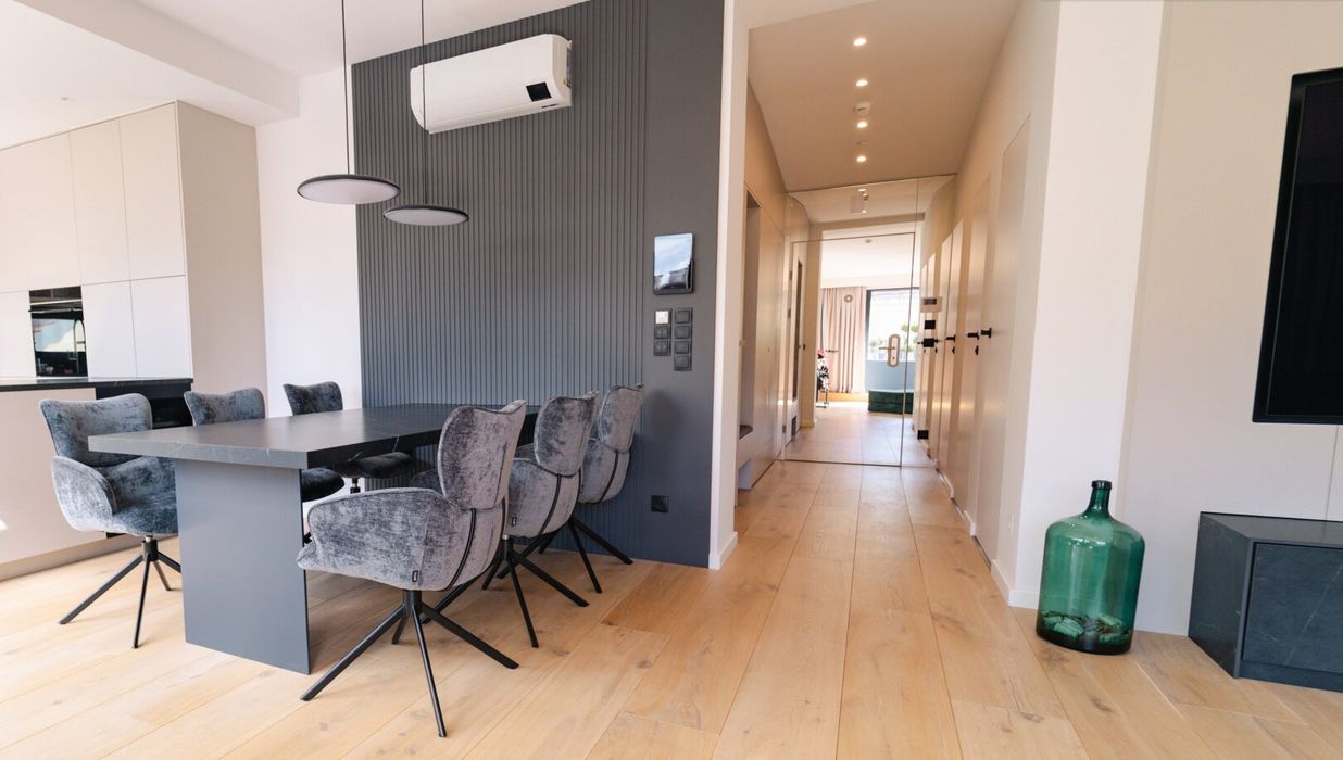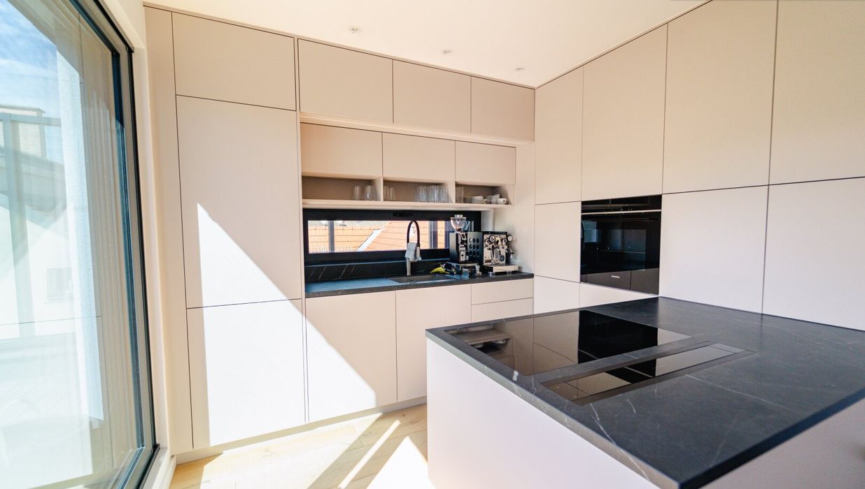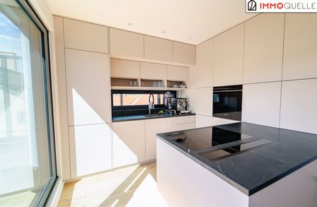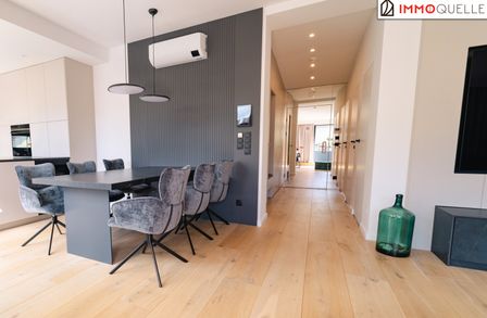 Der zentrale Wohnbereich beeindruckt durch seine offene Gestaltung und seine Großzügigkeit: 45 m² fließender Raum verbinden Küche, Essplatz und Lounge zu einem stilvollen Mittelpunkt des täglichen Lebens. Die hochwertige Küche mit Kochinsel und Geräten der Siemens fügt sich perfekt in das Designkonzept - dezent, aber luxuriös. Rundum sorgen elektrisch steuerbare Sonnenschutzsysteme, Vollklimatisierung und ein smartes Lichtsystem für maximalen Komfort - gesteuert über das integrierte Smart-Home-System.