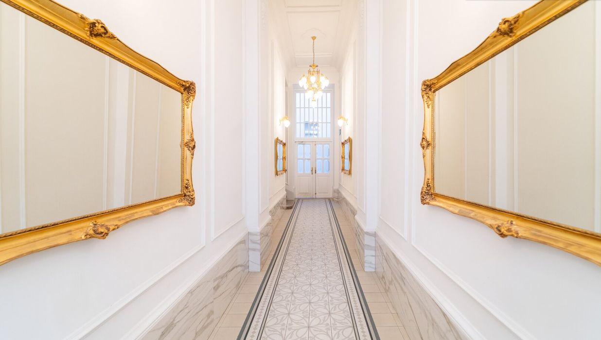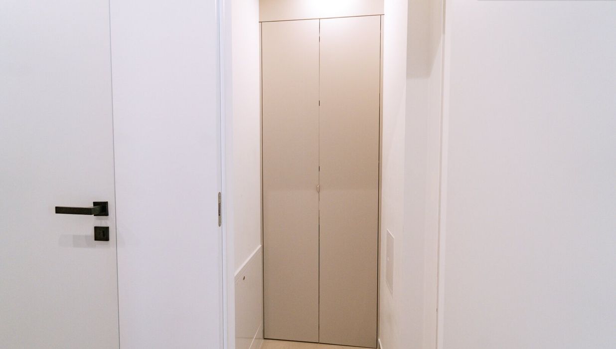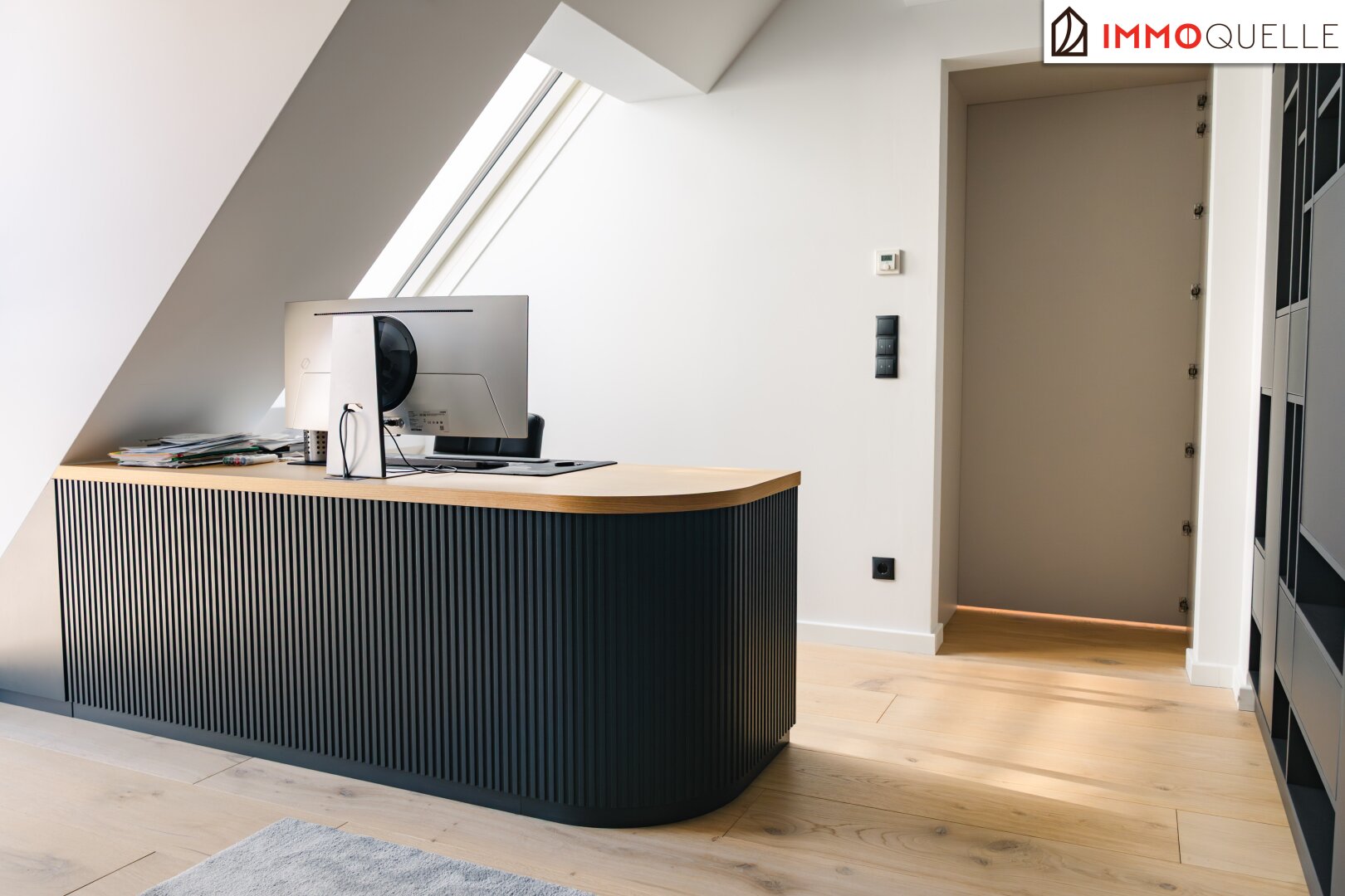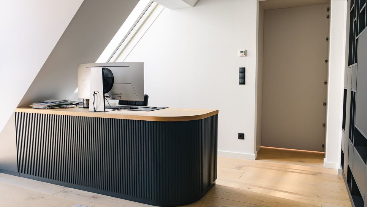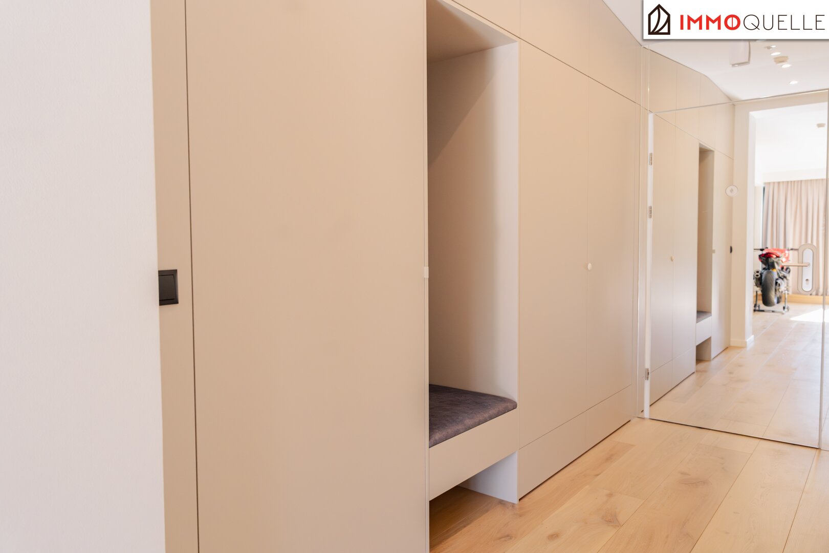 Zur Rechten öffnet sich ein zusätzlicher Raum, der vielfältige Nutzungsmöglichkeiten bietet - ob als elegantes Büro, charmantes Gästezimmer oder persönlicher Rückzugsort. Mit seiner ruhigen Lage, maßgefertigter Ausstattung und klaren Linien fügt er sich harmonisch in das großzügige Gesamtbild dieser Residenz ein.