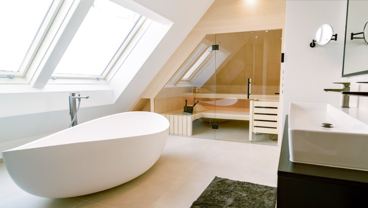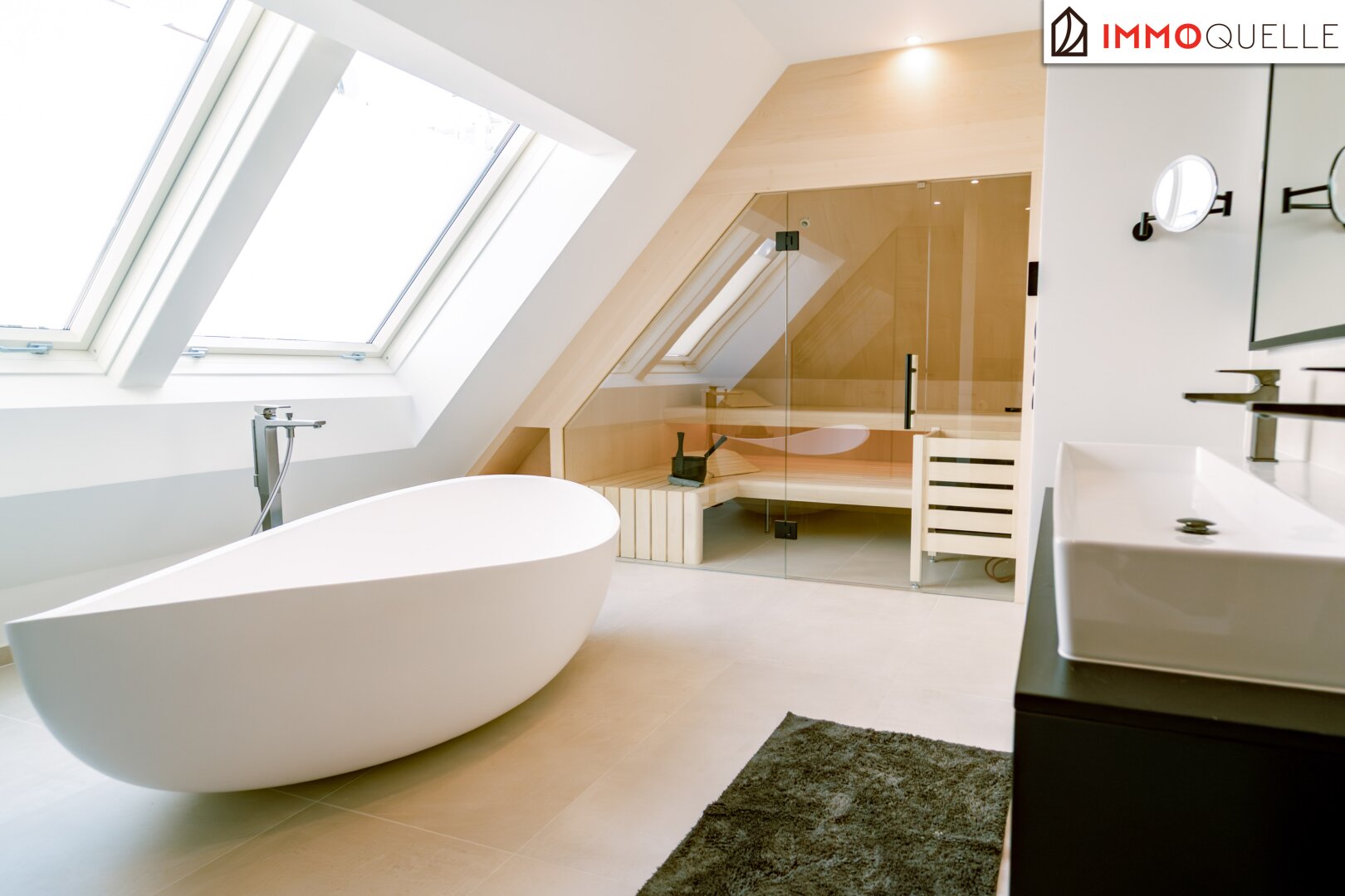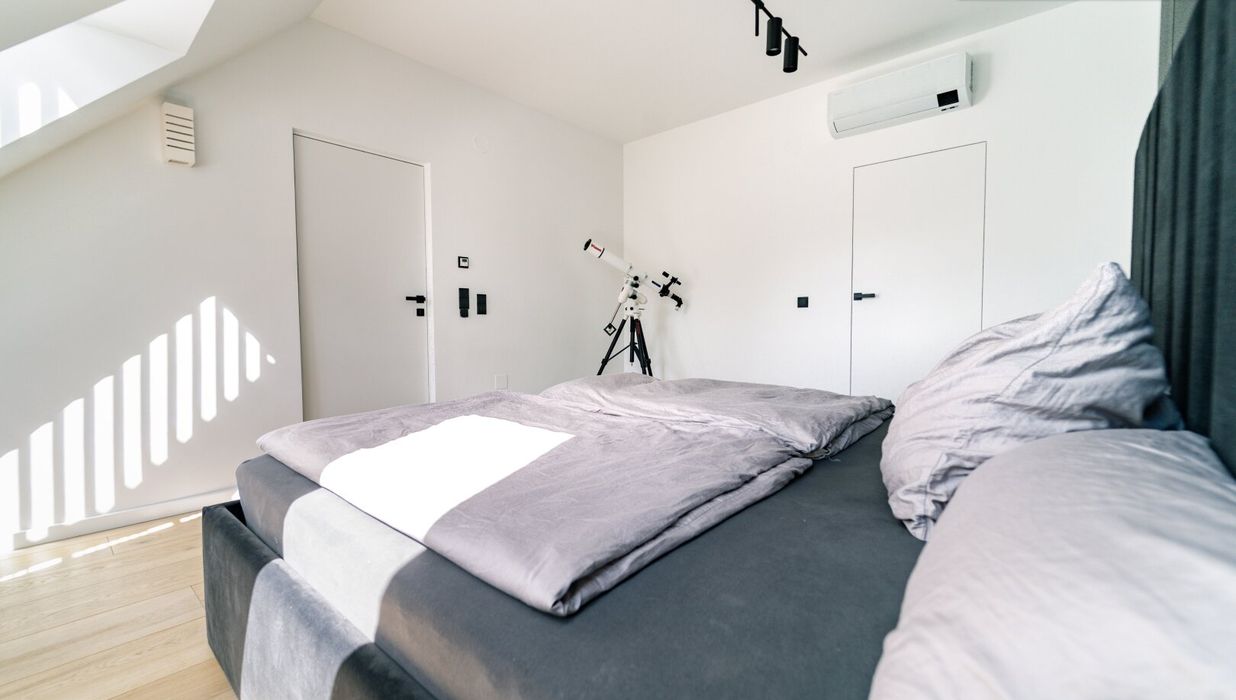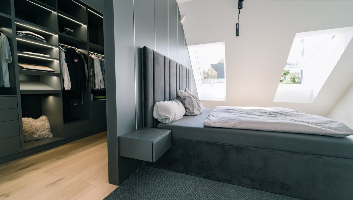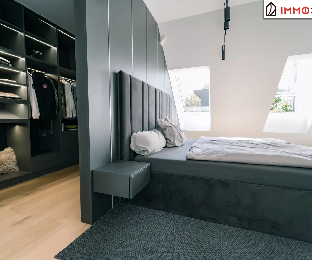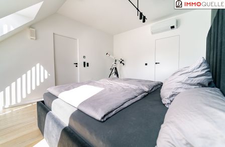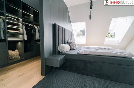Der Masterbereich wurde als privater Rückzugsort mit Spa-Charakter konzipiert - ausgestattet mit einem eigenen Schrankraum und einem Wellnessbad auf höchstem Niveau. Eine freistehende Badewanne, eine großzügige Walk-in-Dusche und als zentrales Highlight eine Design-Sauna mit kombinierbarem Finn- und Kräuterofen schaffen eine Atmosphäre der Erholung. Indirektes Lichtspektakel und Touchscreen-Steuerung verwandeln diesen Bereich in eine Oase der Ruhe - fern vom Alltag, mitten im Zuhause