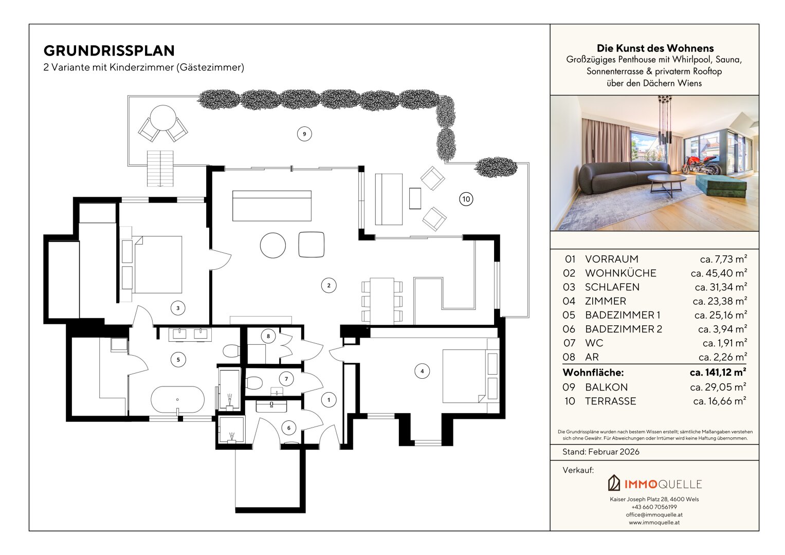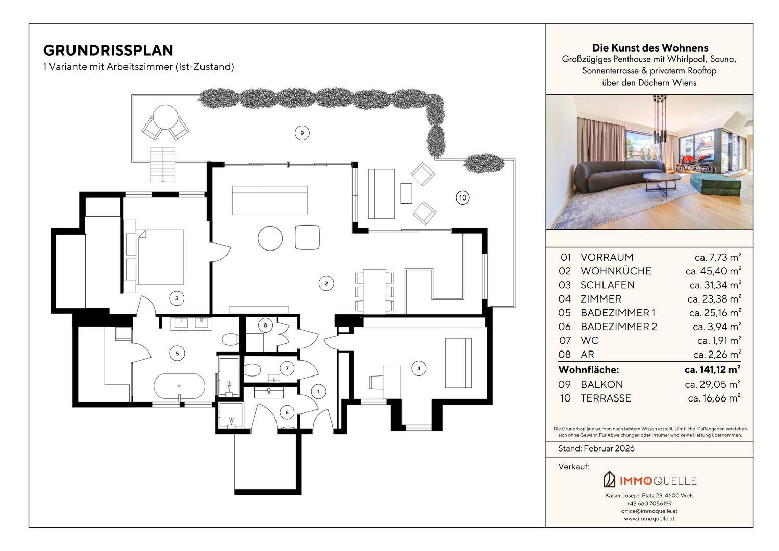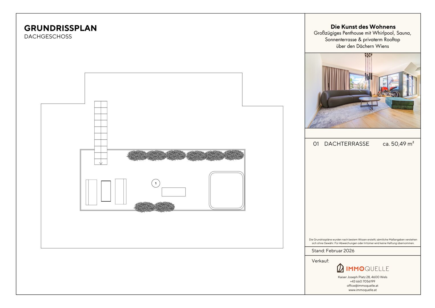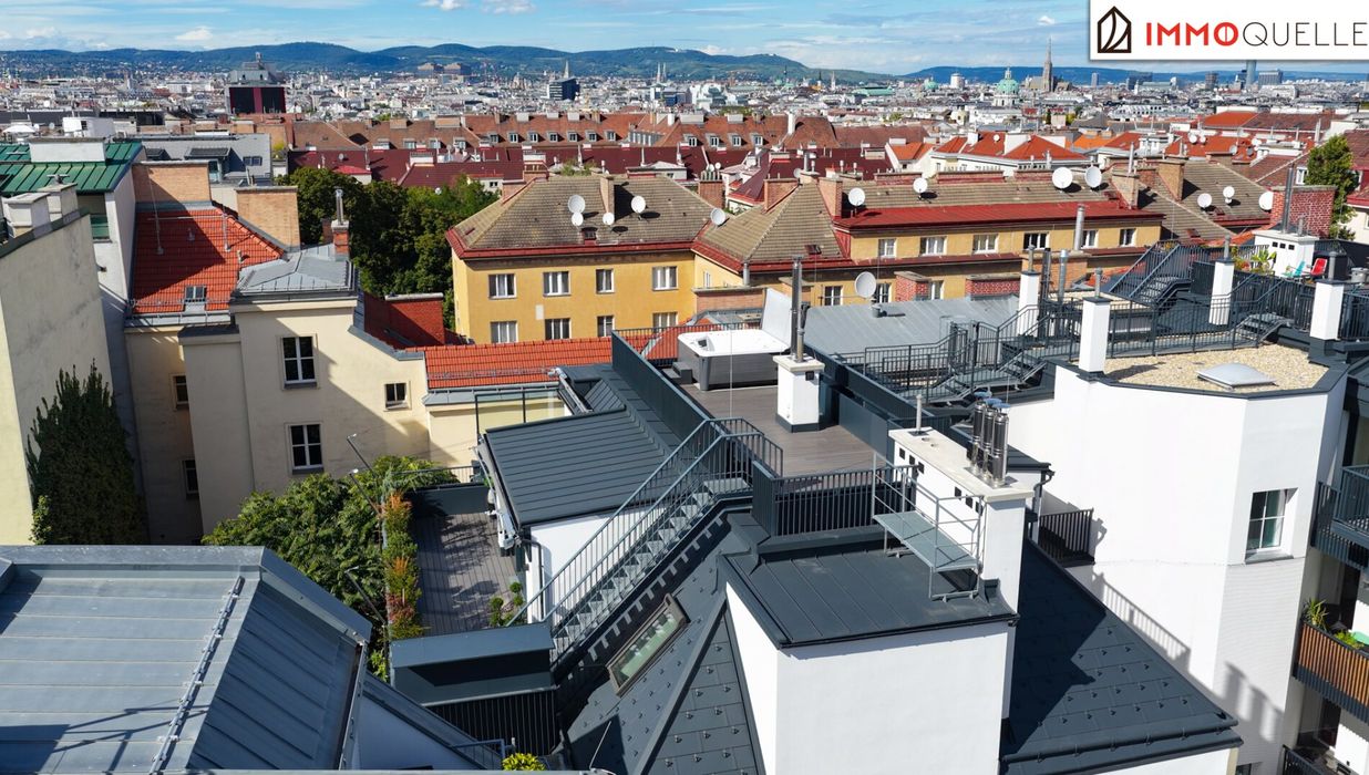 Die private Dachterrasse ist die Krönung dieses Penthouses. Über eine Treppe erreichen Sie die zweite Ebene - ein exklusiver Rückzugsort unter freiem Himmel, geschaffen zum Verweilen, Genießen und Repräsentieren. Hier oben eröffnet sich ein nahezu 360°-Panorama über die Dächer Wiens. Auf rund 50 m² entfaltet sich ein Freiluftrefugium mit urbanem Luxus: Ein hochwertiger Whirlpool für bis zu fünf Personen, die Option für eine integrierte Outdoor-Küche und elegante Begrünung schaffen eine einzigartige Wohlfühlkulisse - ruhig, privat, über der Stadt.