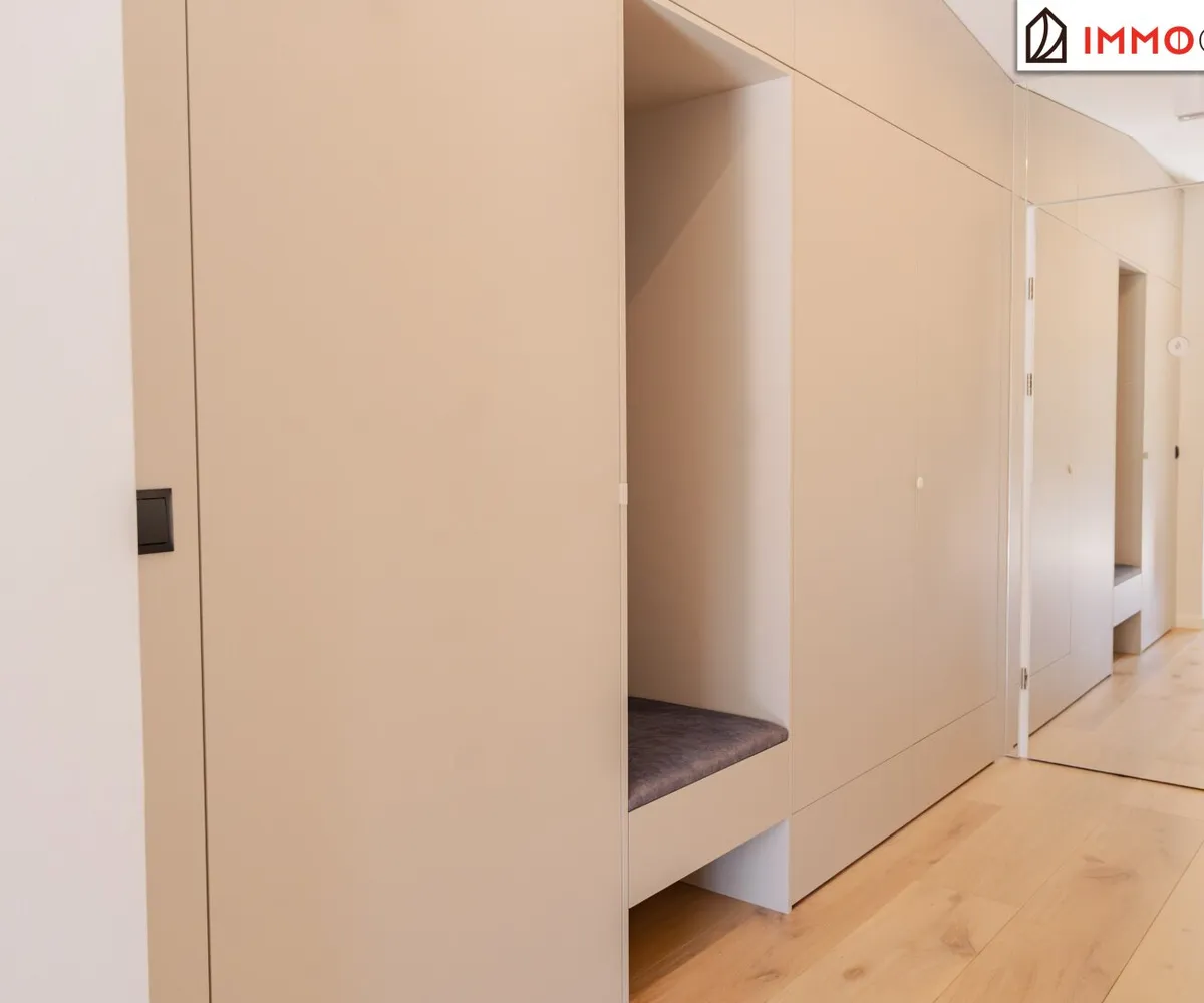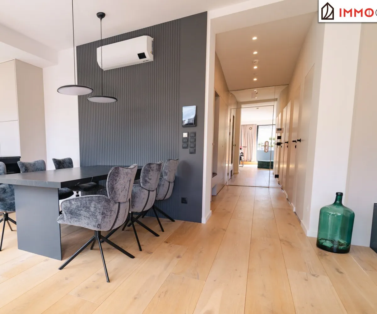 Schon beim Eintreten entfaltet sich ein Gefühl von Großzügigkeit und Klarheit. Die luftige Raumhöhe, die hochwertigen Materialien und das durchdachte Lichtkonzept sorgen sofort für ein angenehmes Ankommen . Direkt vom Vorraum aus öffnet sich der Blick in die Tiefe der Wohnung - mit Sichtachse bis zur hellen Wohnküche und hinaus auf die Terrasse und lässt das Licht durch die großzügigen Fensterflächen fließen.