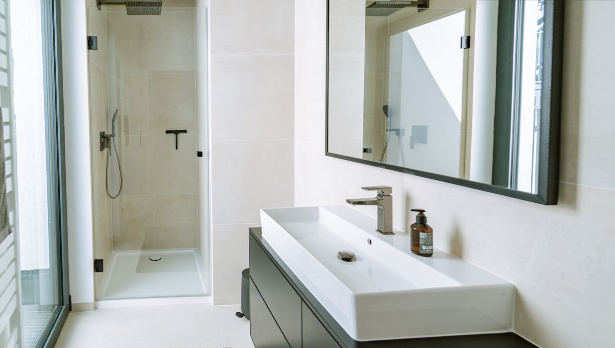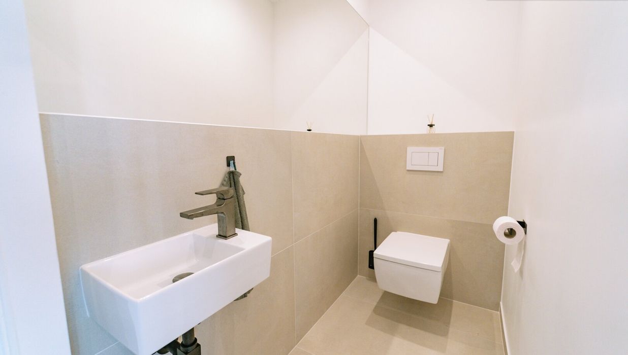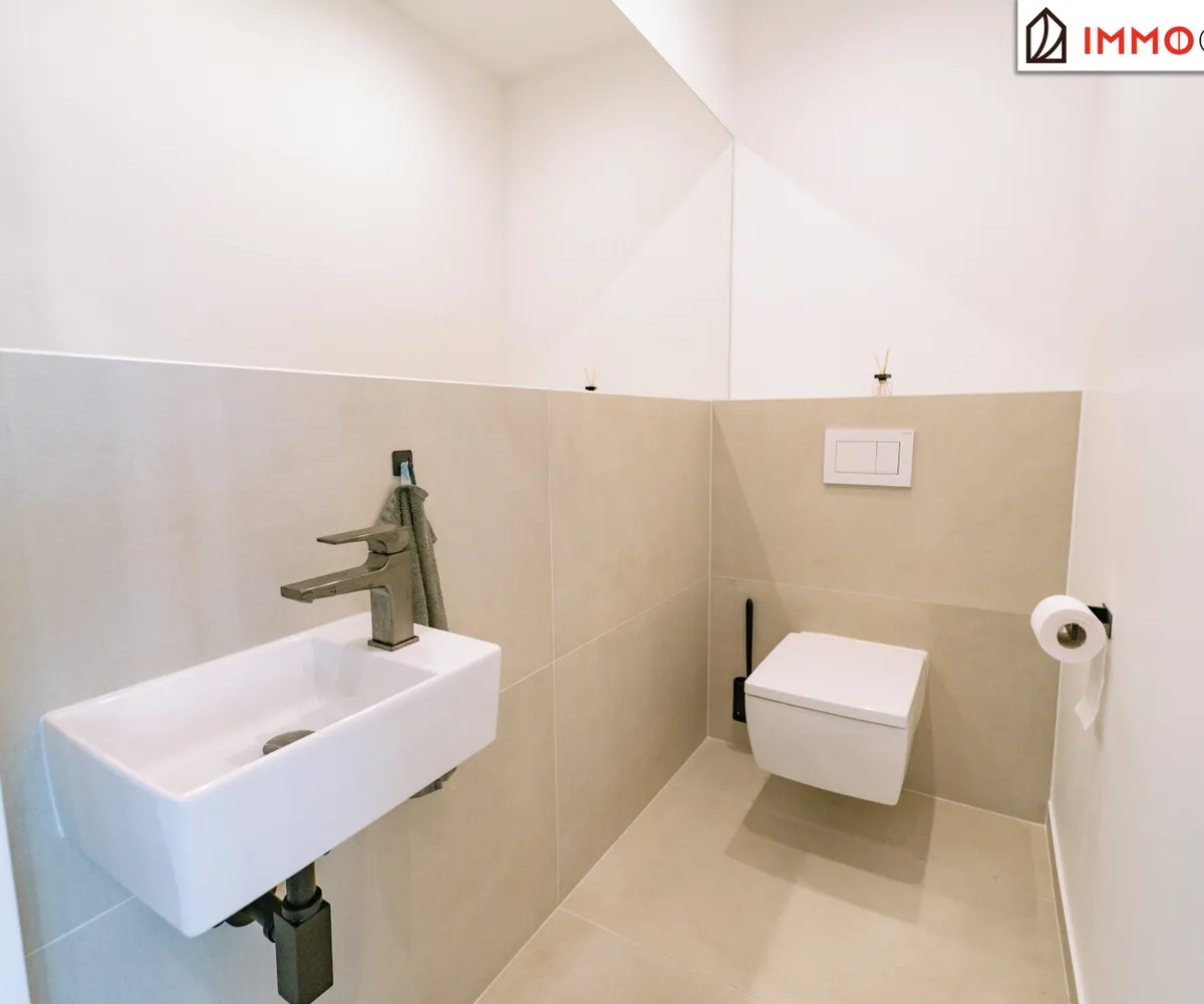 Zur Linken befinden sich ein edel ausgestattetes Gästebad mit Dusche, ein separates WC sowie ein praktischer Wasch- und Hauswirtschaftsraum - dezent integriert, hochwertig ausgeführt und mit Zugang zu einer eigenen Terrasse.