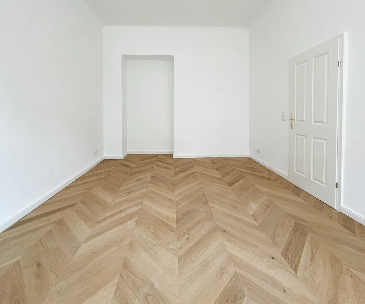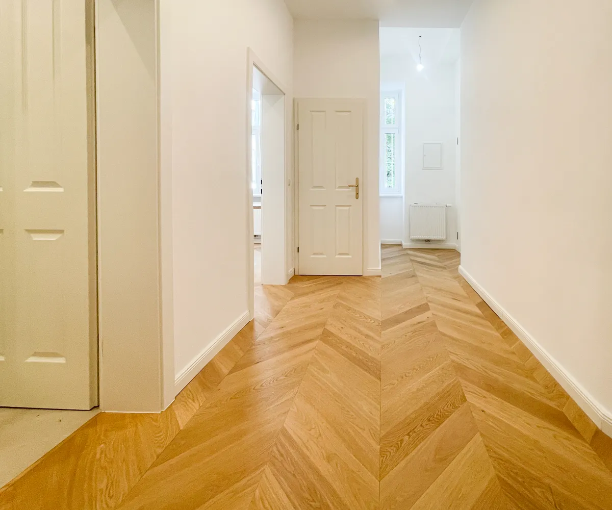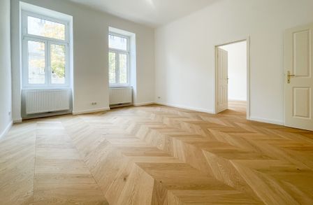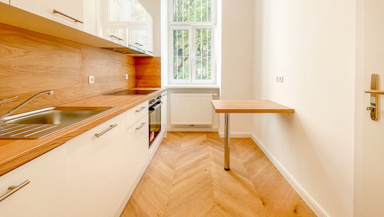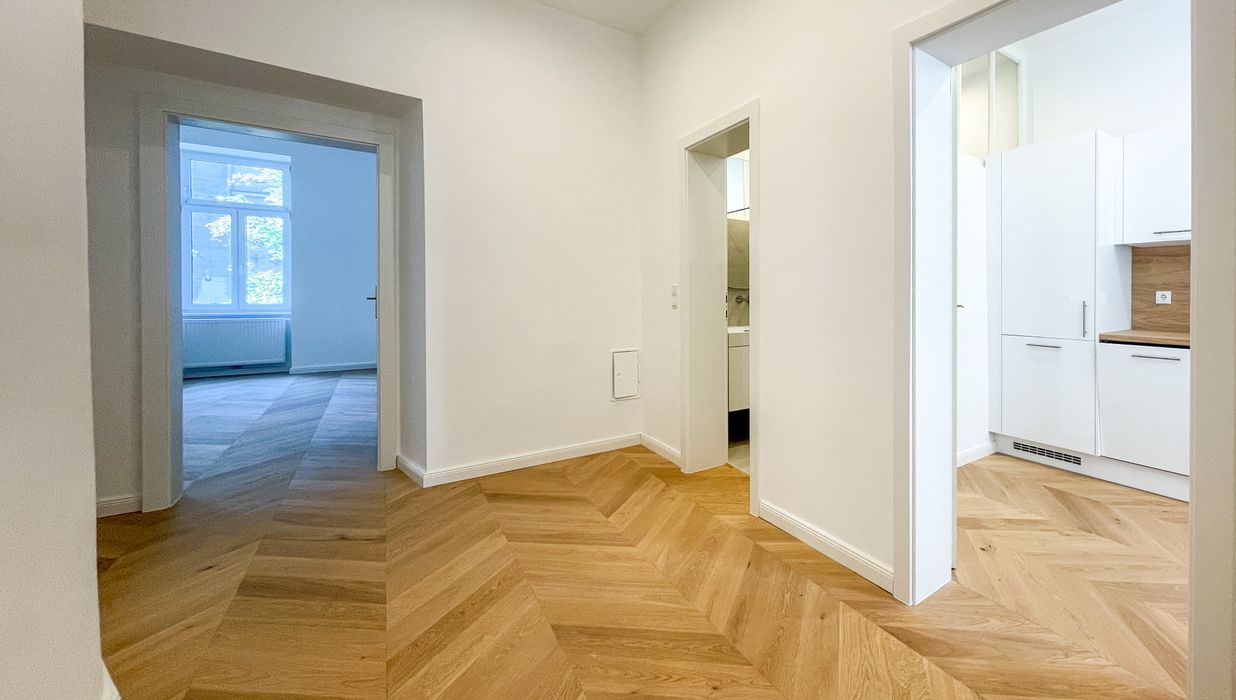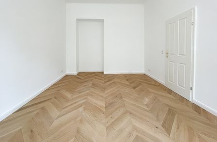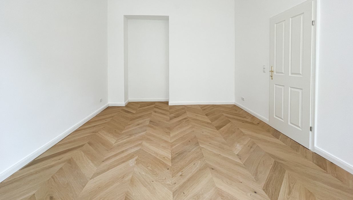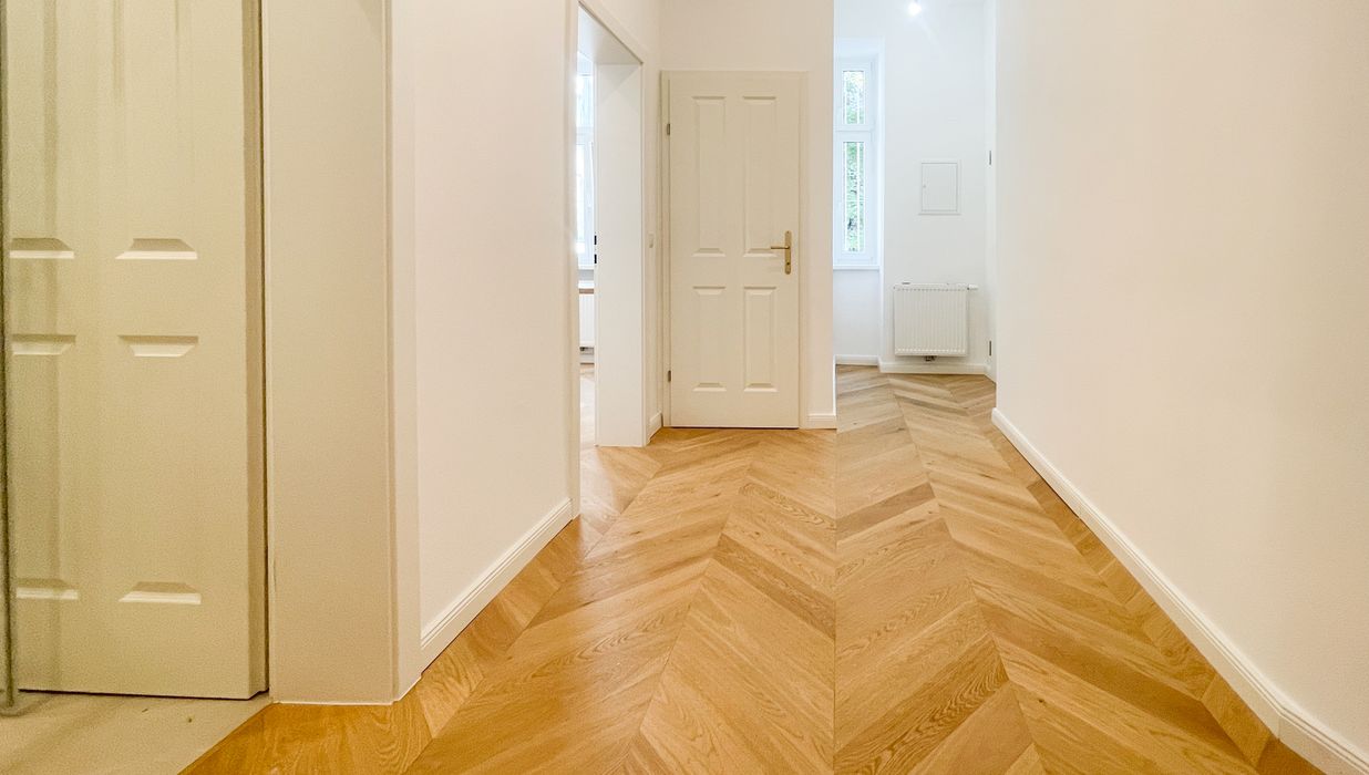 Derzeit entsteht eine stilvoll sanierte 2-Zimmer-Altbauwohnung mit separat neu ausgestatteter Küche inklusive Essgelegenheit. Hochwertiger Fischgrät-Parkettboden unterstreicht die gelungene Verbindung aus klassischer Eleganz und modernem Wohnkomfort.
