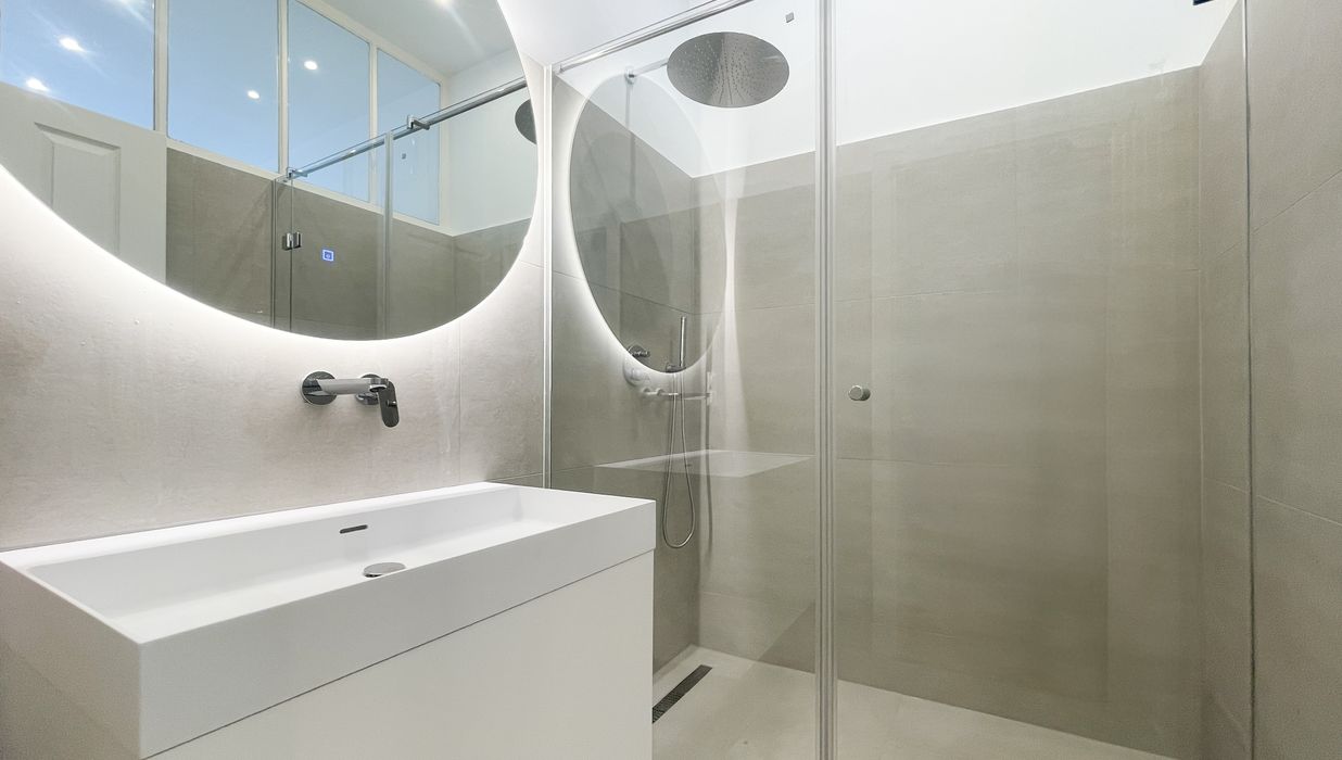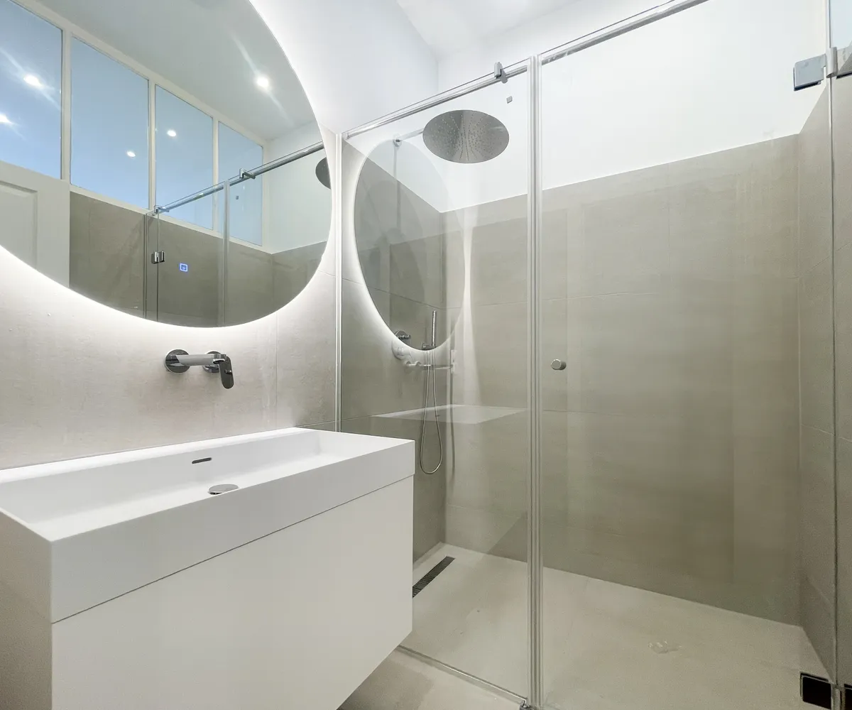 modernes Badezimmer mit bodenebener großer Dusche, beleuchtetem Spiegel, hochwertigen Armaturen sowie Oberlichte zur Küche (somit auch Tageslicht im Badezimmer)