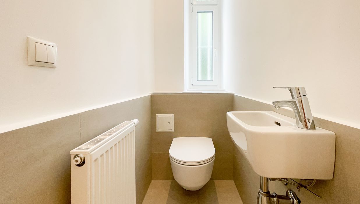 separates neues modernes WC mit Fenster und Handwaschbecken