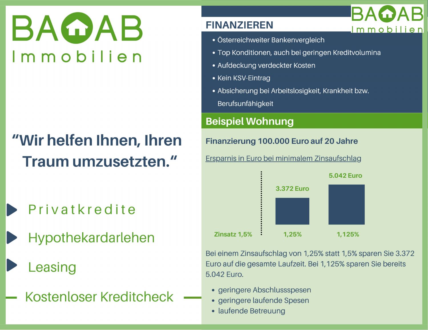 Bei jedem Kauf einer Immobilie oder eines Grundstücks ist es wichtig, die passende Finanzierung zu finden. Mit seiner eigenen Vertriebsorganisation ist Infina als Wohnbau-Finanz-Experte an über 100 Standorten in ganz Österreich vertreten und vermittelt Finanzierungen an über 150 Banken und Bausparkassen. Nutzen Sie unseren kostenlosen Kreditvergleich für den passenden Wohnkredit: