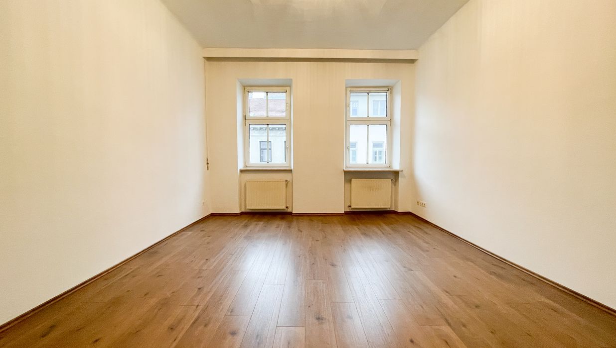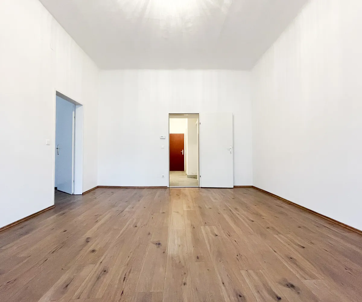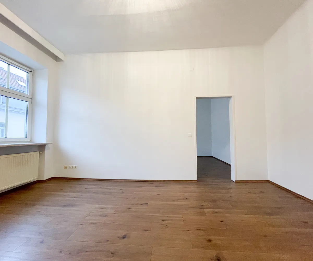 Zwei großzügige, nahezu quadratische Zimmer mit beeindruckenden, typischen Altbaudecken schaffen ein luftiges Wohngefühl und bieten vielseitige Nutzungsmöglichkeiten – ob als Wohn-, Schlaf- oder Arbeitszimmer. Die Ausrichtung Richtung Webergasse sorgt für eine freundliche Atmosphäre.
