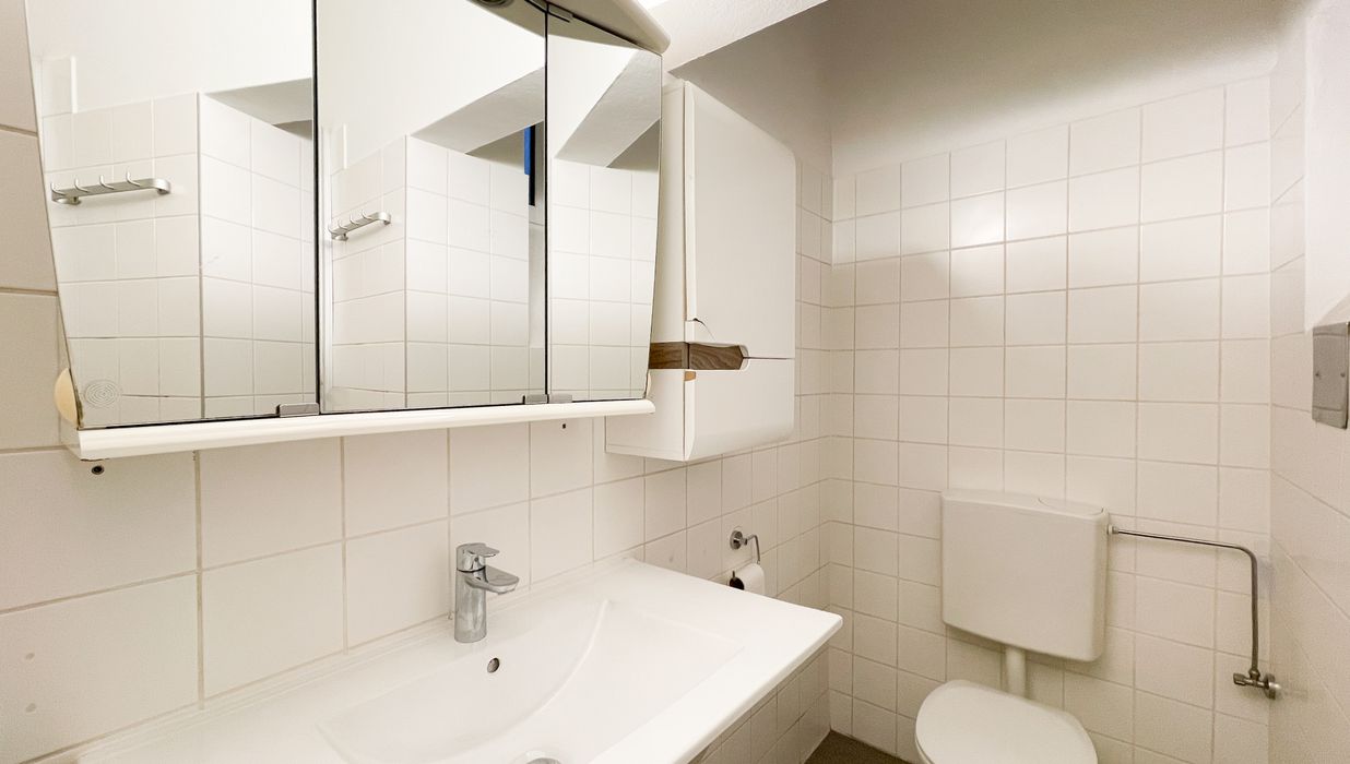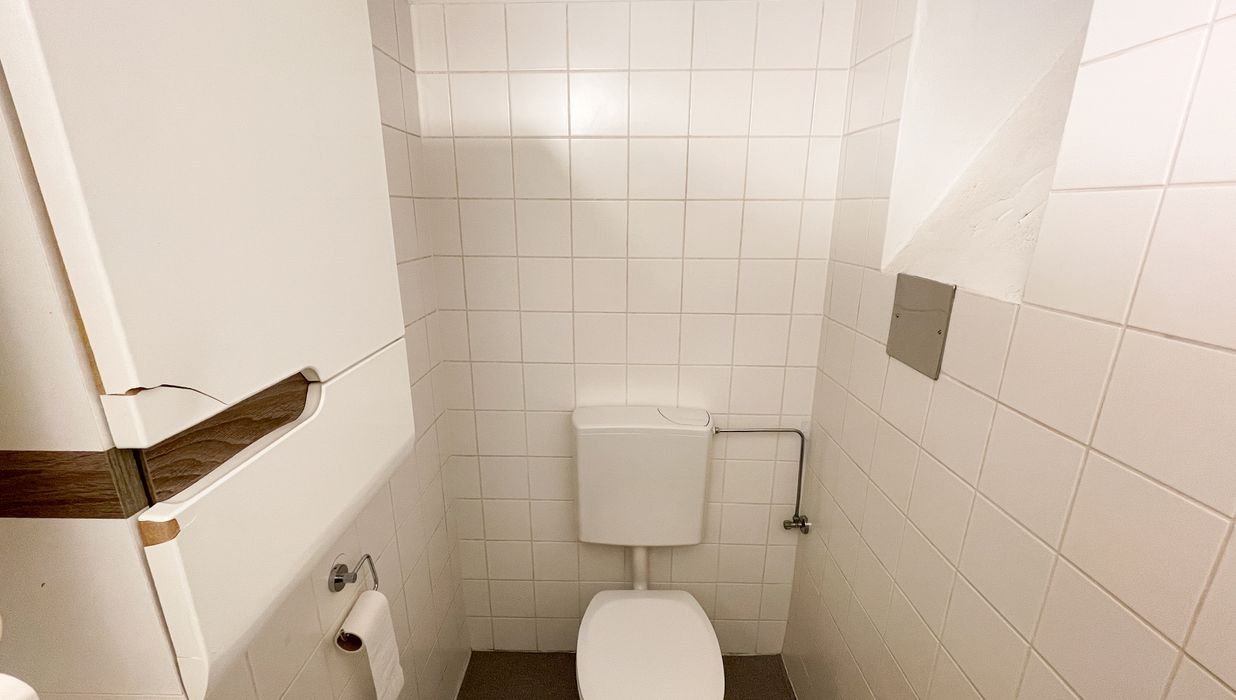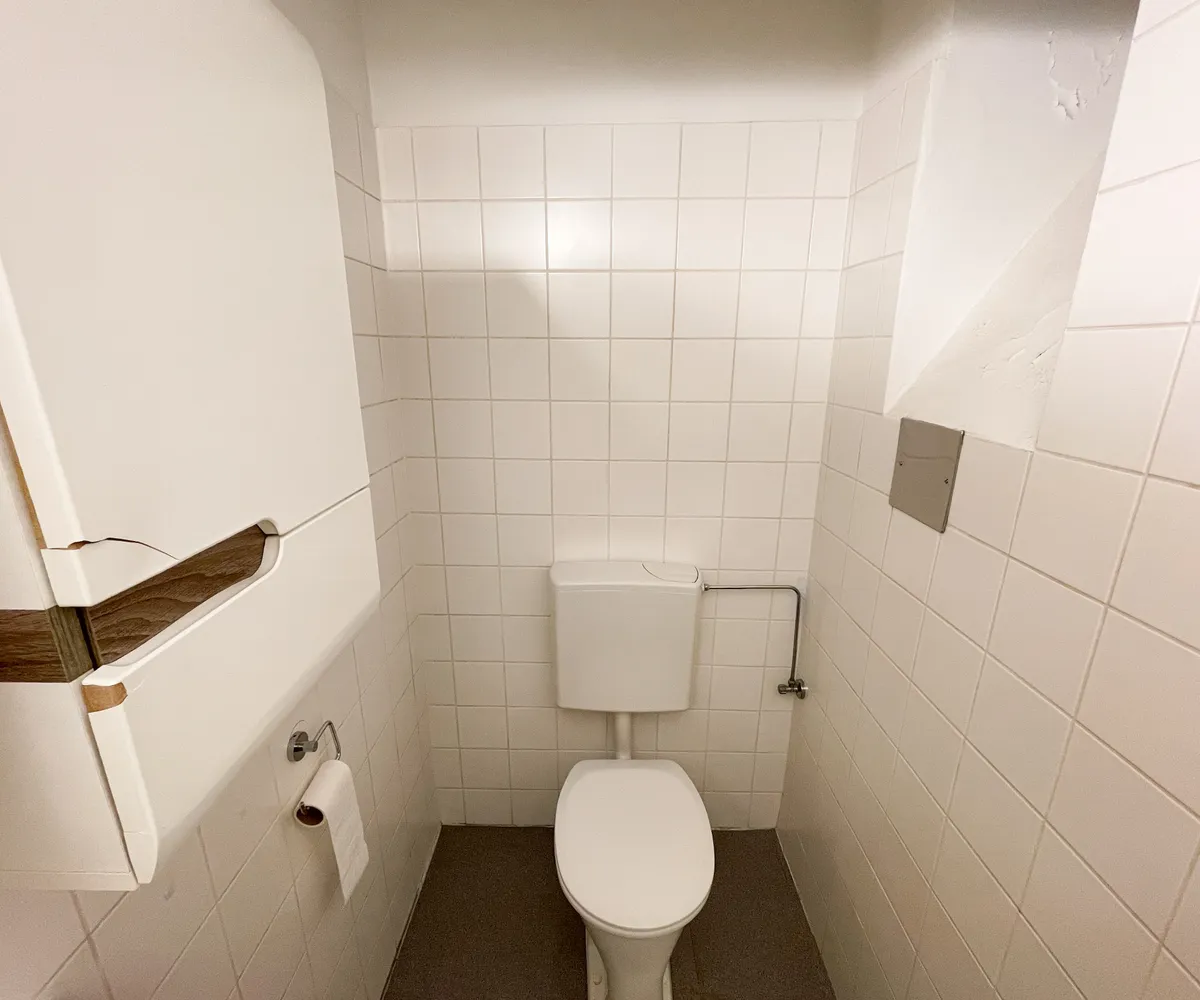 Das Badezimmer mit WC ist funktional gestaltet und verfügt über eine Dusche sowie ein Fenster zum Lichthof, das für angenehme natürliche Belüftung sorgt.