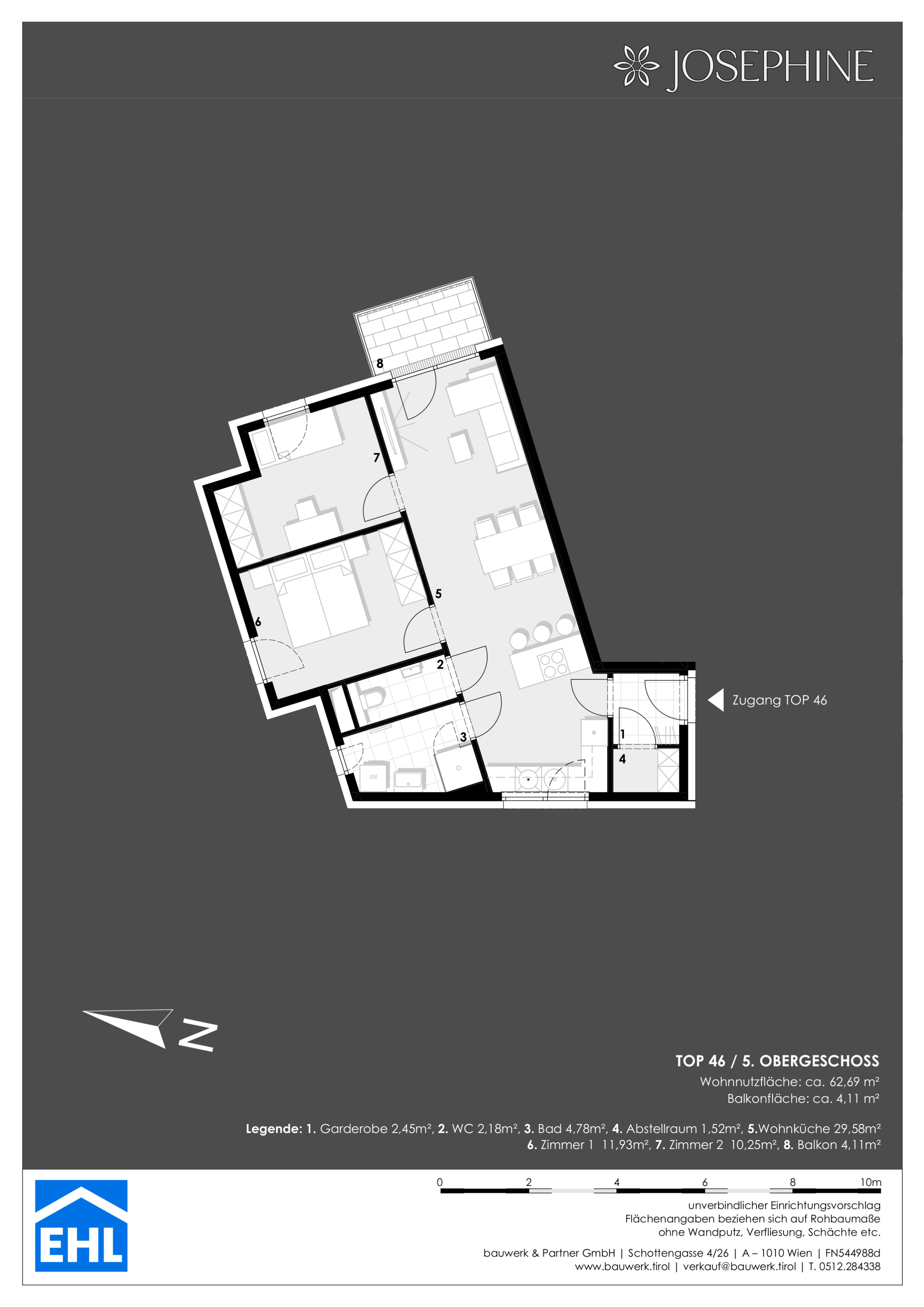 Die Ausstattung von "Josephine" setzt Maßstäbe in Sachen Komfort und Nachhaltigkeit. Diese Schwerpunkte der Planung spiegeln sich in einer energieeffizienten Wasser-Wasser-Wärmepumpe, Betonkernaktivierung bzw. Fußbodenheizung, Fenster mit 3-Scheiben Isolierverglasung und elektrischem Sonnenschutz eindeutig wider. In den Wohnungen schaffen edle Eichen-Parkettböden, hochwertiges Feinsteinzeug und elegante Sanitärausstattung ein angenehmes, einzigartiges Ambiente. Hier wird Ihr Wohntraum zur Realität.