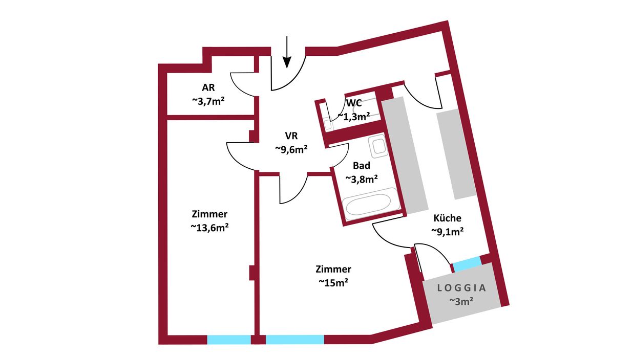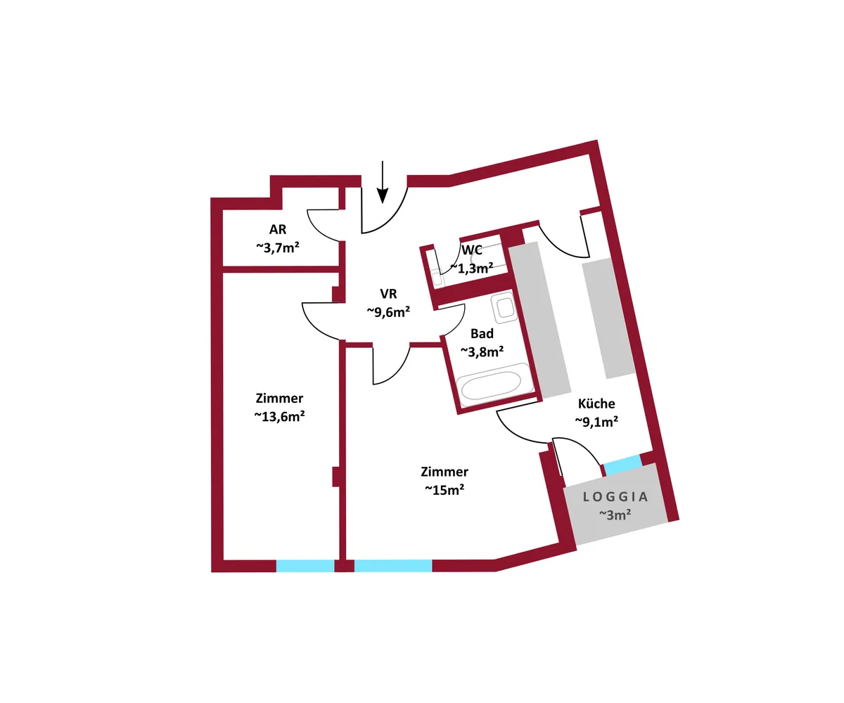 Die Wohnung bietet eine klare Raumaufteilung : vom Vorzimmer aus erreicht man den Abstellraum, das Bad, das separat gelegene WC sowie die Küche. Von dort gelangt man direkt auf die Loggia, ideal um warme Abende entspannt ausklingen zu lassen.