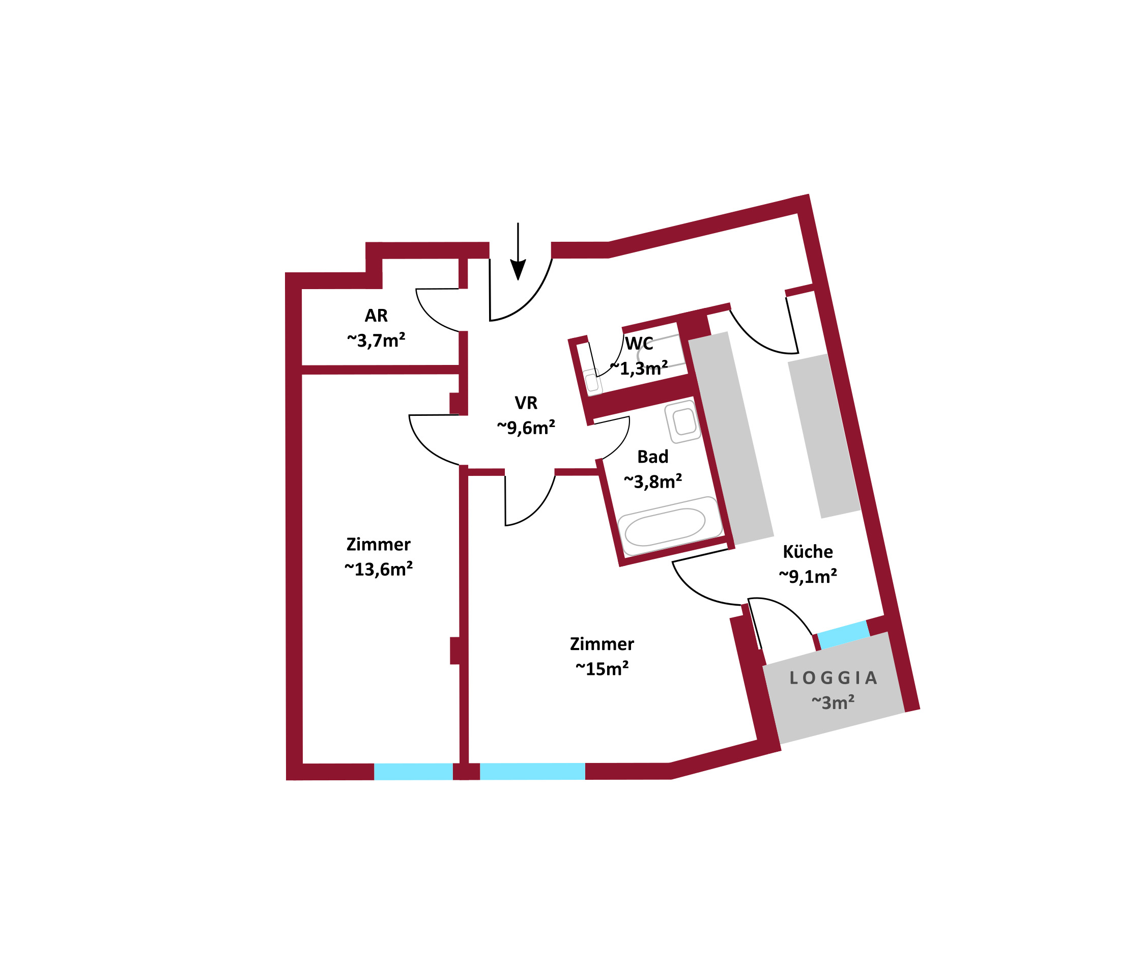Die Flächen der 2-Zimmer-Wohnung gliedern sich in: