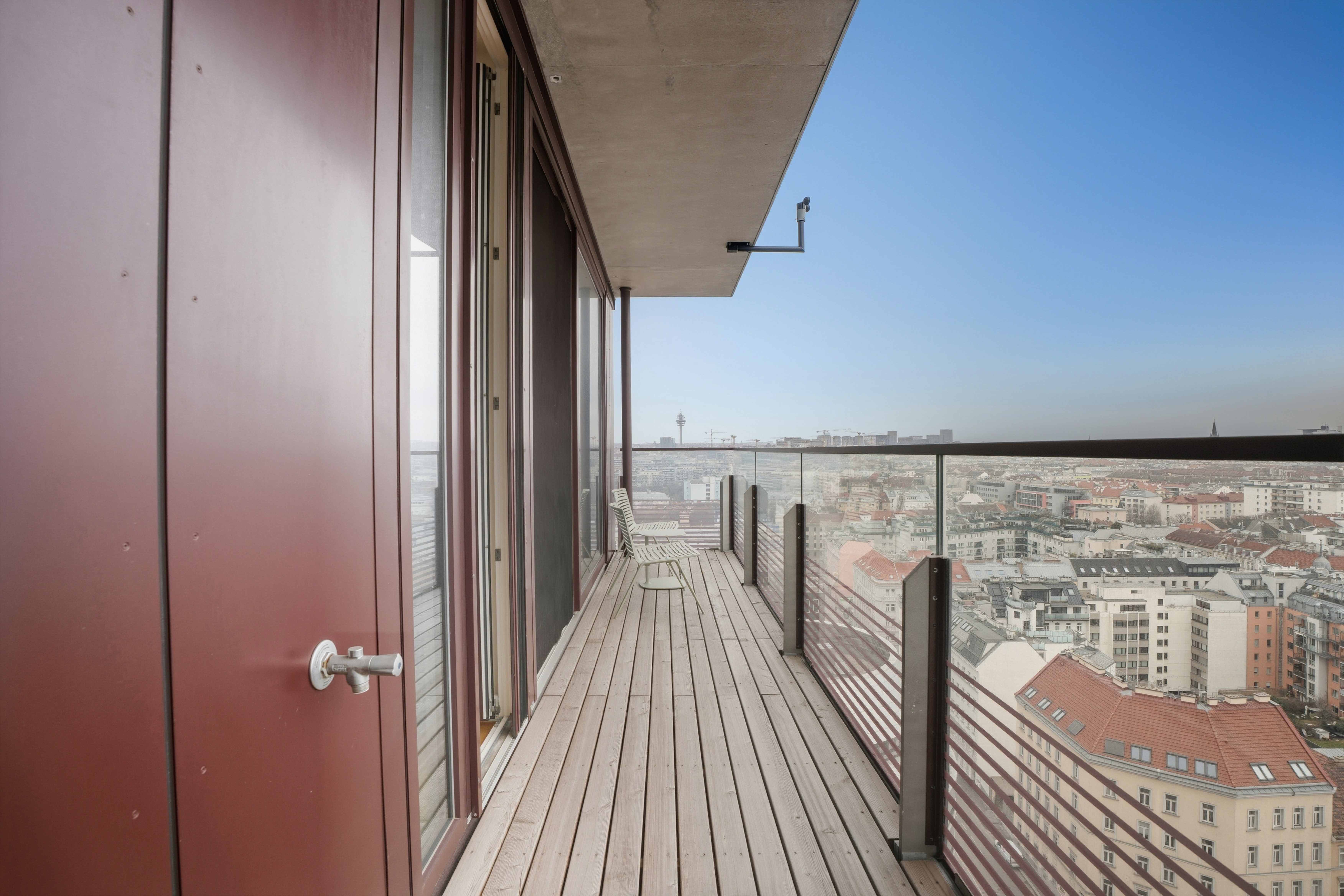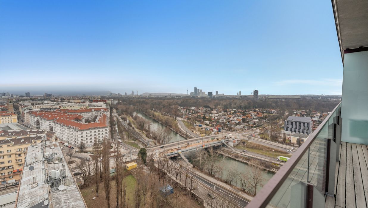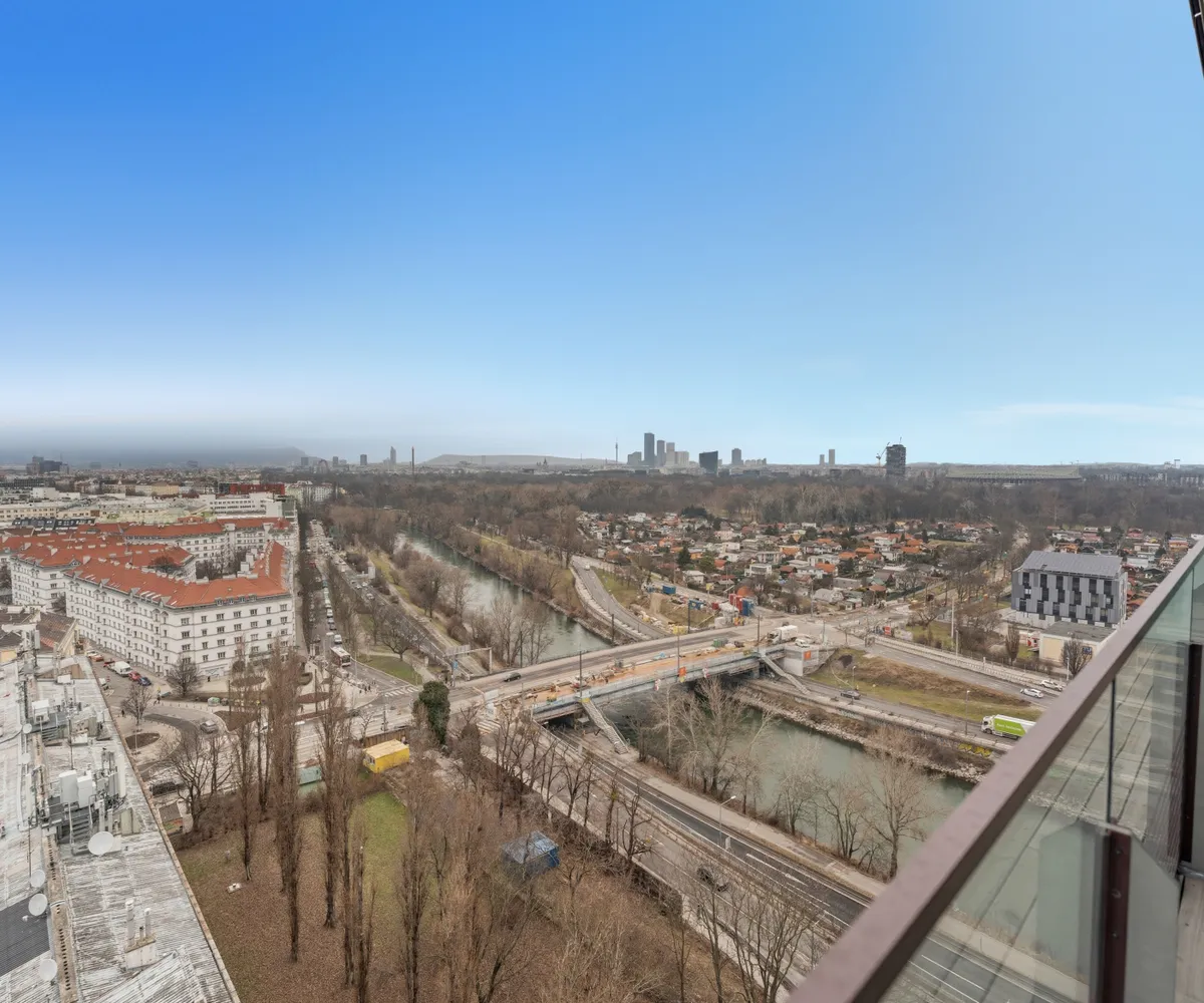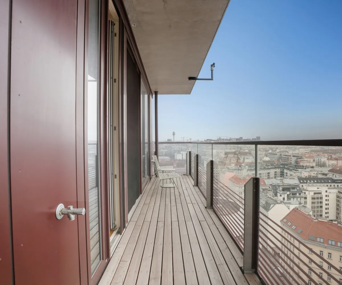 Lichtdurchflutet durch großzügige Fensterflächen eröffnet sie ein Panorama auf die Wiener Hausberge. Besonders in den Abendstunden, wenn die Sonne langsam hinter den Hügeln versinkt und den Himmel in warme Gold- und Rottöne taucht, entsteht ein beinahe magisches Schauspiel. Die großzügige Freifläche erweitert den Wohnraum ins Freie – perfekt für stille Momente über den Dächern der Stadt.