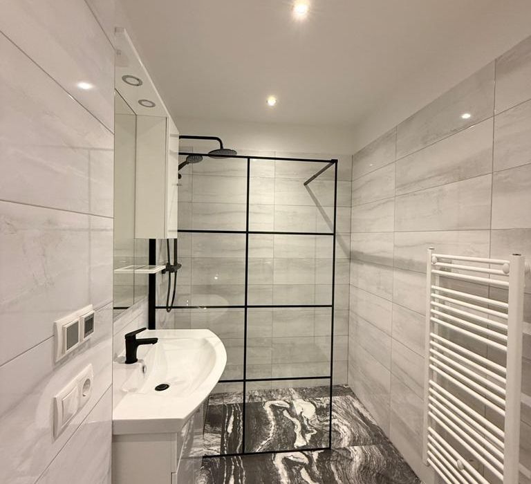 Hochwertige Ausstattung mit Eichen-Parkettboden als Landhausdiele und Feinsteinzeug in den Nassräumlichkeiten sowie im Vorzimmer.