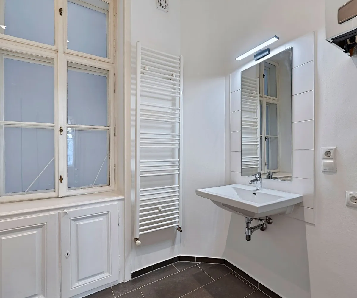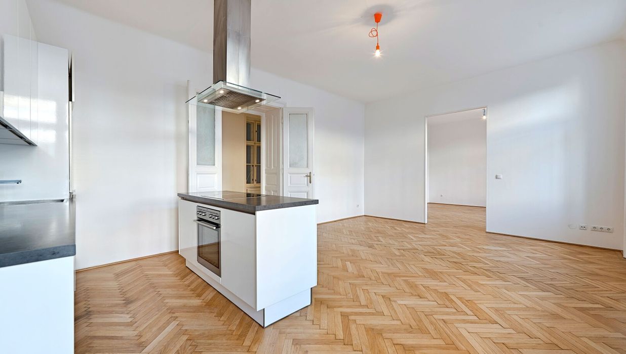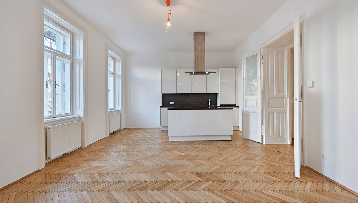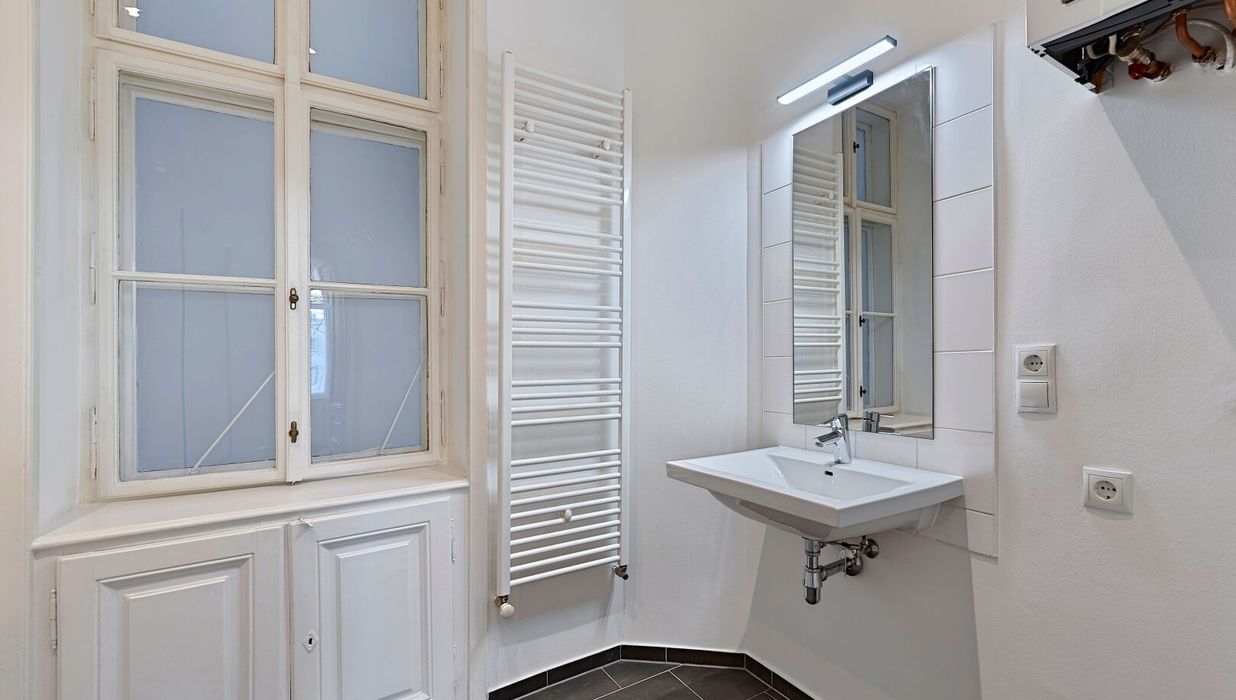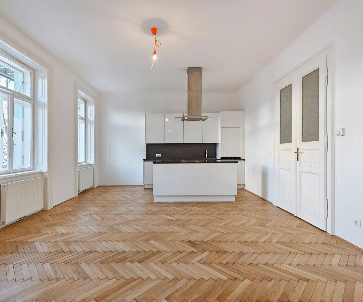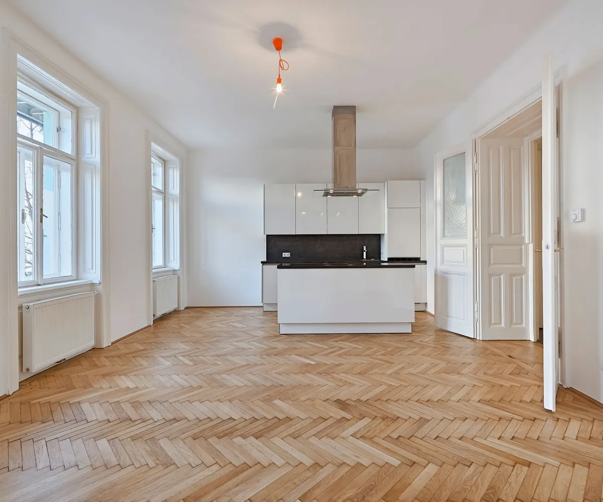 Im hinteren Trakt des Hauses im Mezzanin (1. Stock) gelegen, bietet Ihnen dies 2-Zimmer Wohnung neben einer fantastischen Wohnküche über ein großes Schlafzimmer mit direktem Zugang ins Badezimmer, einen Vorraum sowie ein separates WC.