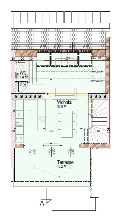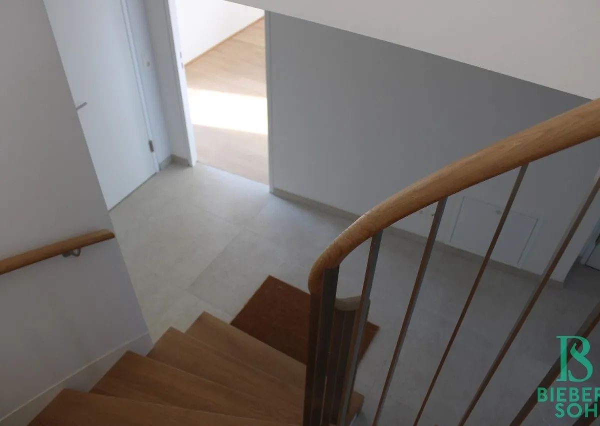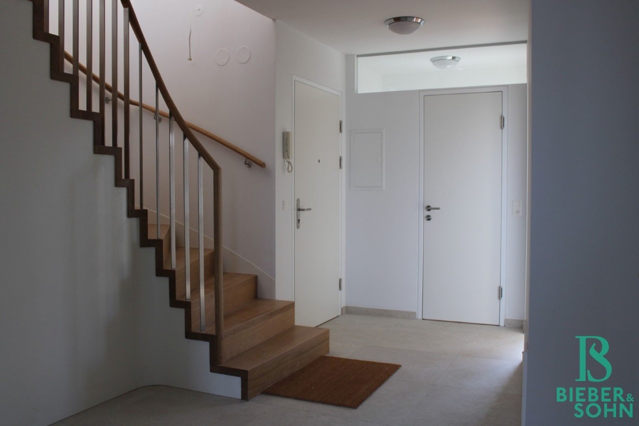 Vom Eingangsbereich aus sind 2 Schlafzimmer mit Ausgang auf die Terrasse, ein weiteres Zimmer mit Südbalkon, das Bad mit Wanne, ein separates WC, ein Abstellraum und der Aufgang in das Obergeschoss zu erreichen. Der geräumige und lichtdurchflutete Ess-/Küchenbereich mit Ausgang auf die großzügige, ca. 16m² große Südterrasse und das offen gehaltene Wohnzimmer befinden sich im Dachgeschoss sowie ein separates Gäste-WC.