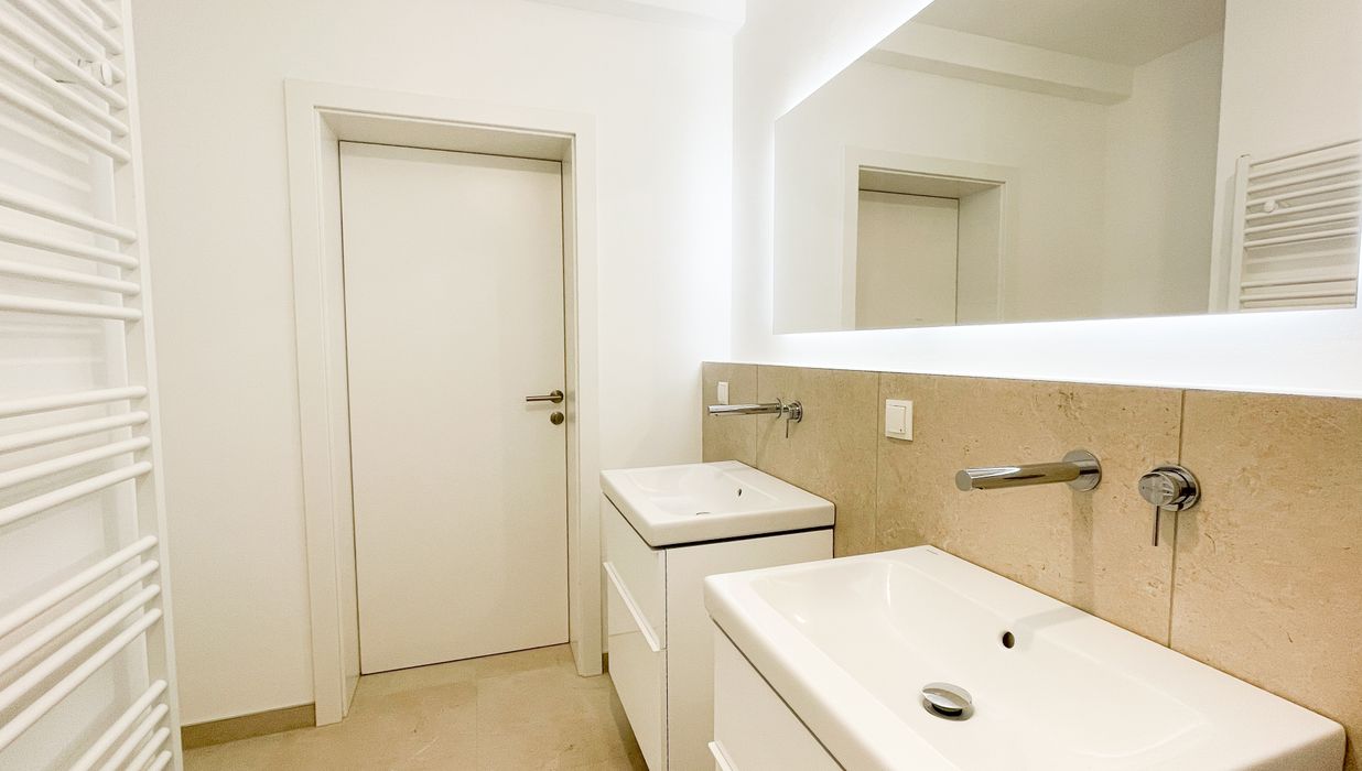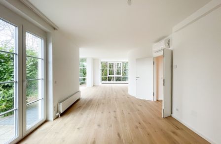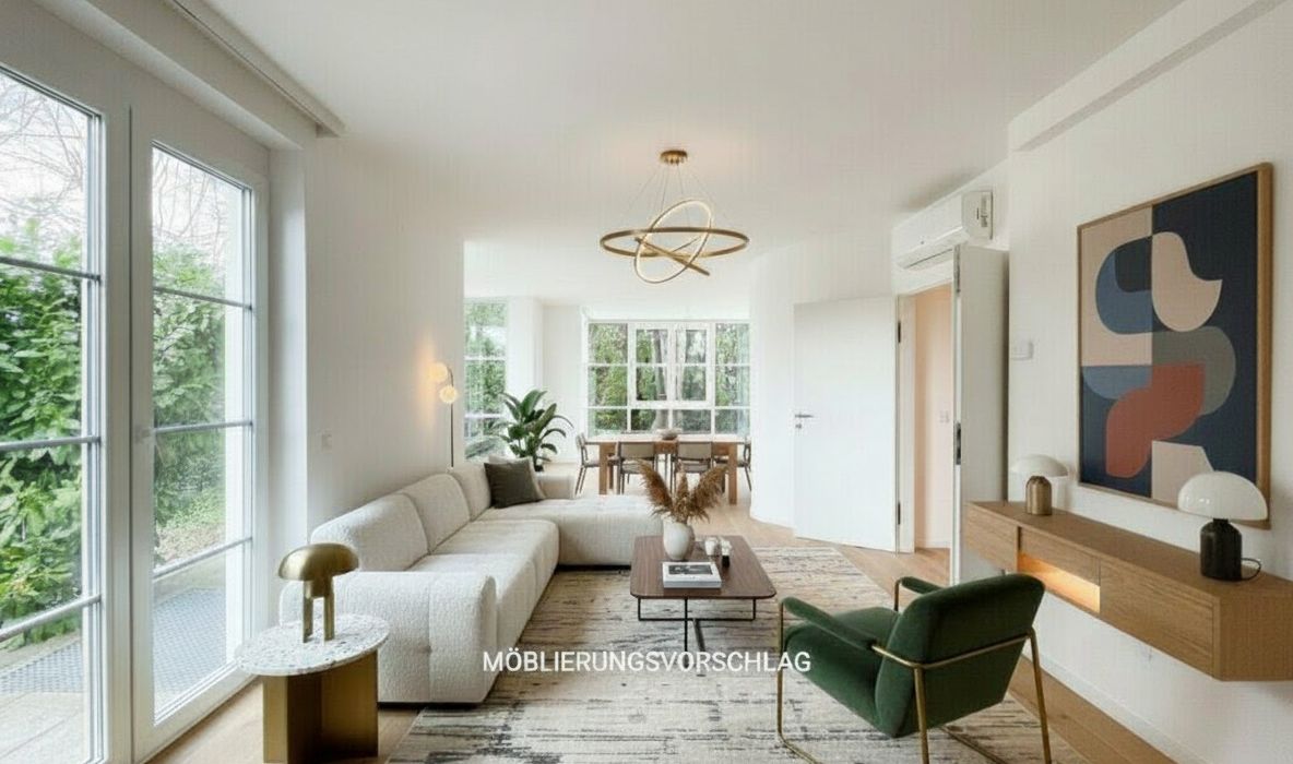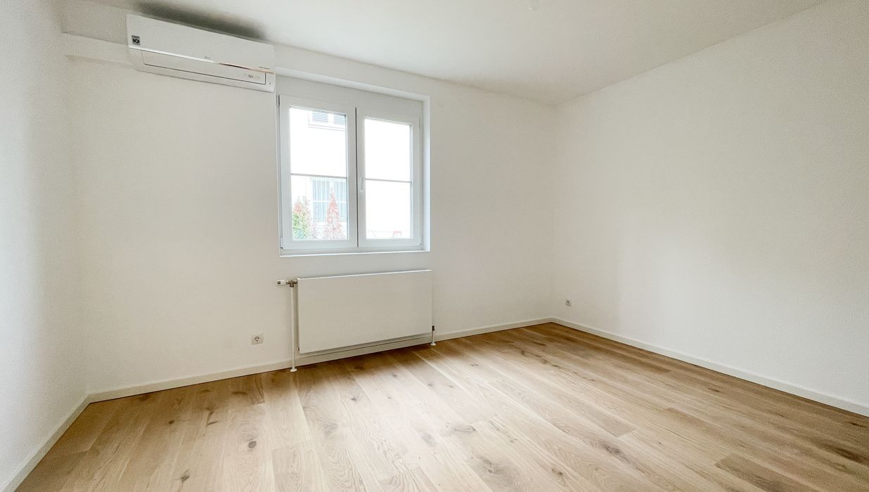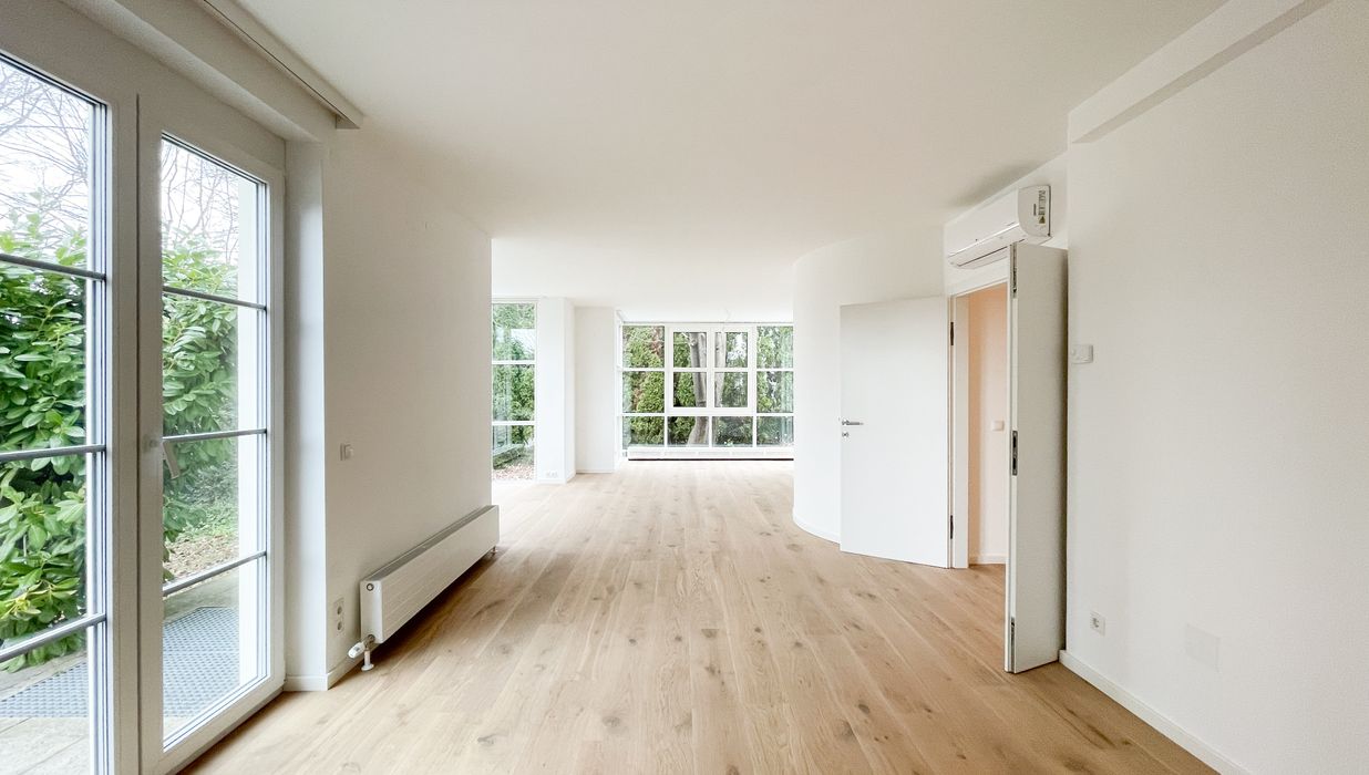 Diese klimatisierte generalsanierte Gartenwohnung mit rund 164,22 m² Gesamtnutzfläche (= 103,19 m² Wohnfläche plus 61,03 m² Kellerfläche) vereint Großzügigkeit, modernes Design und höchste Wohnqualität. Die Wohnung erstreckt sich über zwei Ebenen (Erdgeschoss und Kellergeschoss) und bietet insgesamt 3 Zimmer plus 2 Abstellräume mit Fenstern im Keller . Der Keller bietet genug Stauraum mit einem eigenen Wirtschaftsraum mit Waschmaschinen-Anschluss und Technik. Zusätzlich gibt es im Keller auch noch ein Badezimmer mit WC, Duschen und Waschbecken.