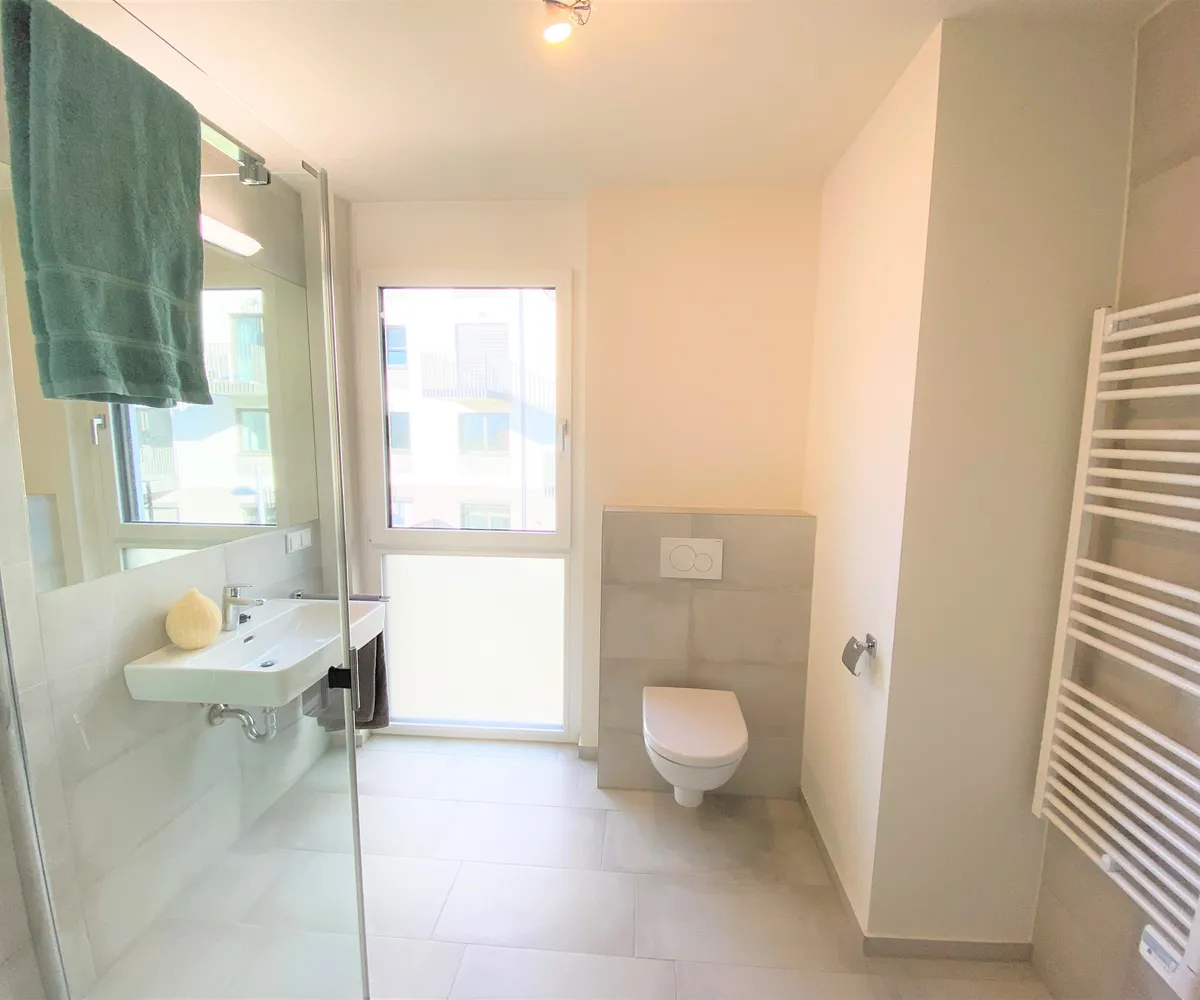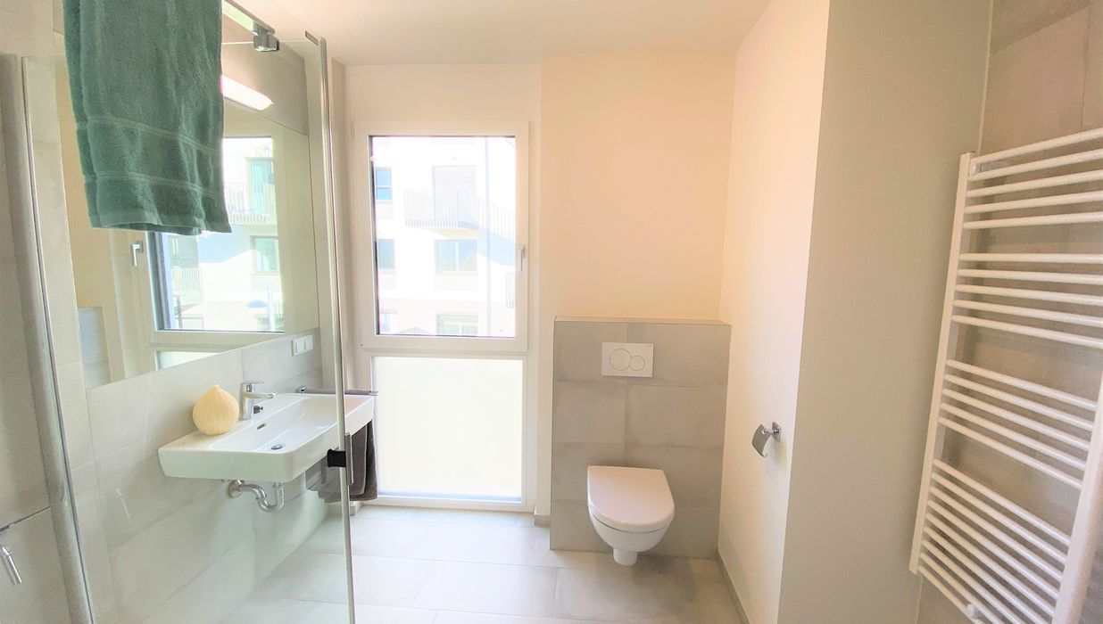 Gehobenen Wohnkomfort schaffen die hochwertigen Parkettböden, eine Fernwärme-Fußbodenheizung und modernste in Feinstein gehaltene Sanitärbereiche.