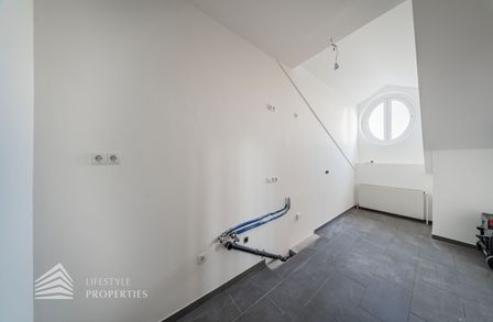 Sie betreten die Wohnung und befinden sich im Entrée. Gleich rechts gelangen Sie in den ca. 47 m² großen und hellen Salon, der genügend Platz für einen großen Esstisch und eine gemütliche Sitzecke bietet. Vom Wohnraum gelangend Sie in die ca. 17 m² große Küche, wo man durch eine kleine Trennwand auch sehr gut eine Speis bzw. einen Abstellraum einplanen könnte. Vom Wohnraum gelangen Sie über eine Treppe zu einem Vorraum der Sie in das große Schlafzimmer mit wunderschönem Ausblick führt. Außerdem befindet sich hier das Bad, welches mit einer Badewanne, einem Waschbecken und einem WC ausgestattet ist.