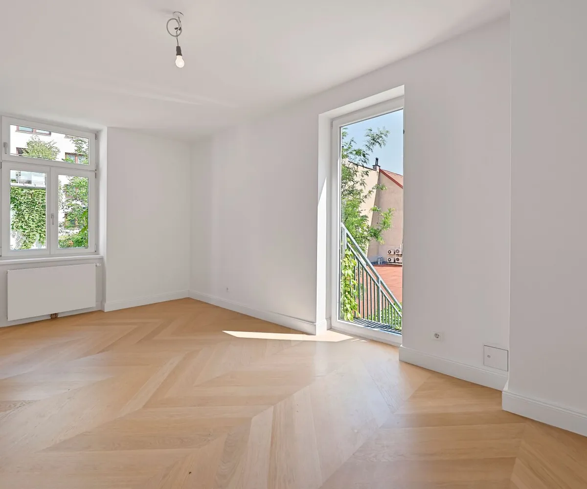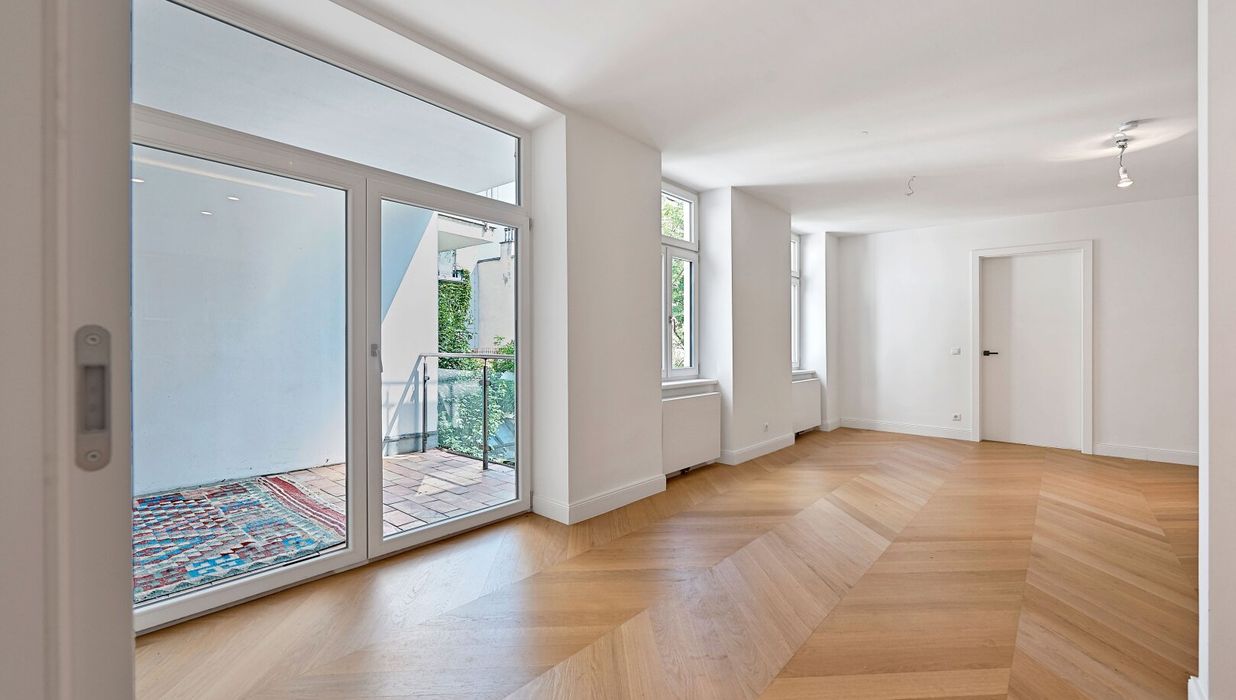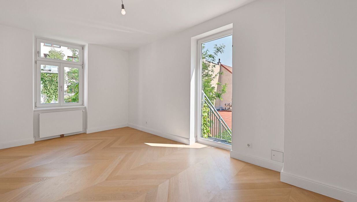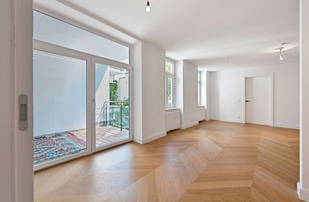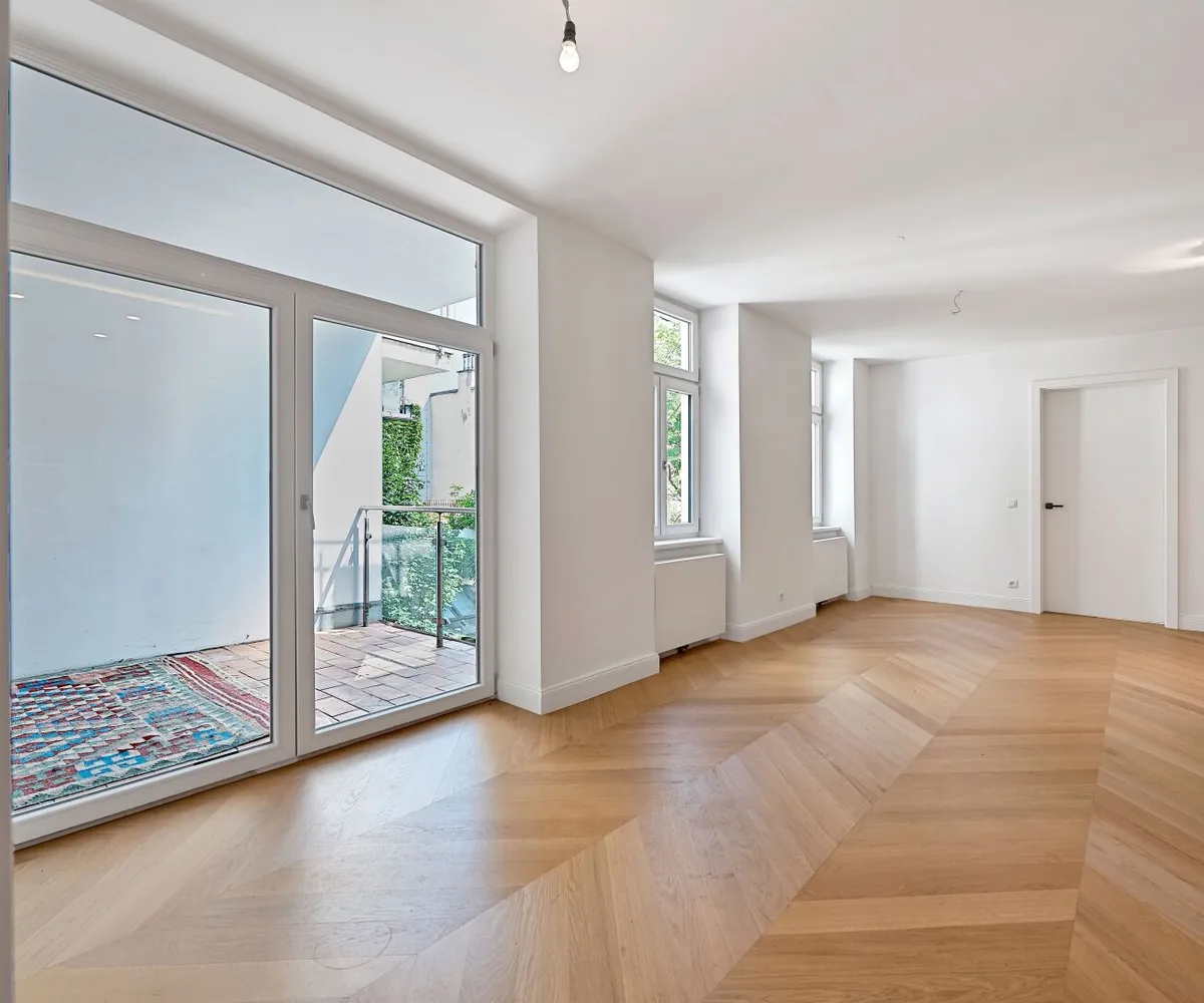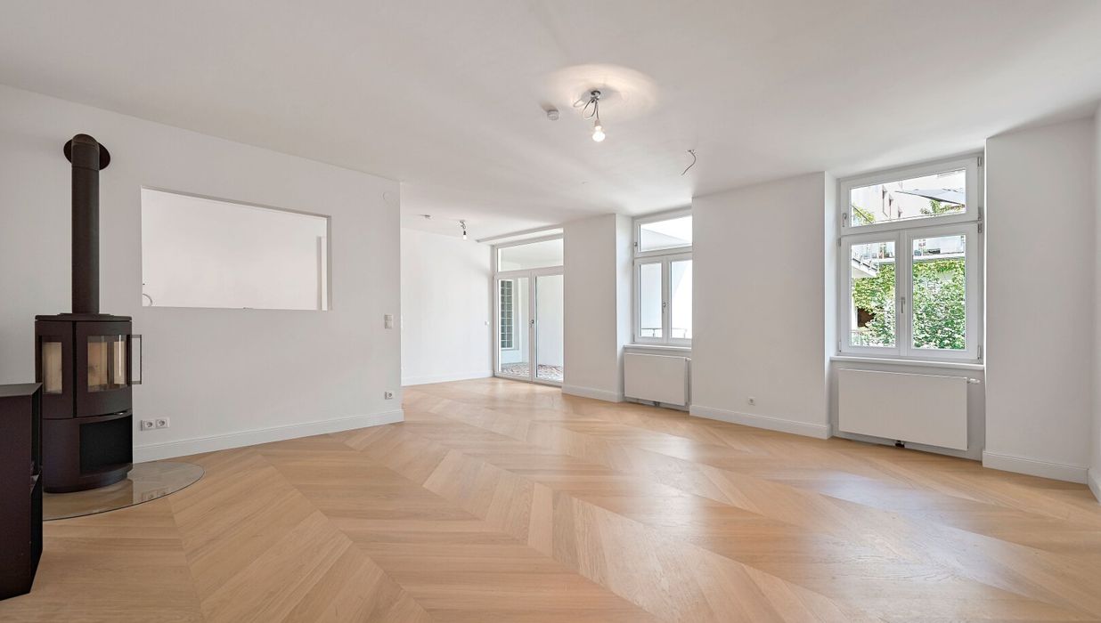 Die Wohnung wurde kürzlich einer umfassenden Generalsanierung unterzogen, wobei größter Wert auf eine gelungene Kombination aus Stil-Altbau-Elementen und Moderne auf höchstem Niveau gelegt wurde. So wurde im gesamten Wohnbereich ein hochwertiger Eichen-Fischgrät-Parkettboden verlegt und die Nassräume mit Feinsteinzug von schlichter Eleganz und stylisch anmutenden Armaturen versehen.