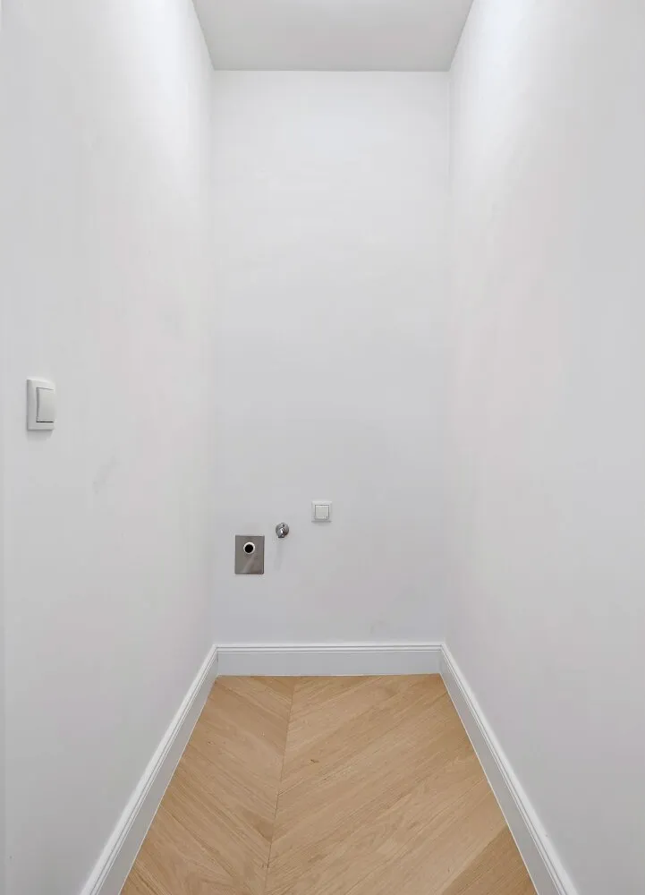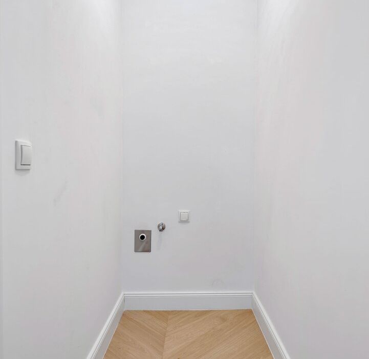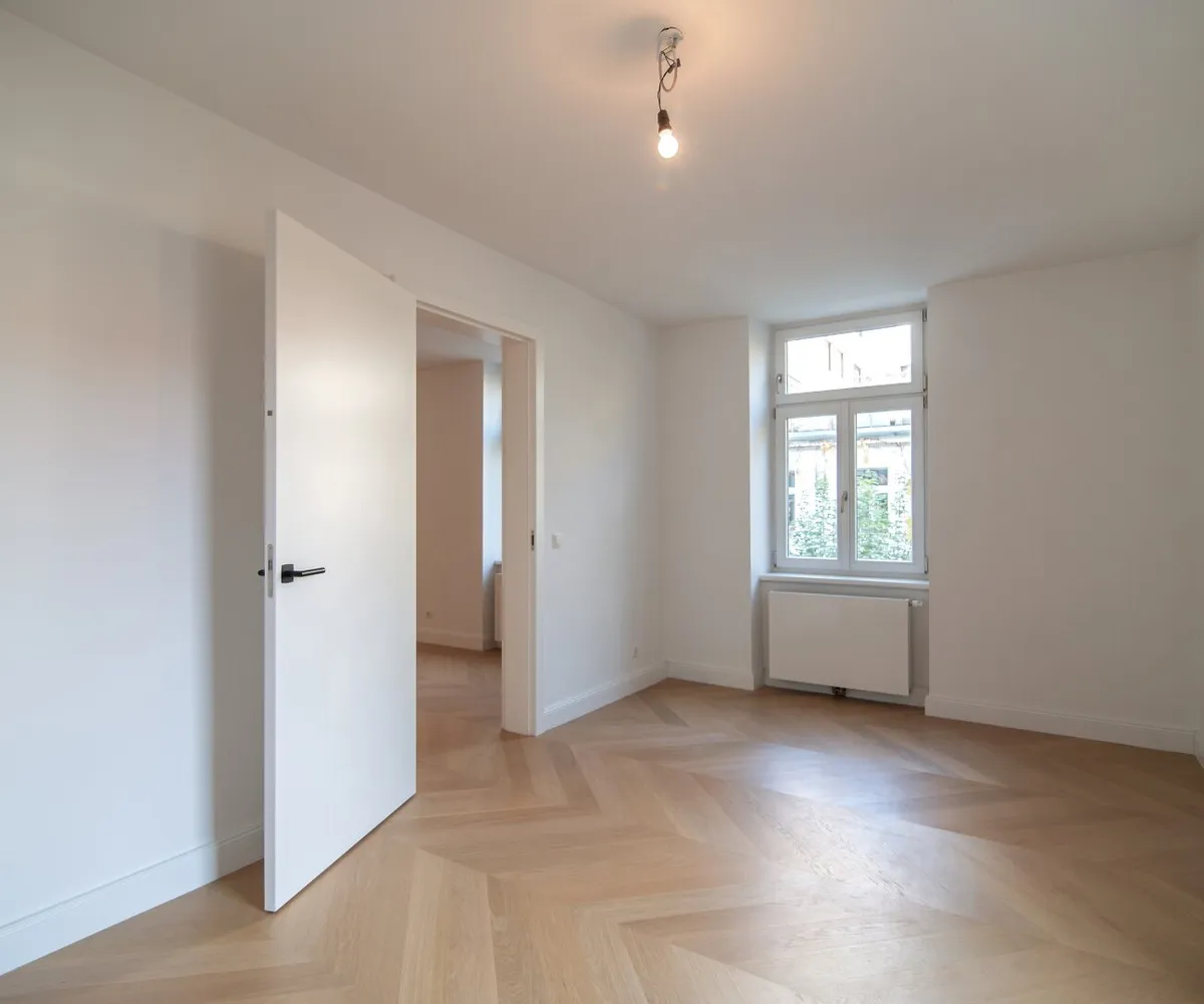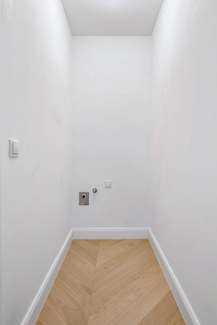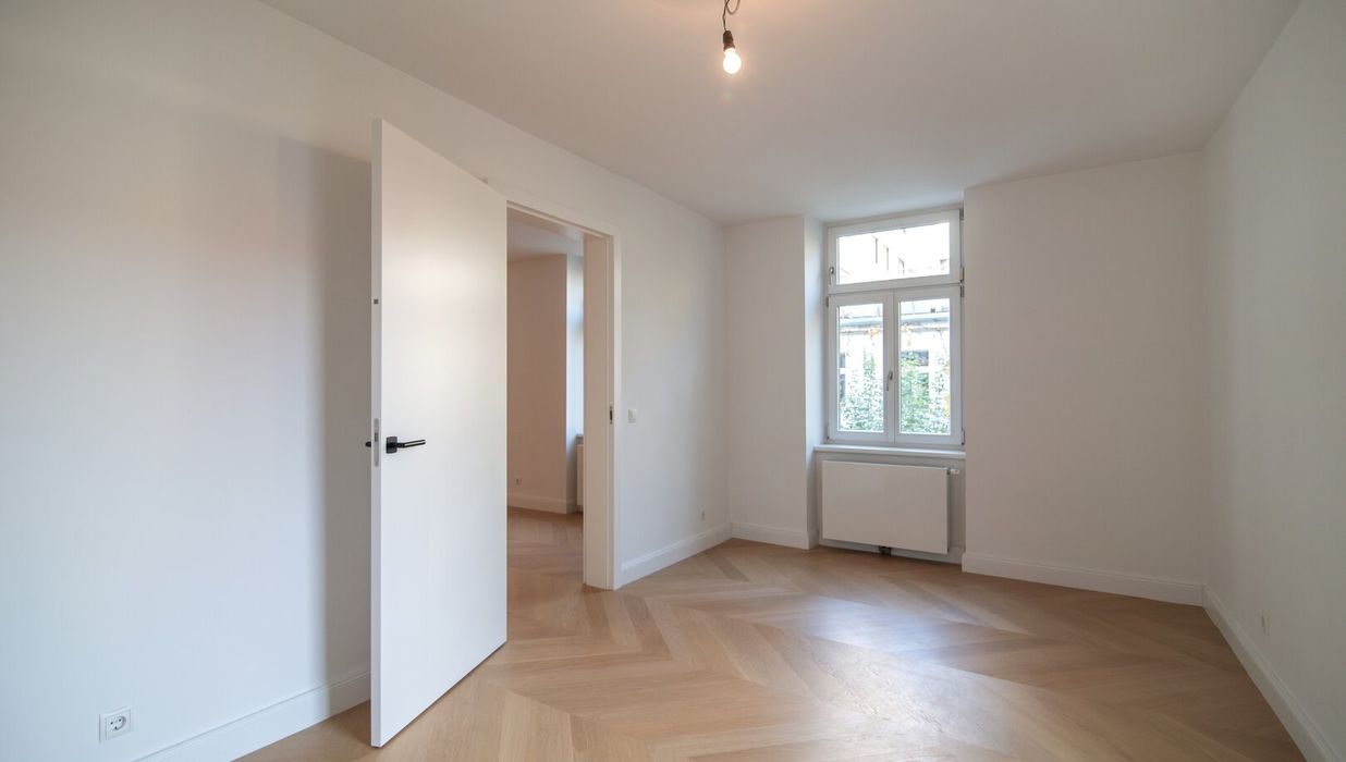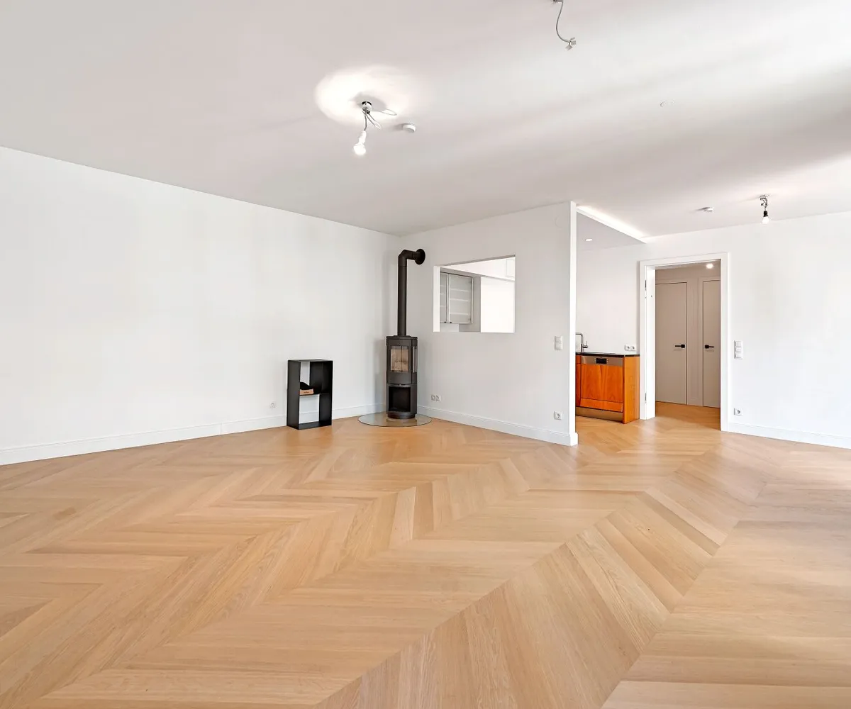 Die Wohnung wurde kürzlich einer umfassenden Generalsanierung unterzogen, wobei größter Wert auf eine gelungene Kombination aus Stil-Altbau-Elementen und Moderne auf höchstem Niveau gelegt wurde. So wurde im gesamten Wohnbereich ein hochwertiger Eichen-Fischgrät-Parkettboden verlegt und die Nassräume mit Feinsteinzug von schlichter Eleganz und stylisch anmutenden Armaturen versehen.