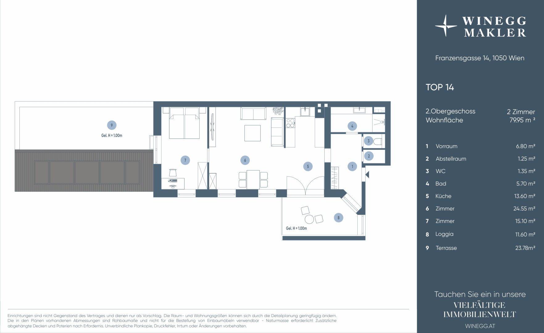 Die verkaufsgegenständliche Wohnung befindet sich im 2. Liftstock und verfügt über eine Wohnnutzfläche von ca. 80 m² (inkl. Loggia) sowie eine Terrasse im Ausmaß von ca. 23 m² .